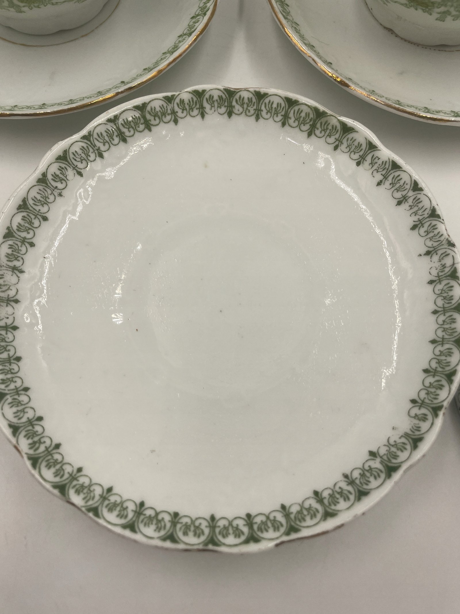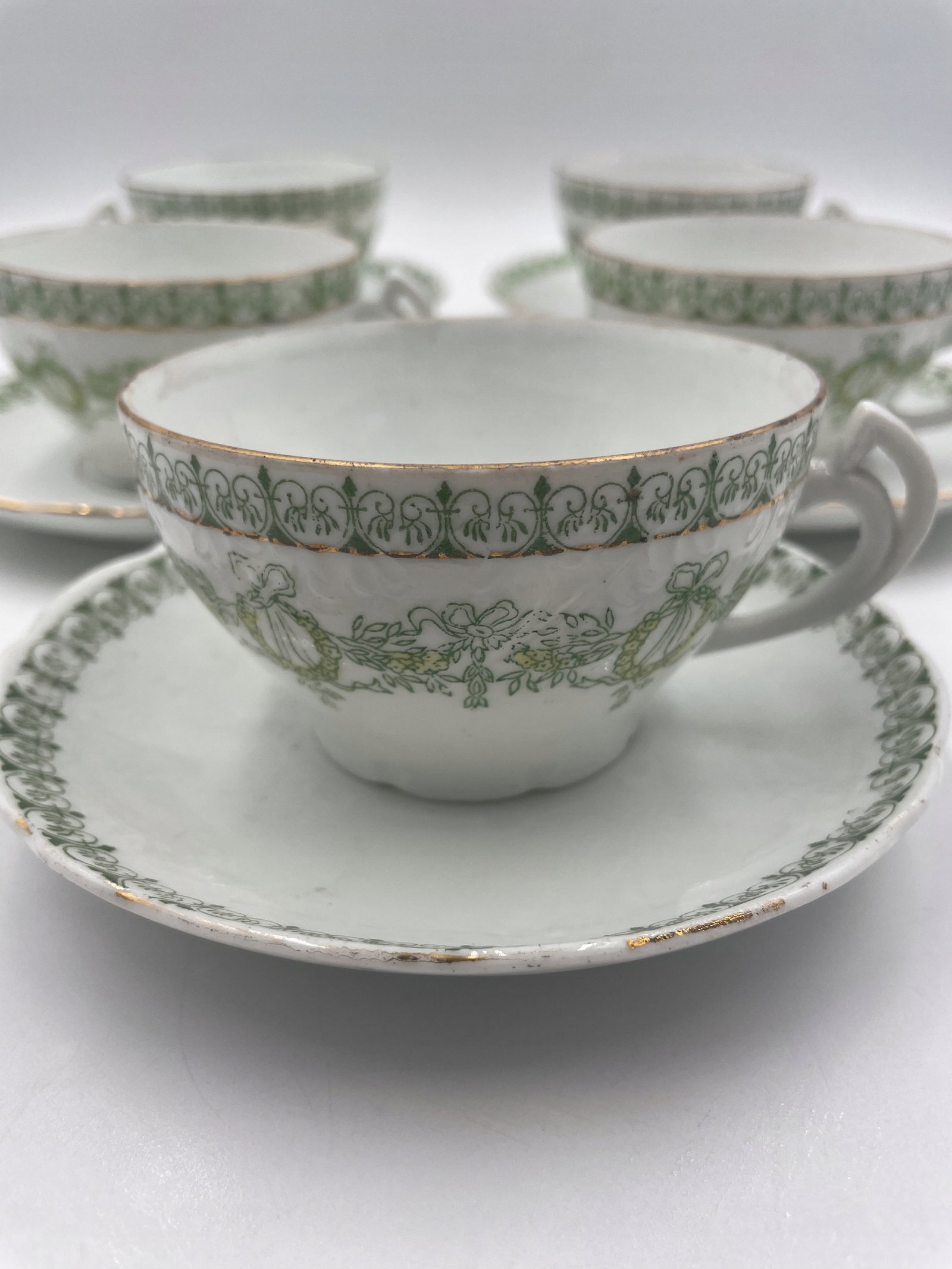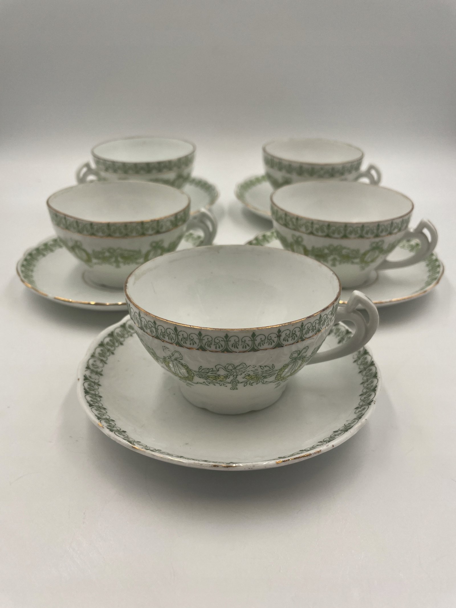 Zestaw filiżanek ze spodkami porcelanowy biało-zielony 5 osób vintage