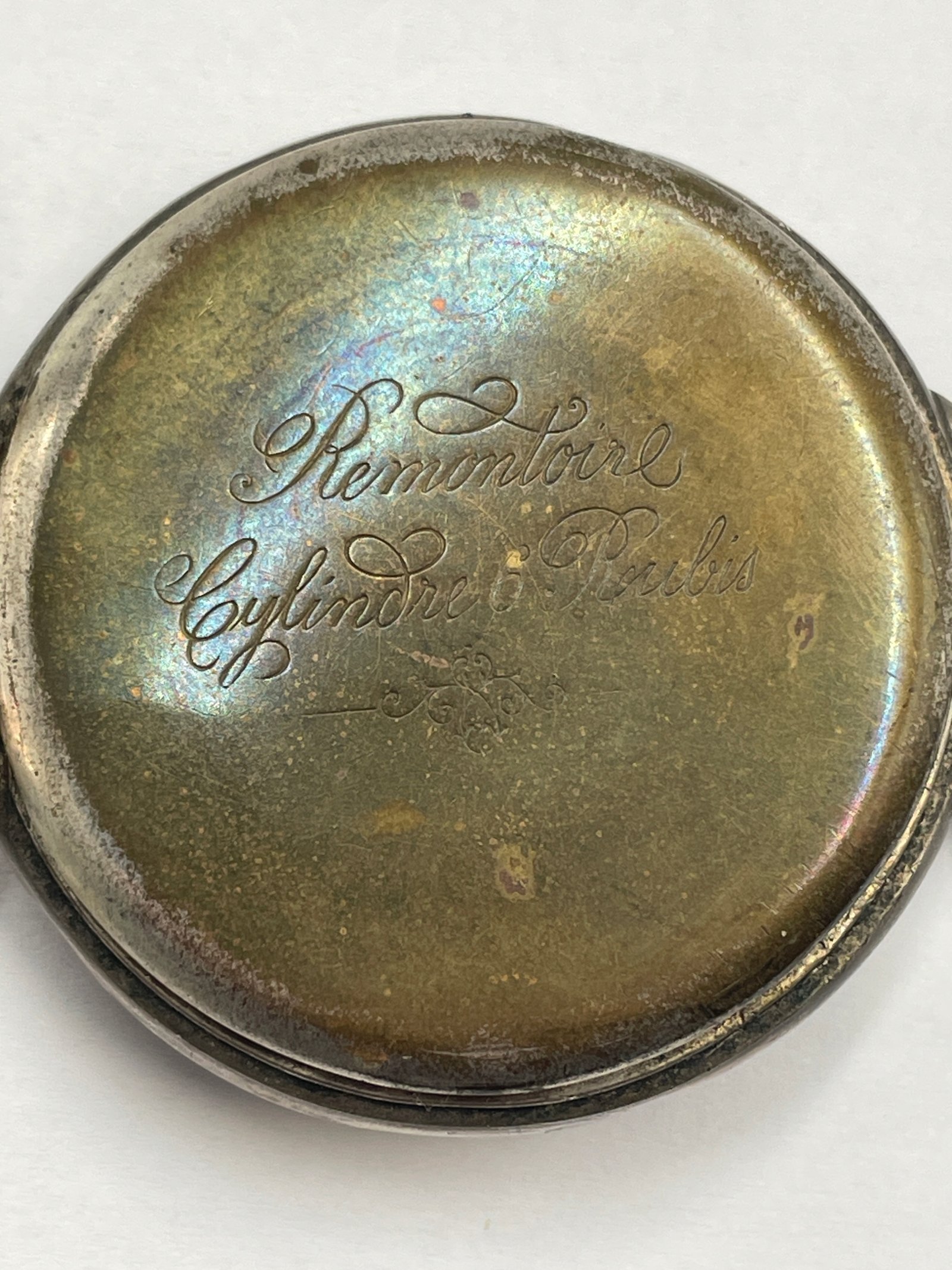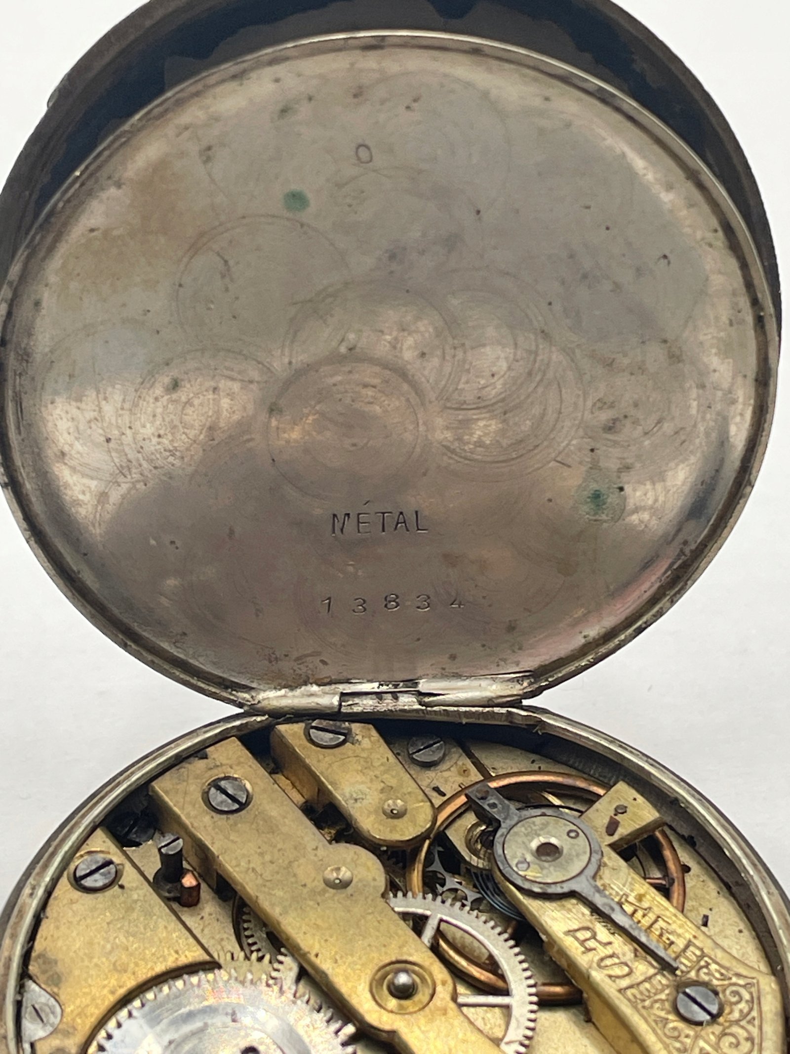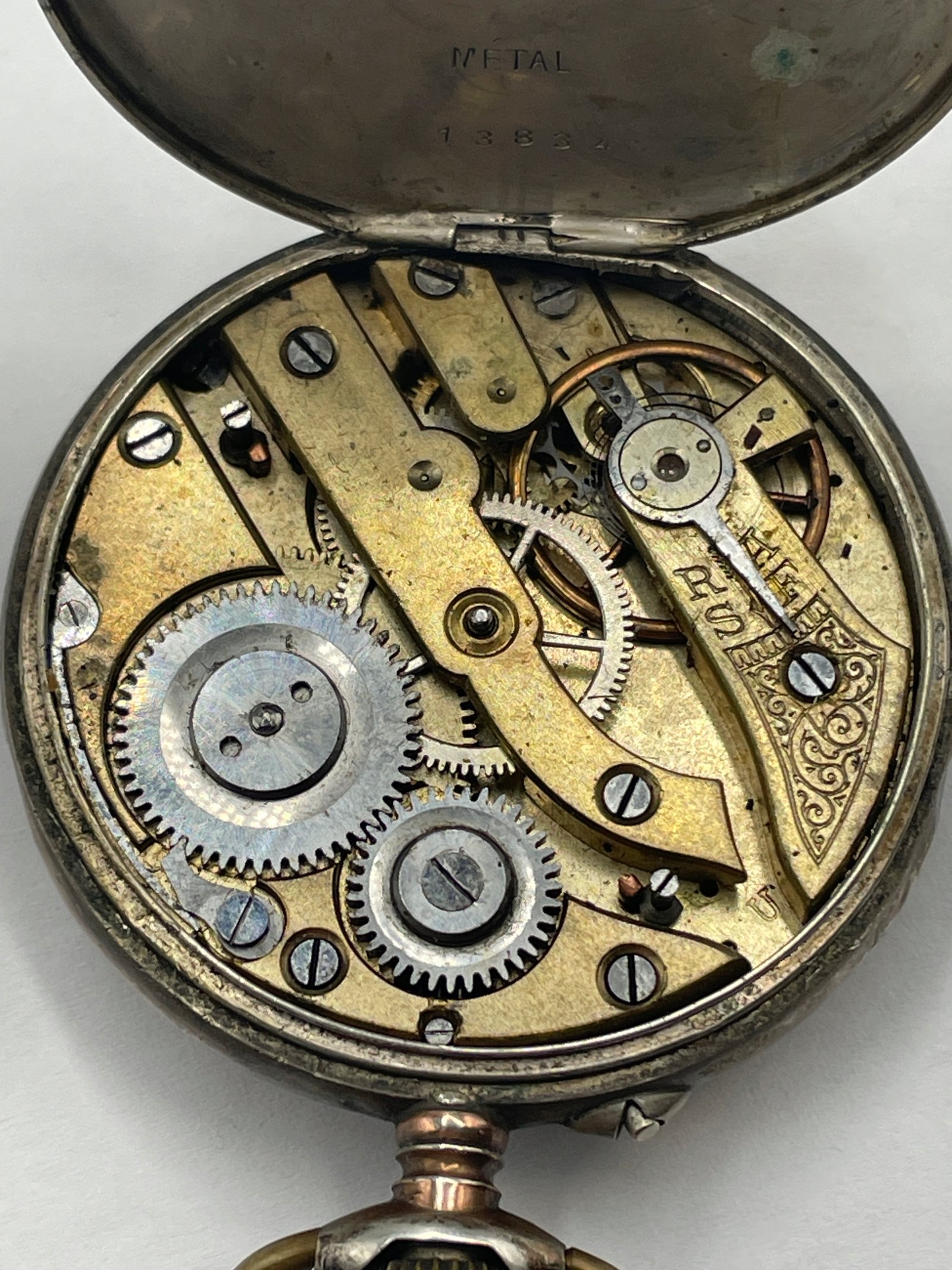 Zegarek kieszonkowy w stylu klasycznym, wykonany z wysokiej jakości srebra o próbie 800, co potwierdzają wybite punce. Pokrywa wewnętrzna oznaczona napisem „METAL”, co sugeruje, że jest wykonana z innego stopu, typowego dla ochronnych pokryw mechanizmu.