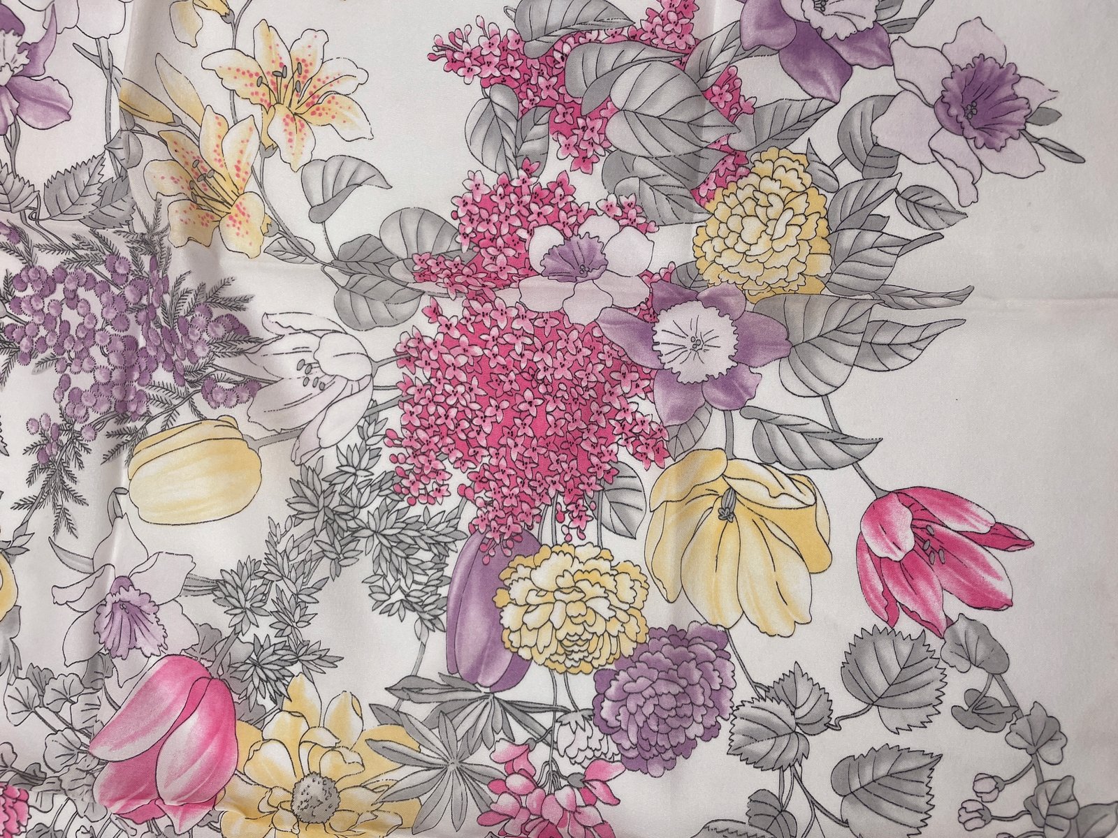 Apaszka damska biala w liliowe i rozowe kwiaty 86×86