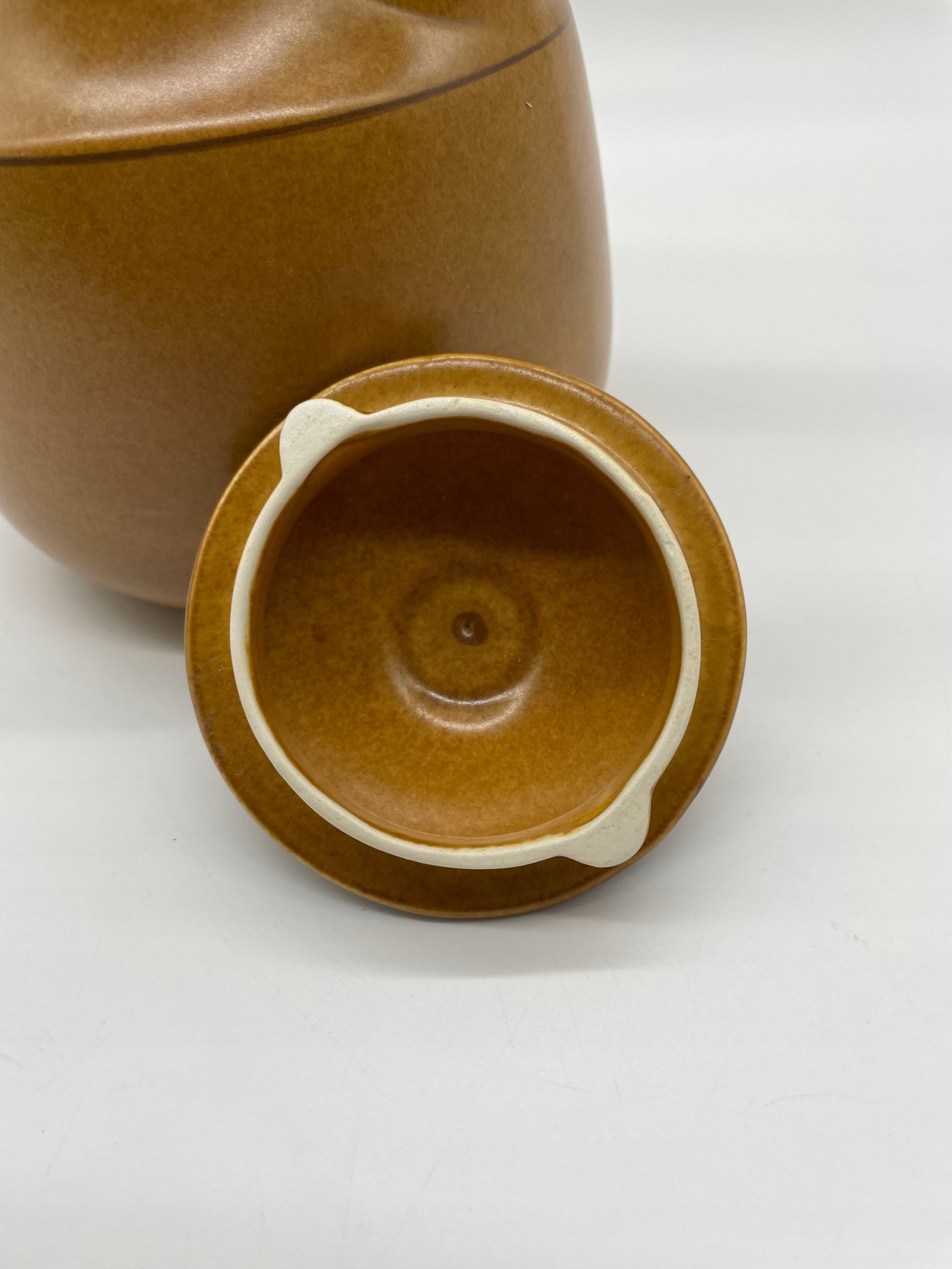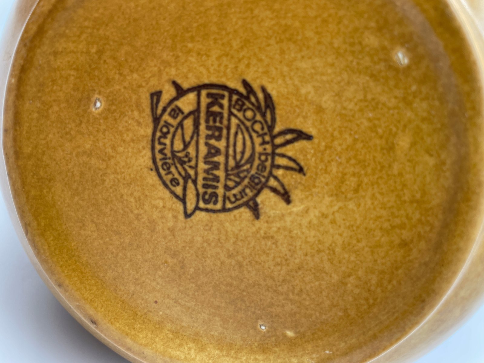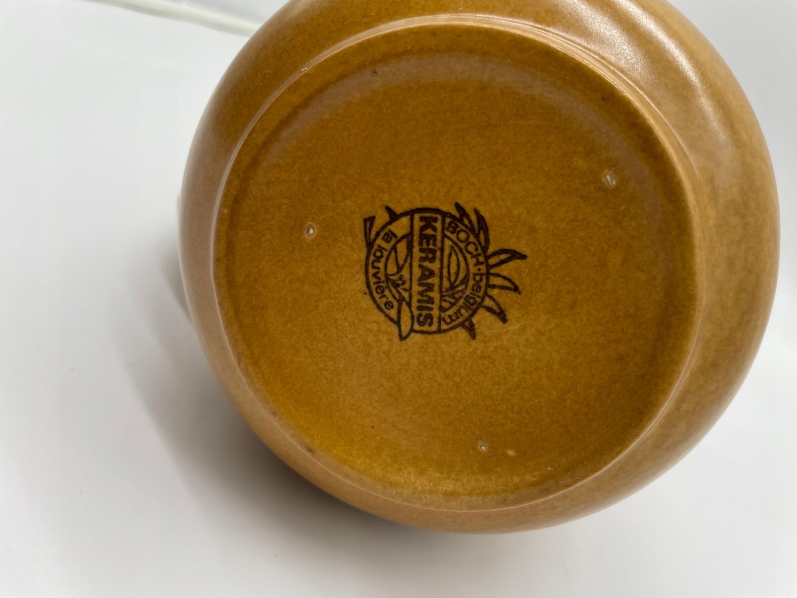 Oryginalny czajnik ceramiczny sygnowany przez renomowaną belgijską manufakturę Boch Keramis z La Louvière. Wykonany w stylu vintage z lat 60./70., szkliwiony w odcieniach ciepłego karmelu. Funkcjonalny i dekoracyjny – idealny do parzenia herbaty lub jako stylowy element kuchennej kolekcji.