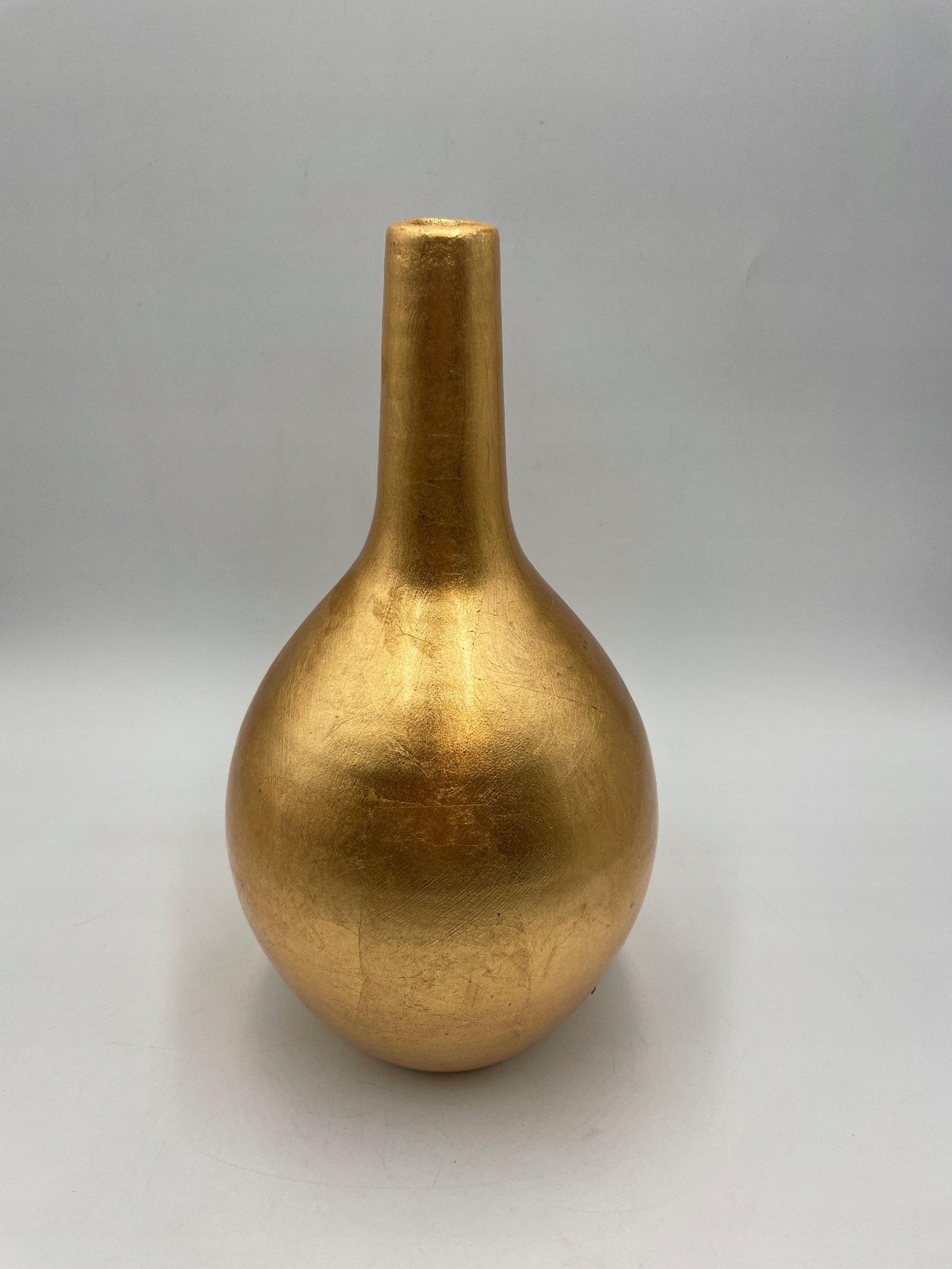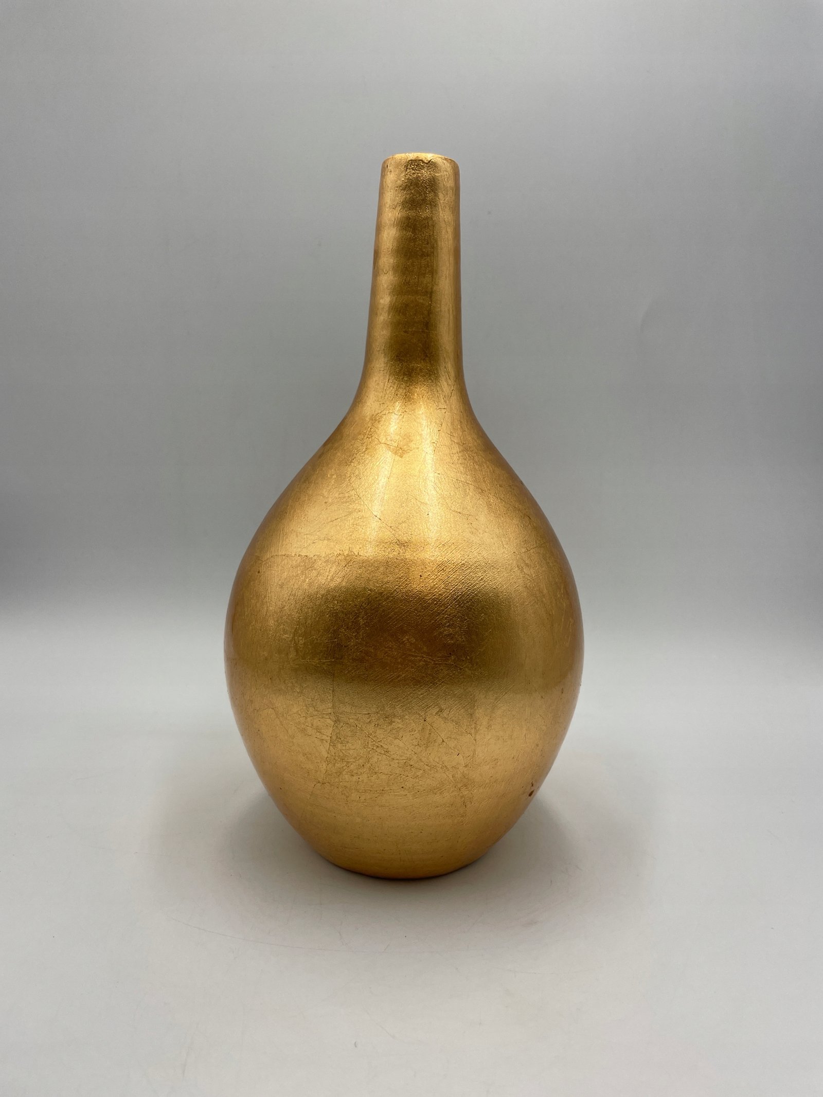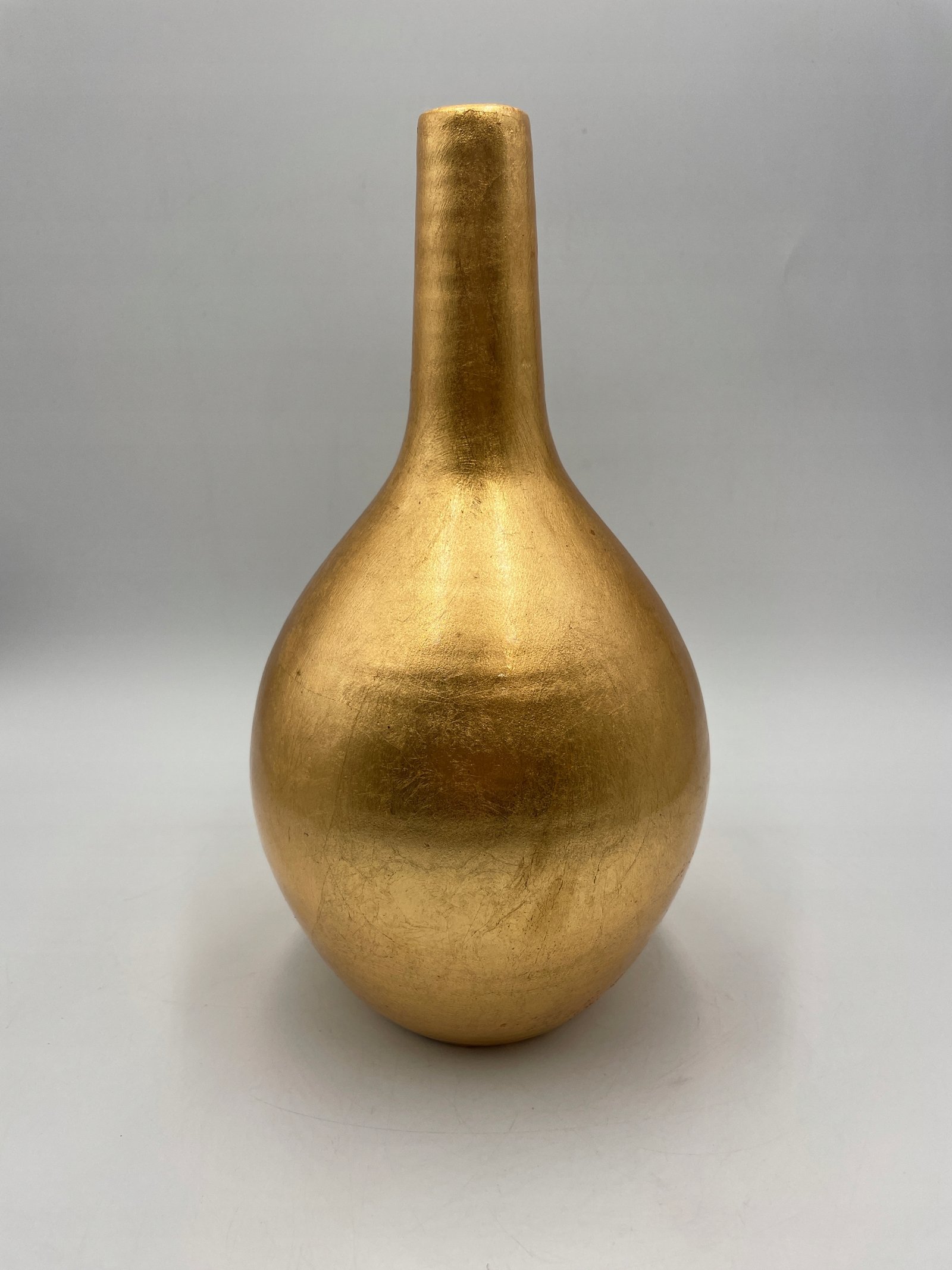 Elegancki ceramiczny wazon o wysokości 26 cm i średnicy 14 cm. Wazon ma unikalny kształt z wąską szyjką i szeroką, zaokrągloną podstawą. Powierzchnia wazonu jest pokryta szlachetnym złotym kolorem z delikatnym efektem spękań, co nadaje mu styl vintage i luksusowy wygląd.