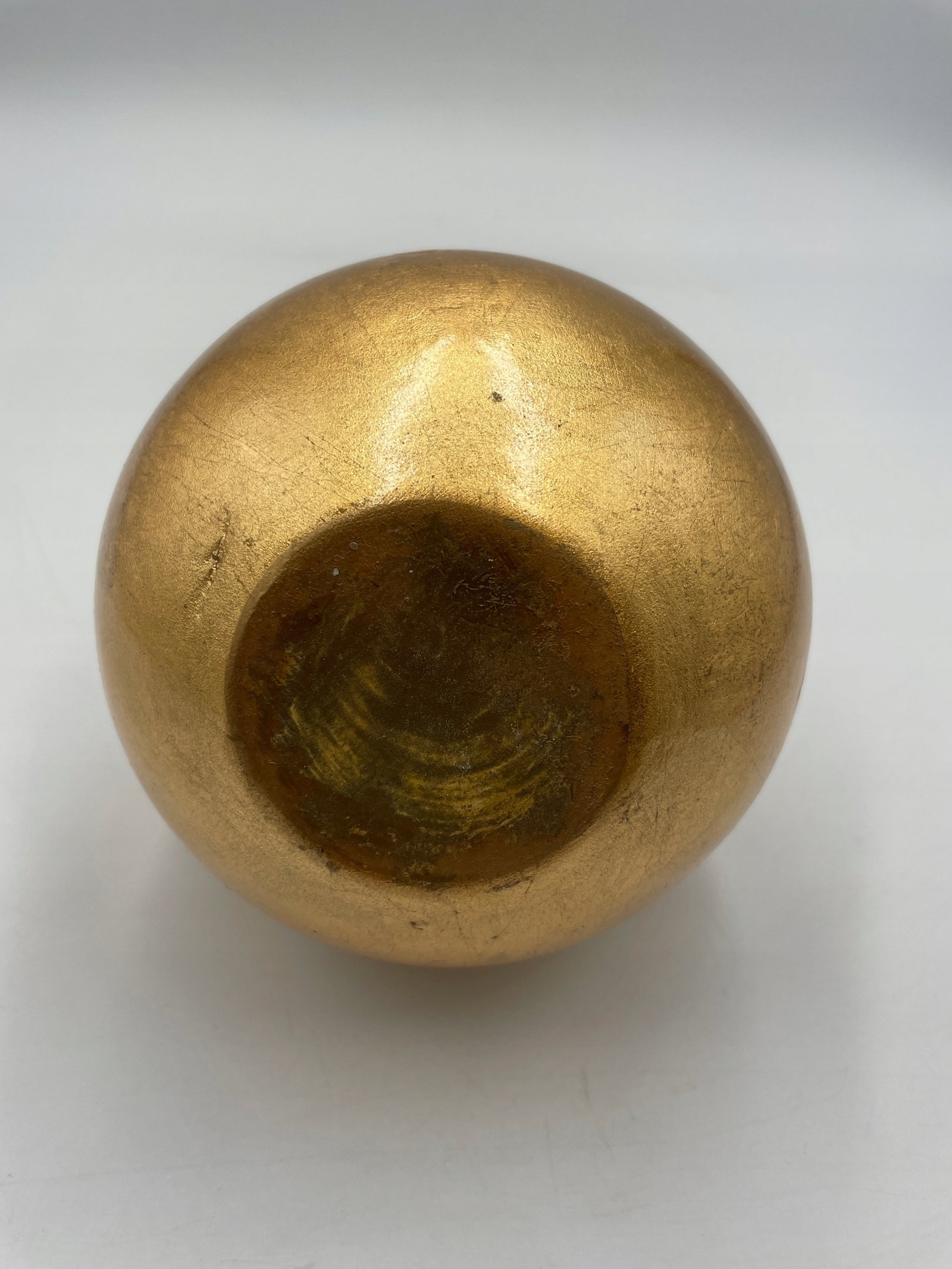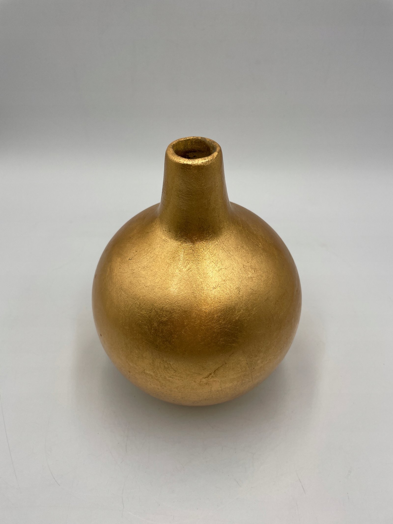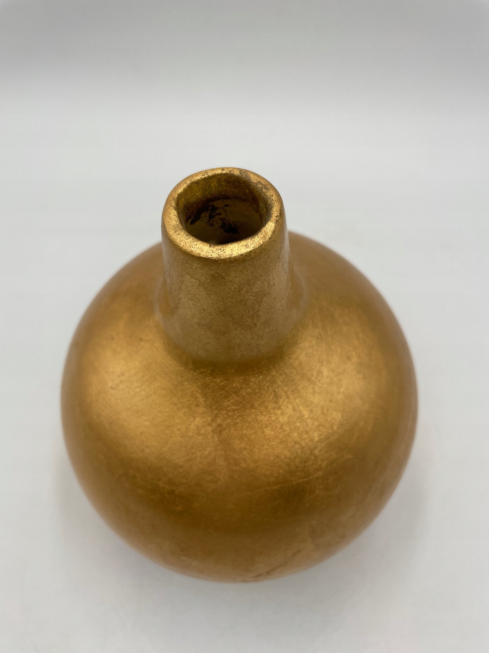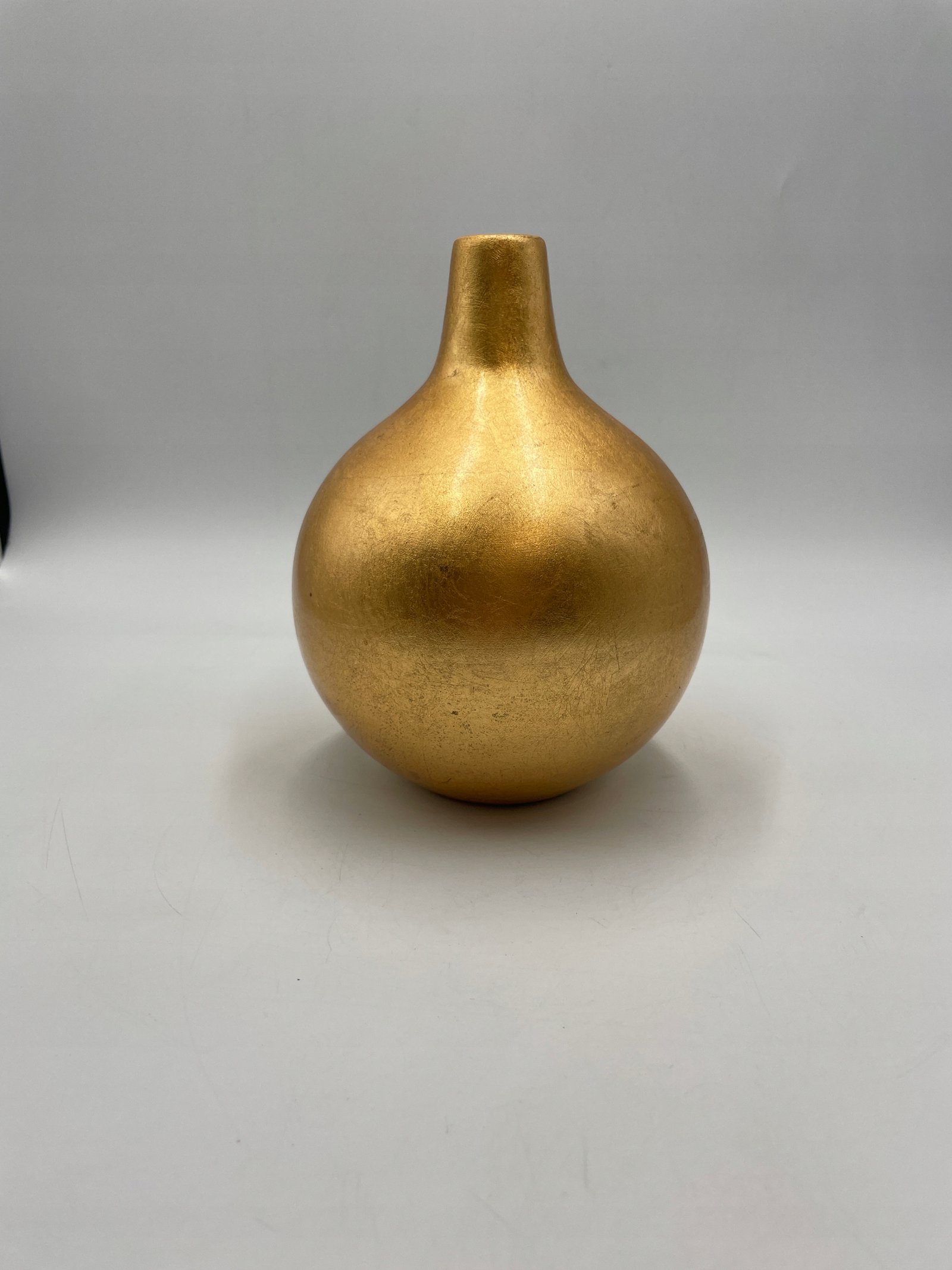 Elegancki ceramiczny wazon o wysokości 26 cm i średnicy 14 cm. Wazon ma unikalny kształt z wąską szyjką i szeroką, zaokrągloną podstawą. Powierzchnia wazonu jest pokryta szlachetnym złotym kolorem z delikatnym efektem spękań, co nadaje mu styl vintage i luksusowy wygląd.