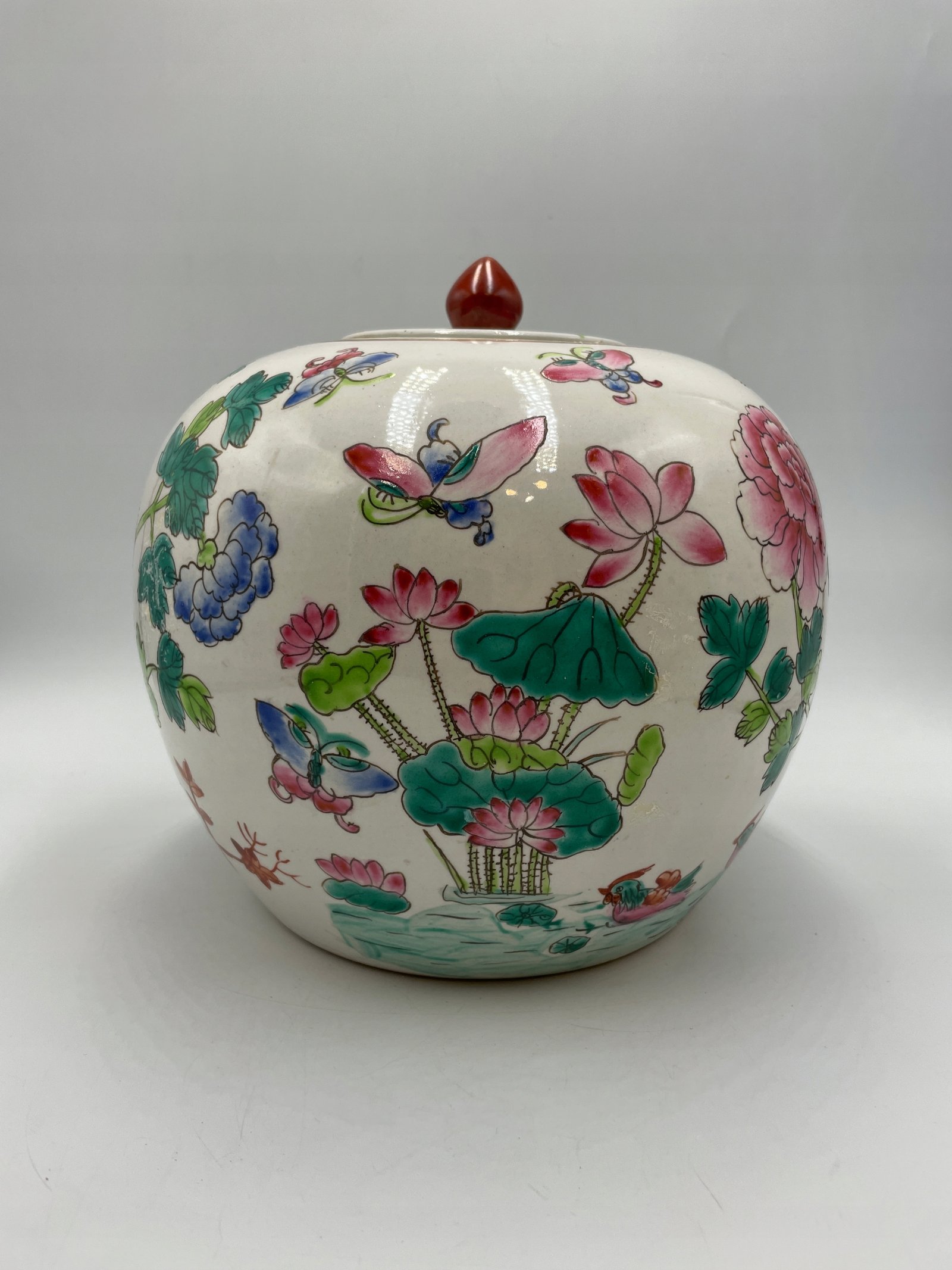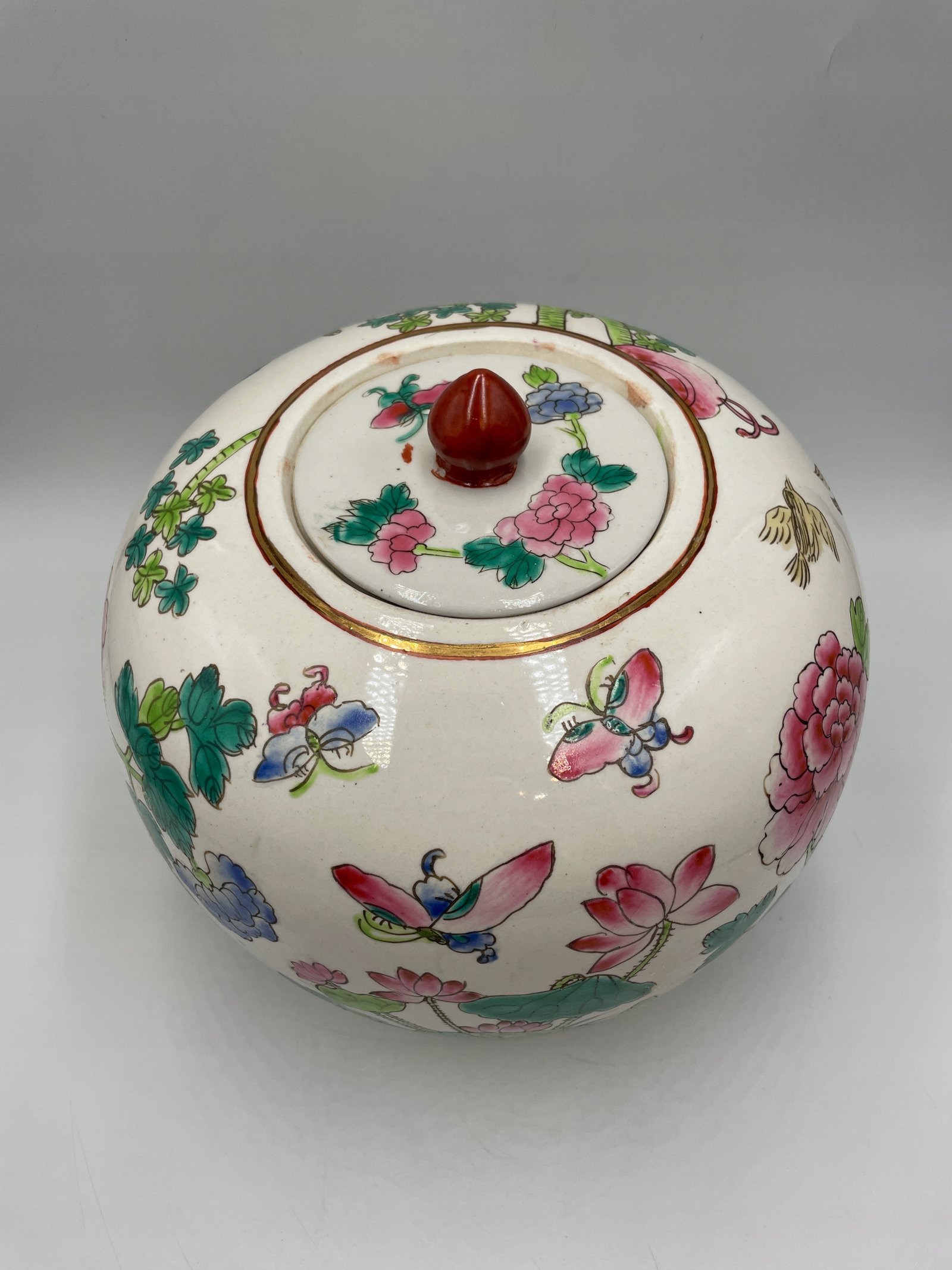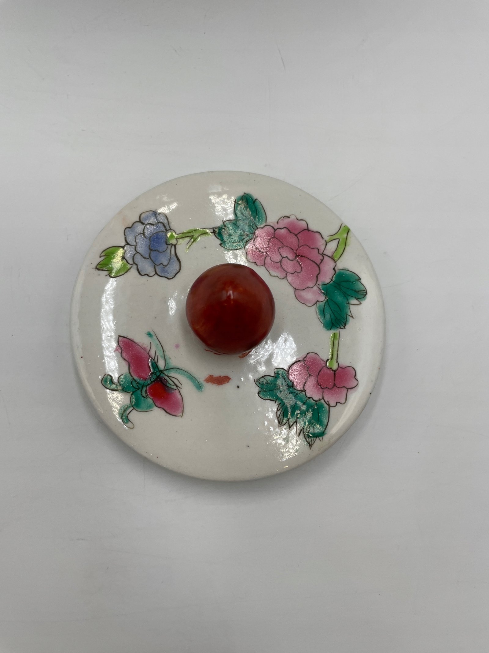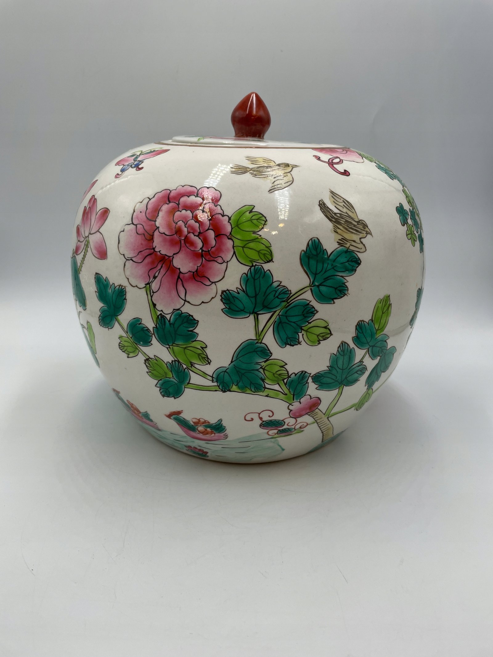 Okrągły pojemnik z pokrywką w tradycyjnym chińskim stylu, ozdobiony malowanymi motywami kwiatów, ptaków i motyli. Pokrywka jest wyposażona w ozdobny uchwyt w kształcie czerwonego kamienia.