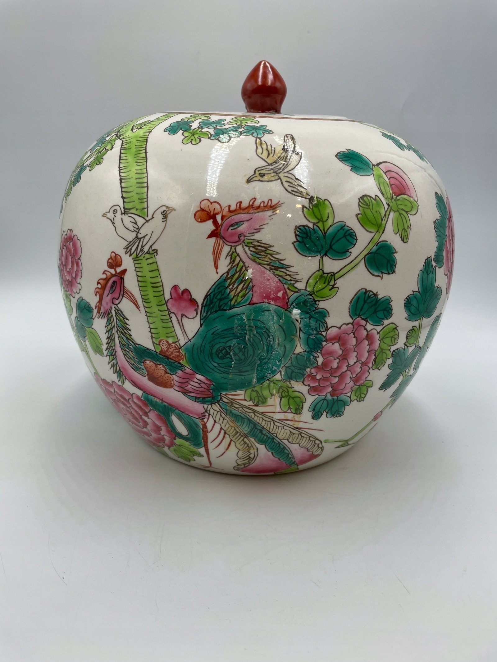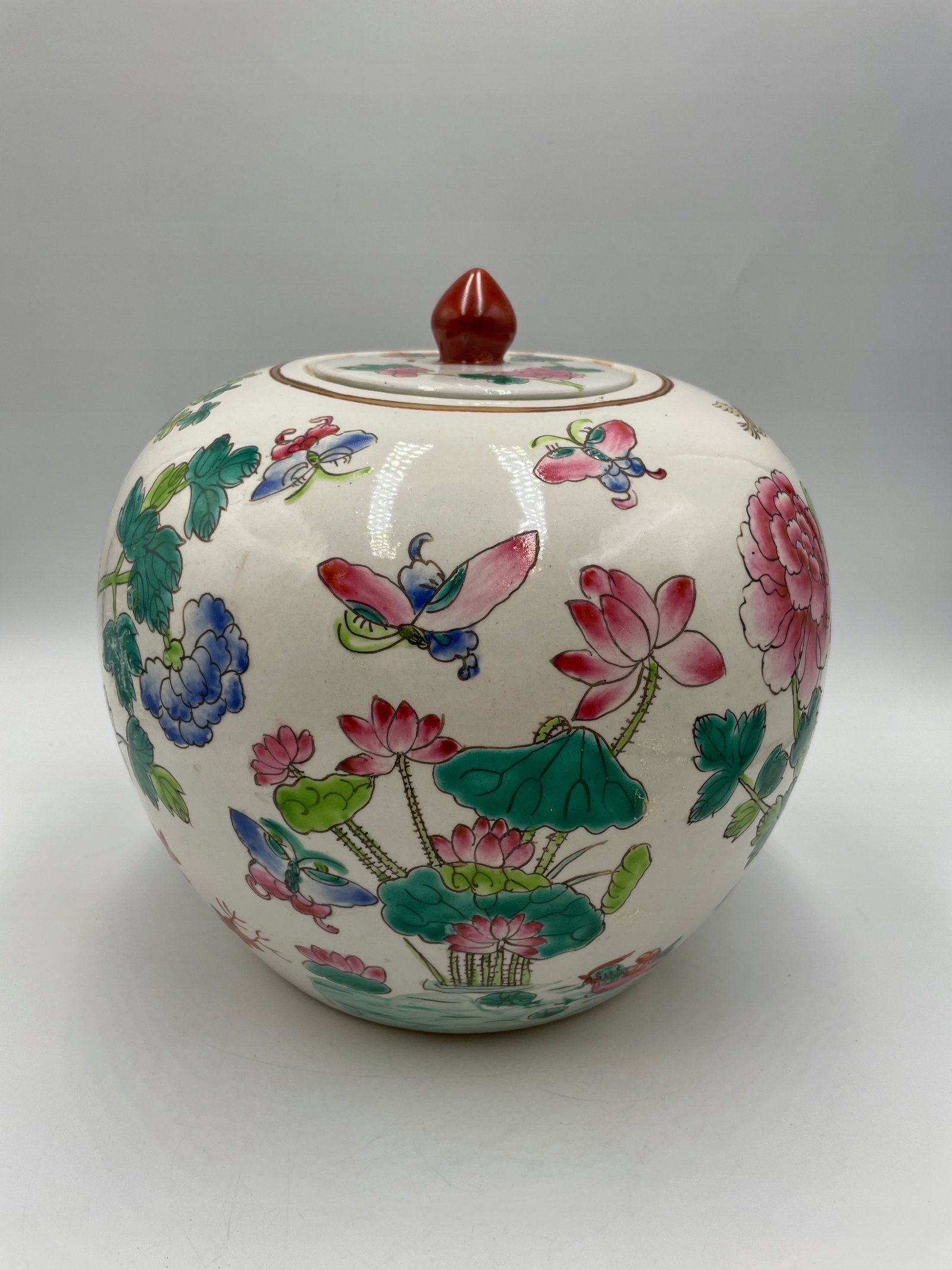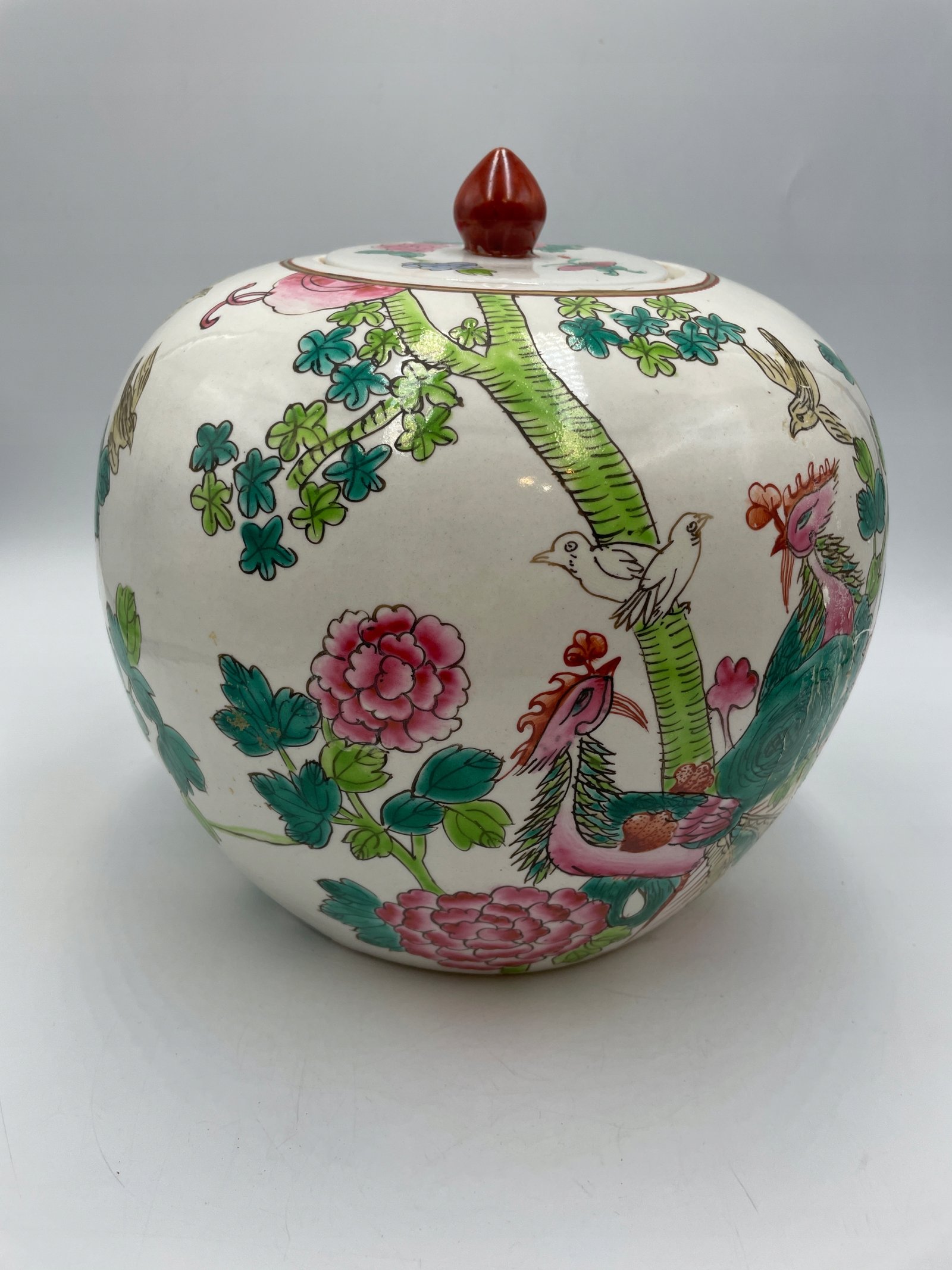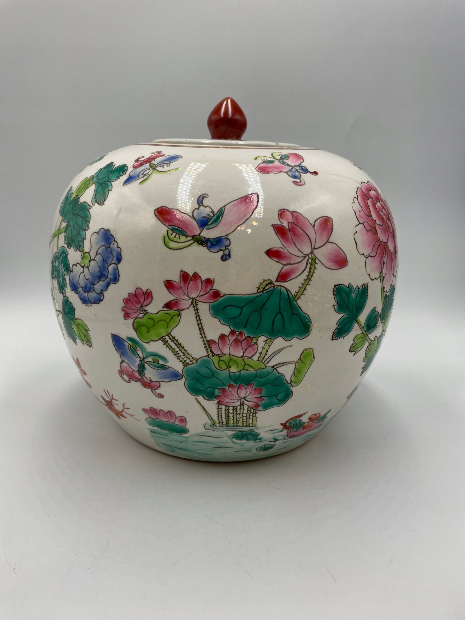 Okrągły pojemnik z pokrywką w tradycyjnym chińskim stylu, ozdobiony malowanymi motywami kwiatów, ptaków i motyli. Pokrywka jest wyposażona w ozdobny uchwyt w kształcie czerwonego kamienia.