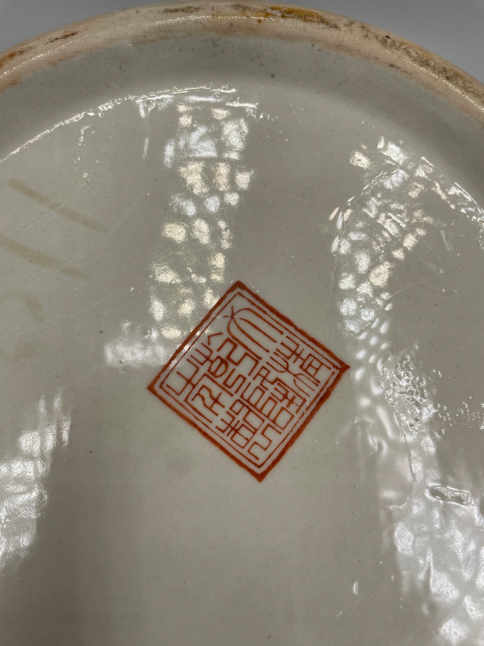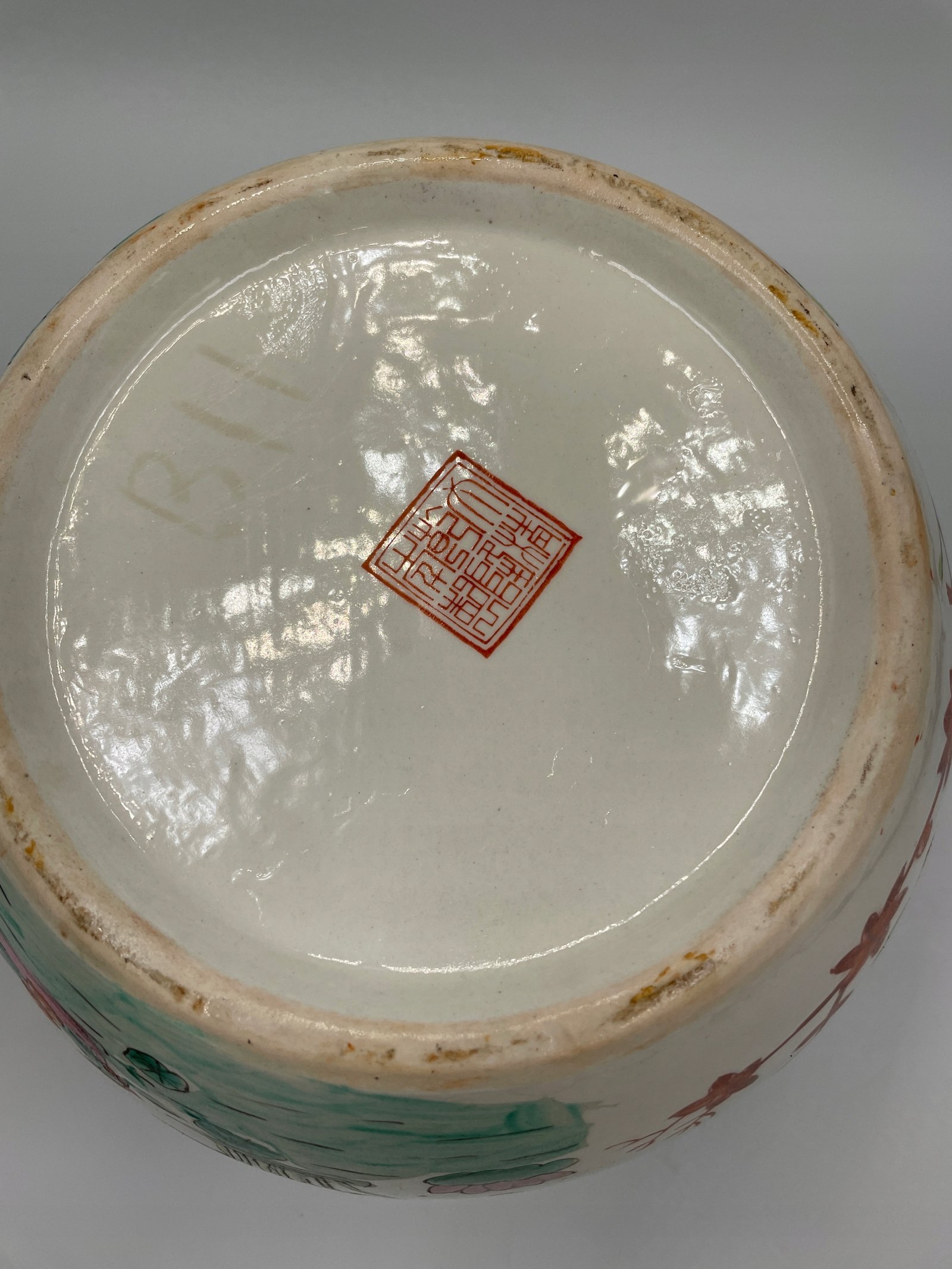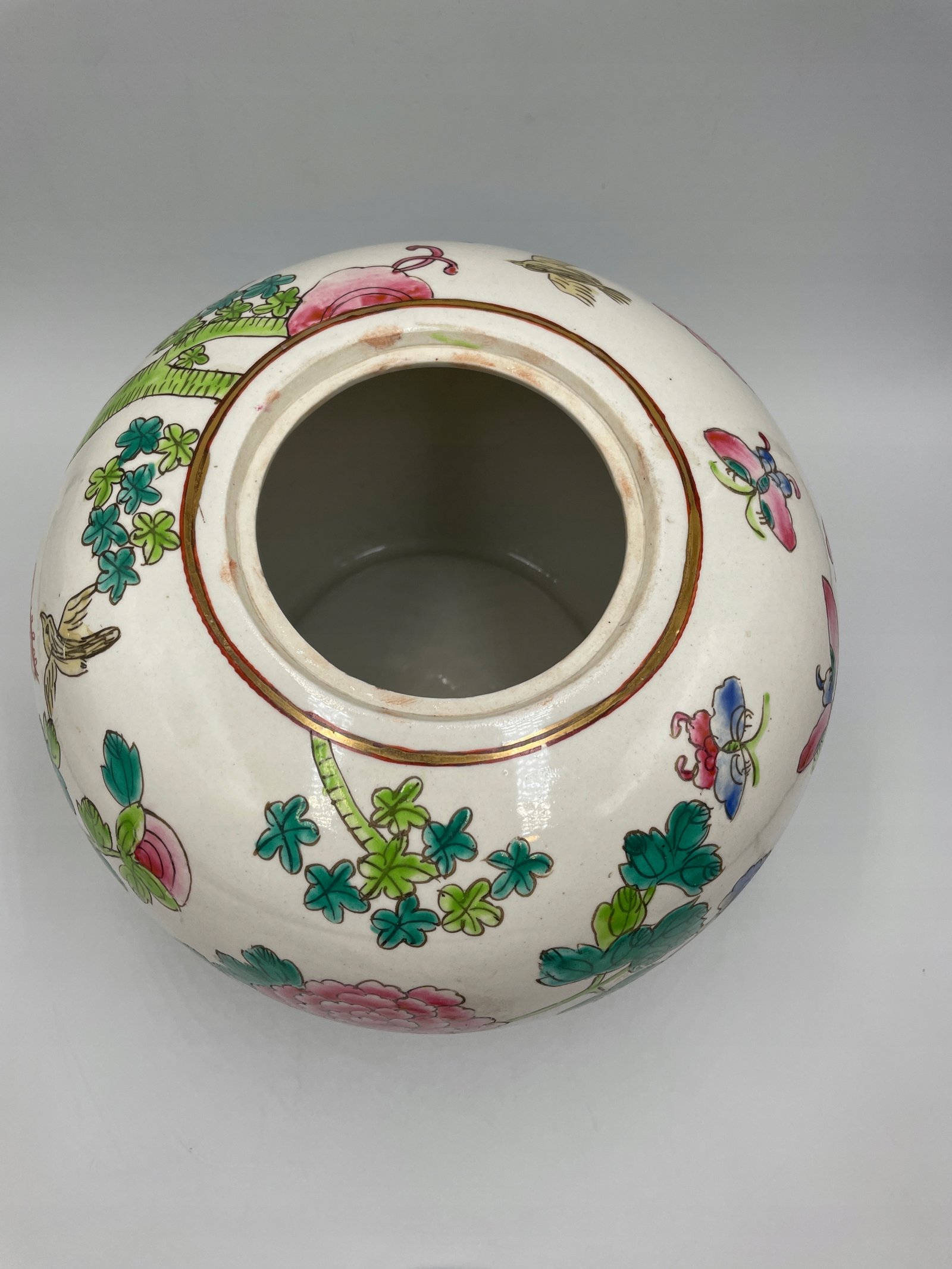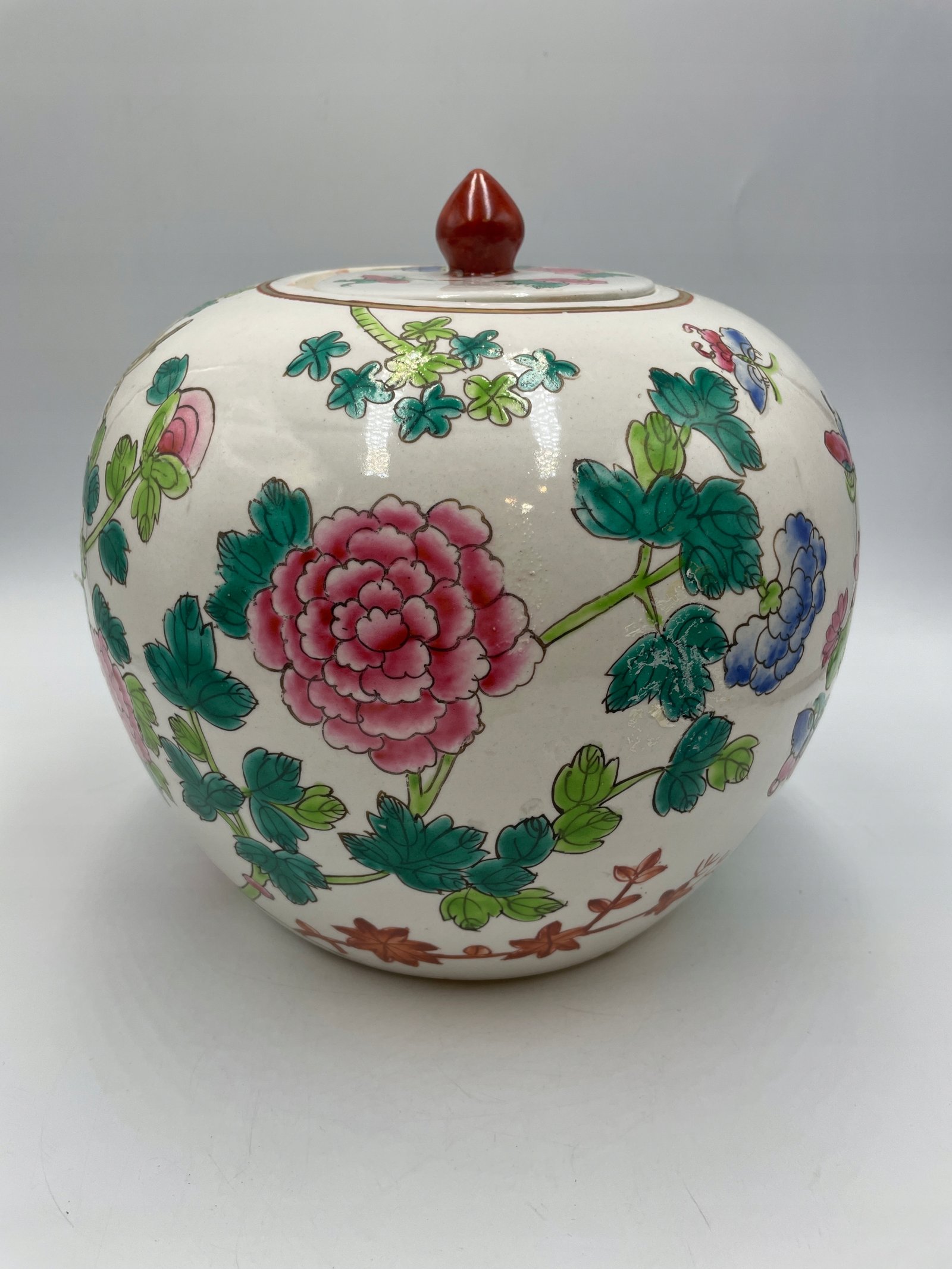 Okrągły pojemnik z pokrywką w tradycyjnym chińskim stylu, ozdobiony malowanymi motywami kwiatów, ptaków i motyli. Pokrywka jest wyposażona w ozdobny uchwyt w kształcie czerwonego kamienia.