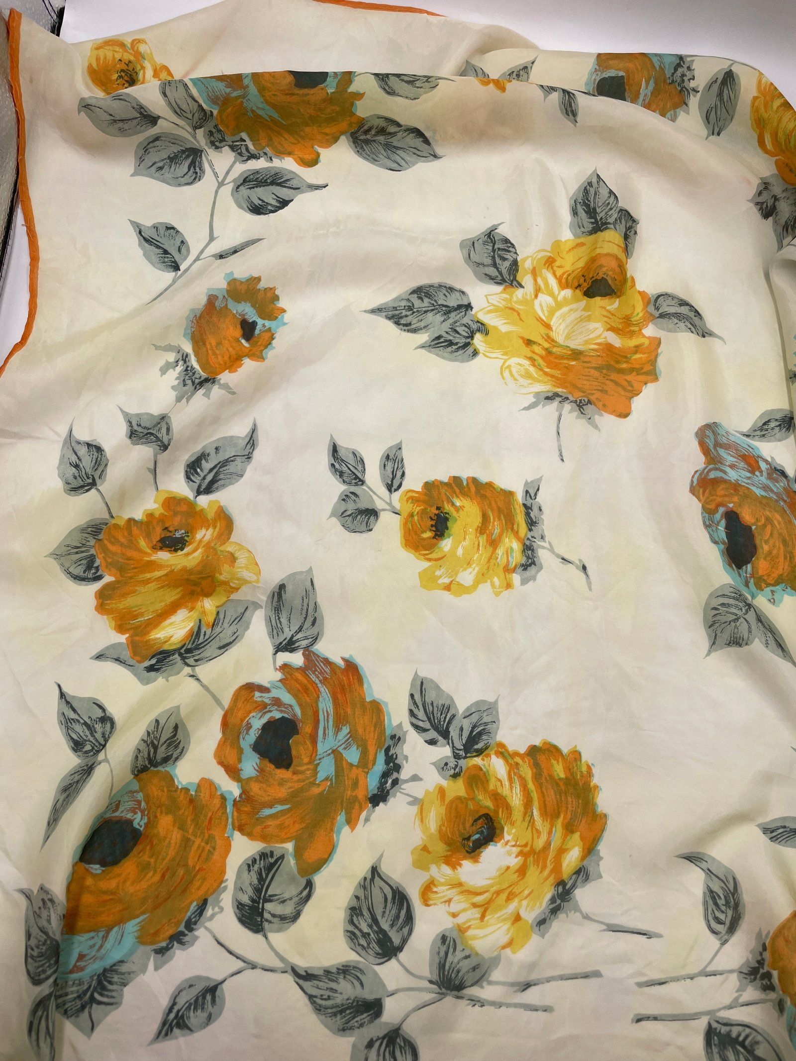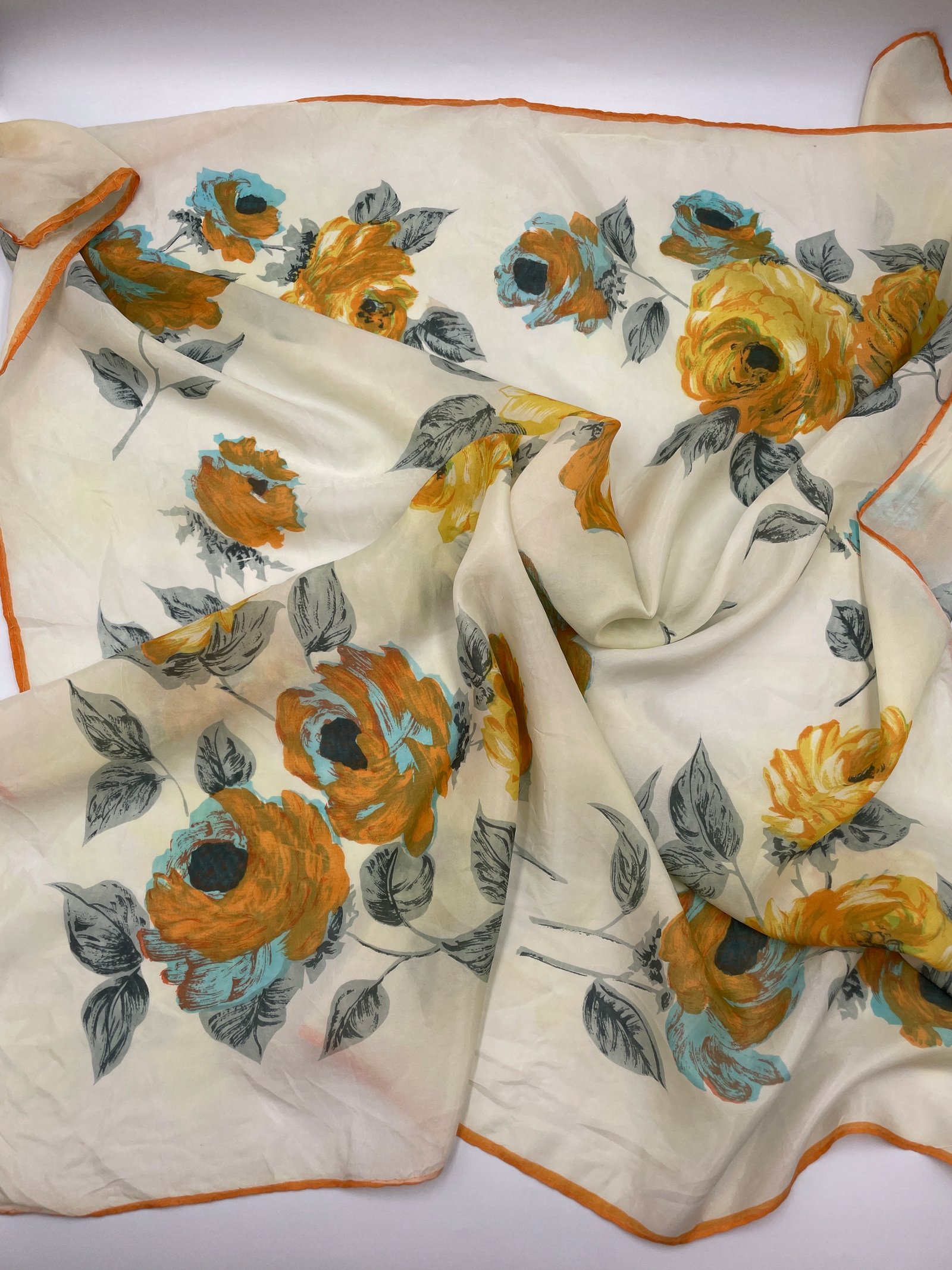 Chusta lata 70 beżowa w pomarańczowe kwiaty i liście 80×80 cm
