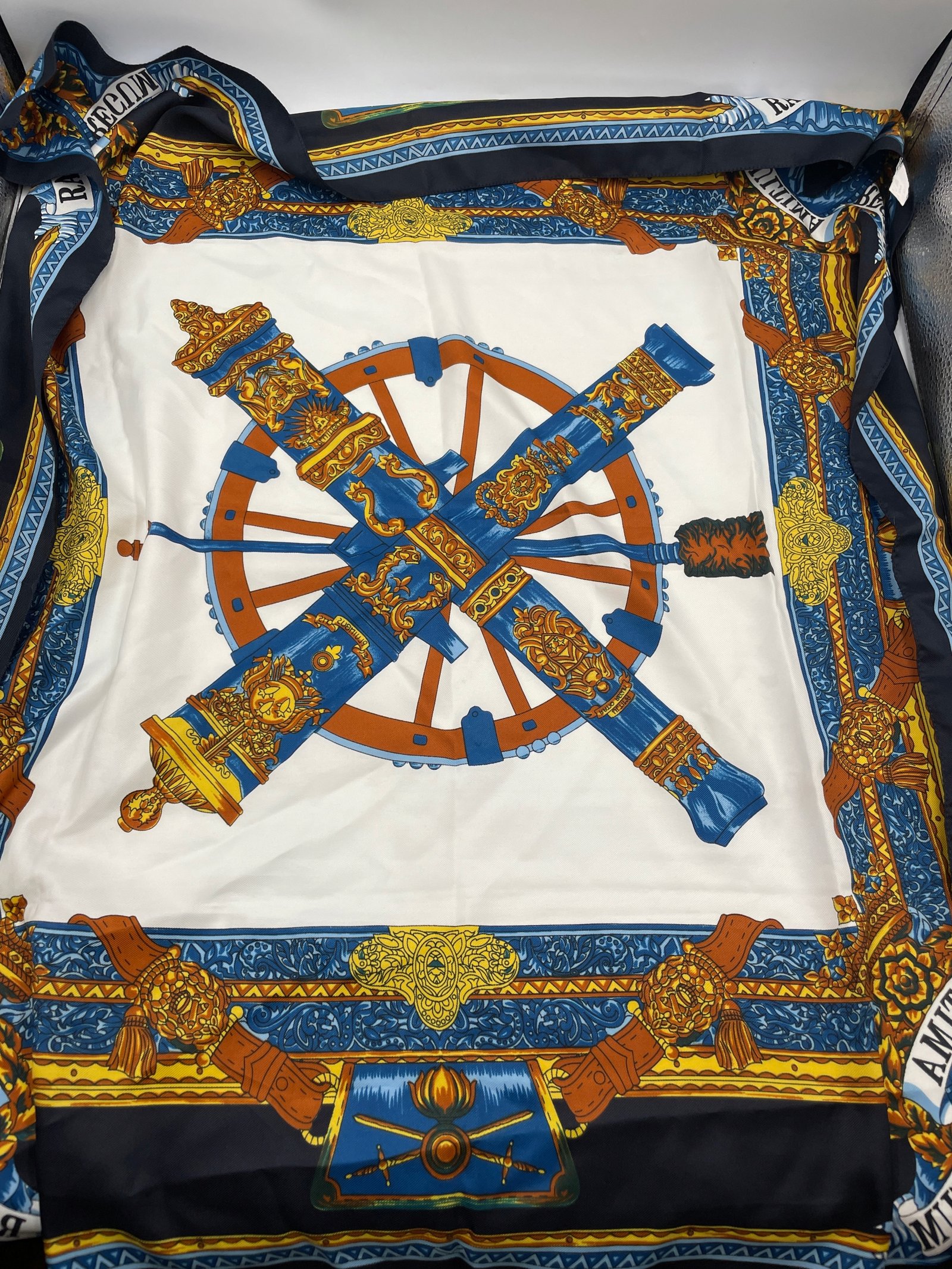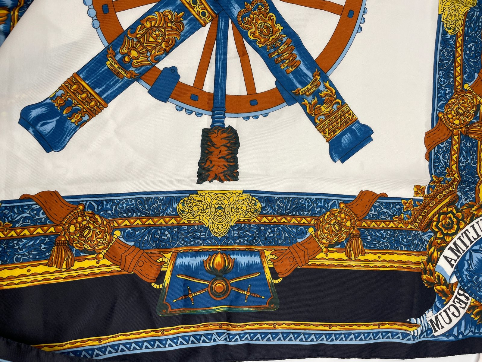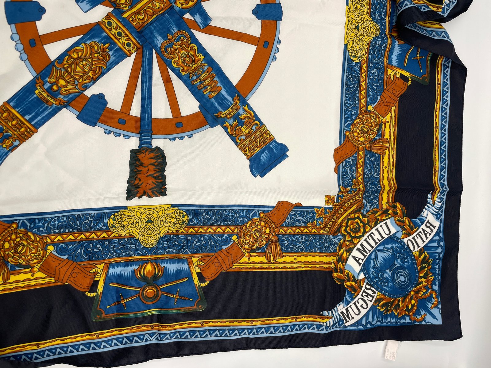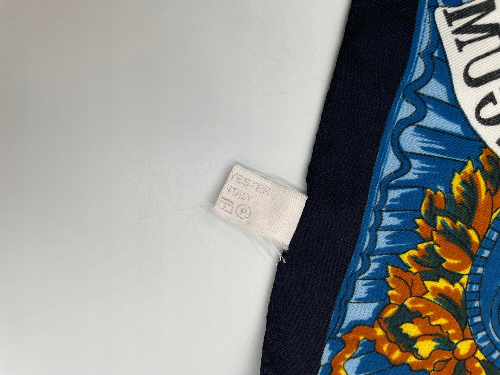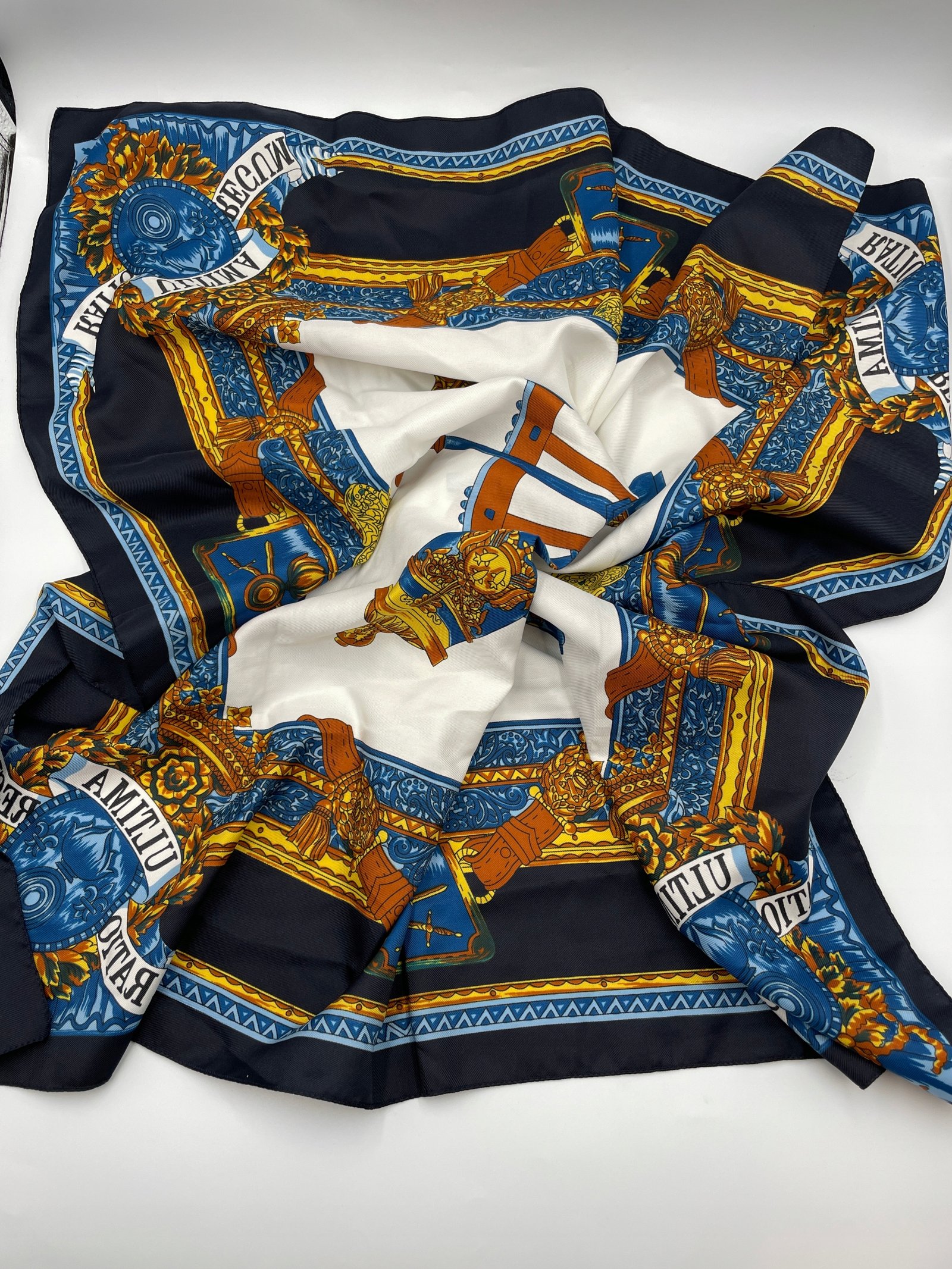 Chusta Włochy lata 80 poliester koło z dekoracją antyczny ornament 80×80 cm