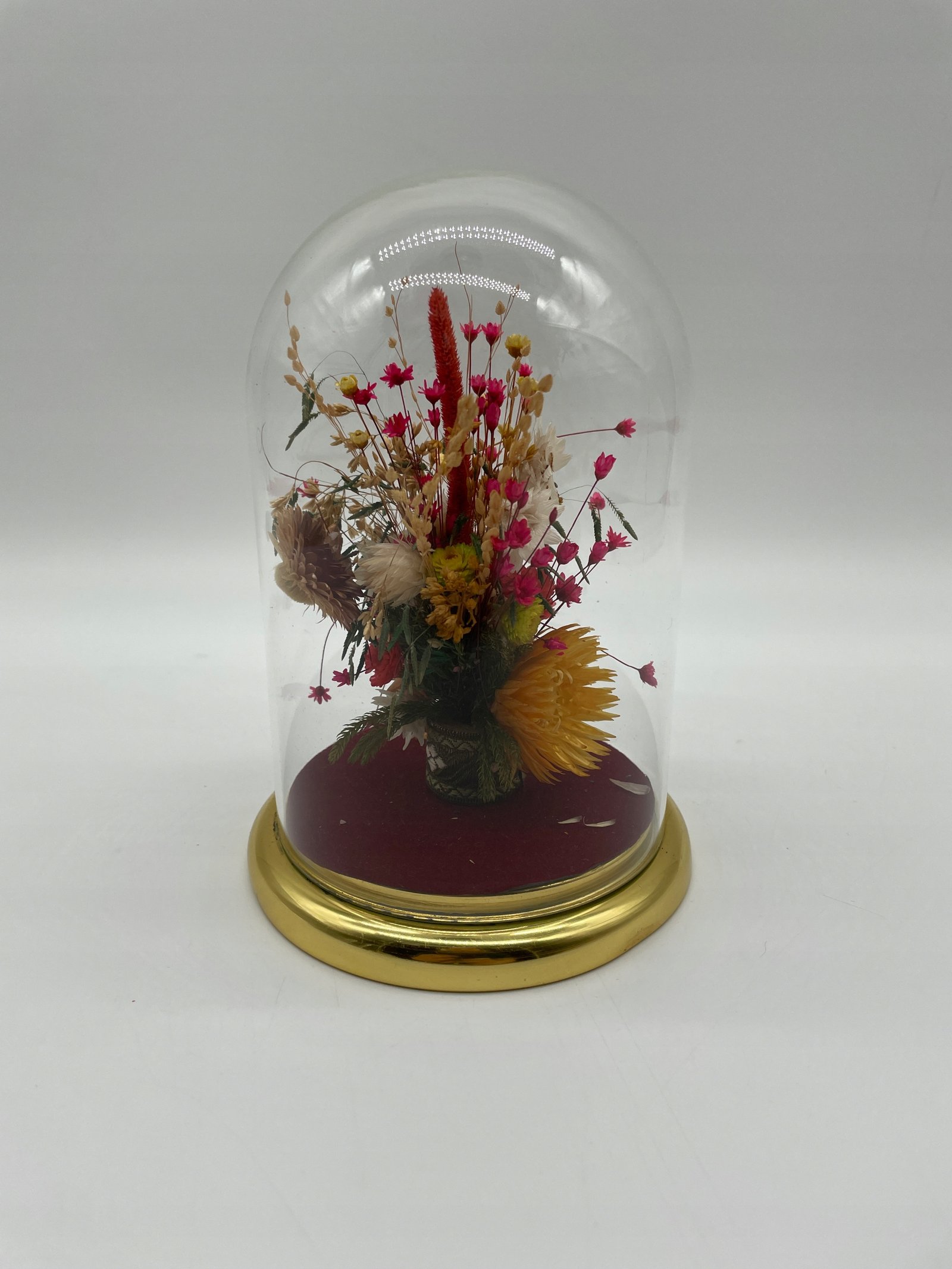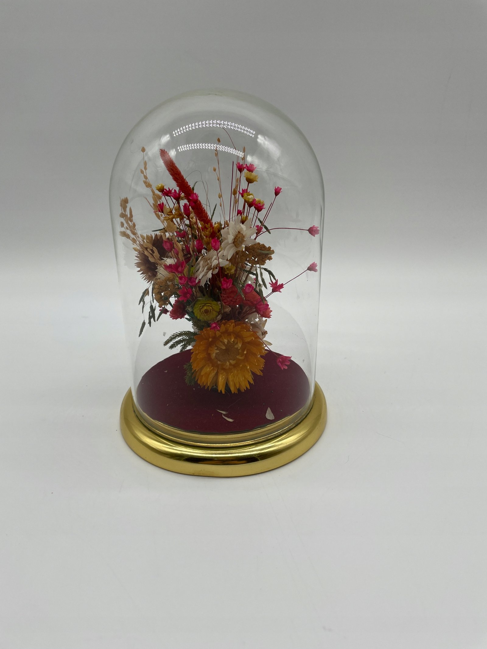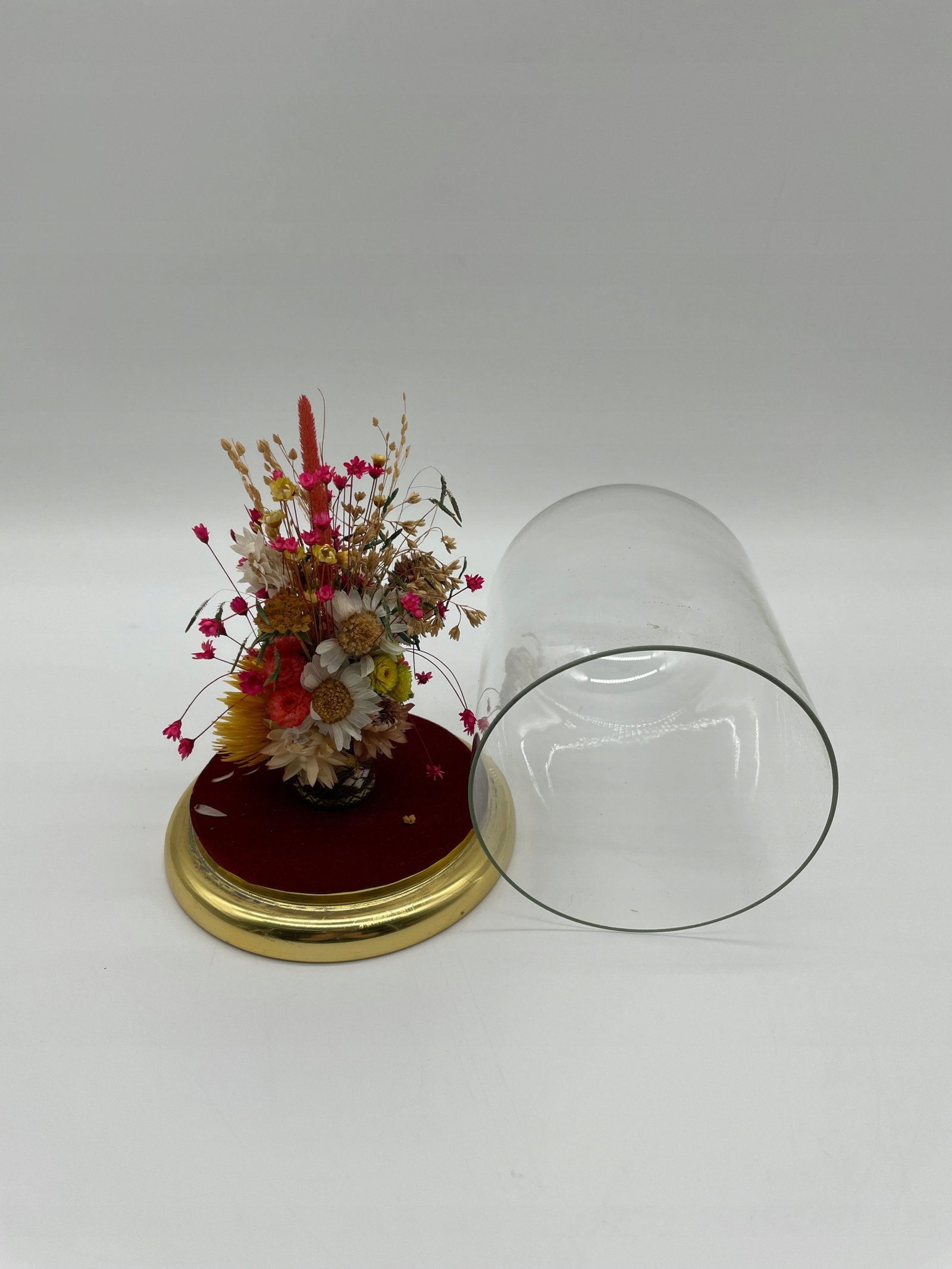 Ręcznie wykonana dekoracja kwiatowa z suszonych i sztucznych kwiatów pod szklanym kloszem. Ozdoba umieszczona jest na welurowej podstawie z ramką w kolorze złota.