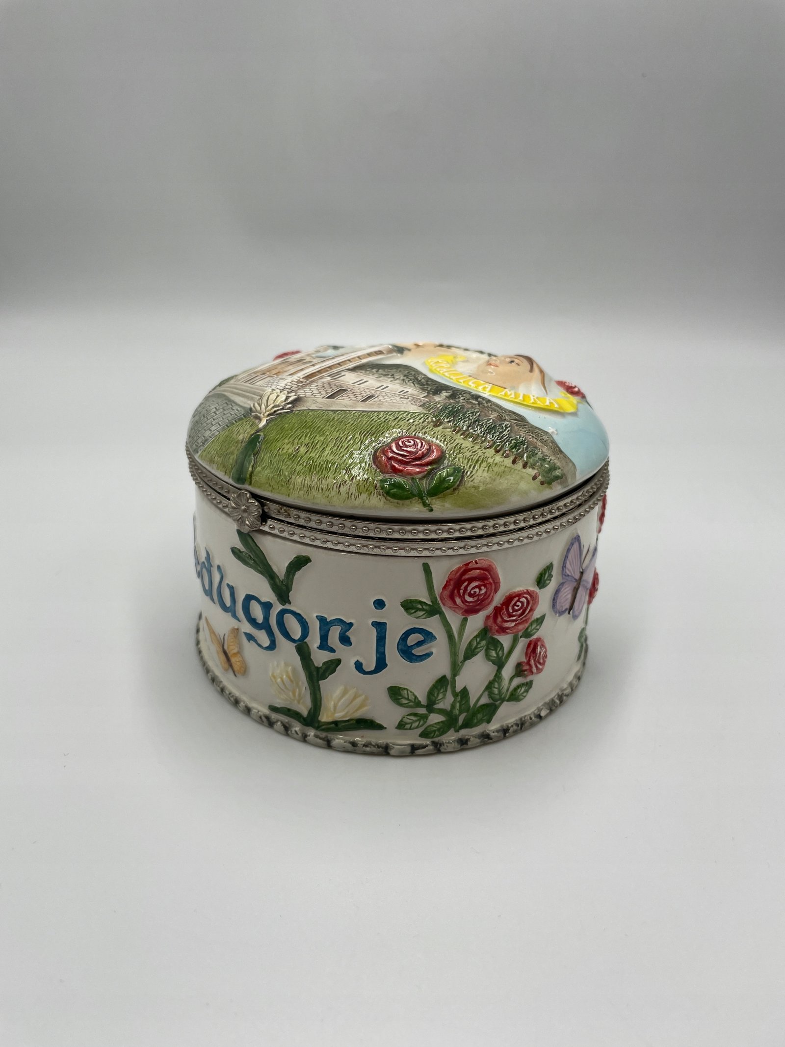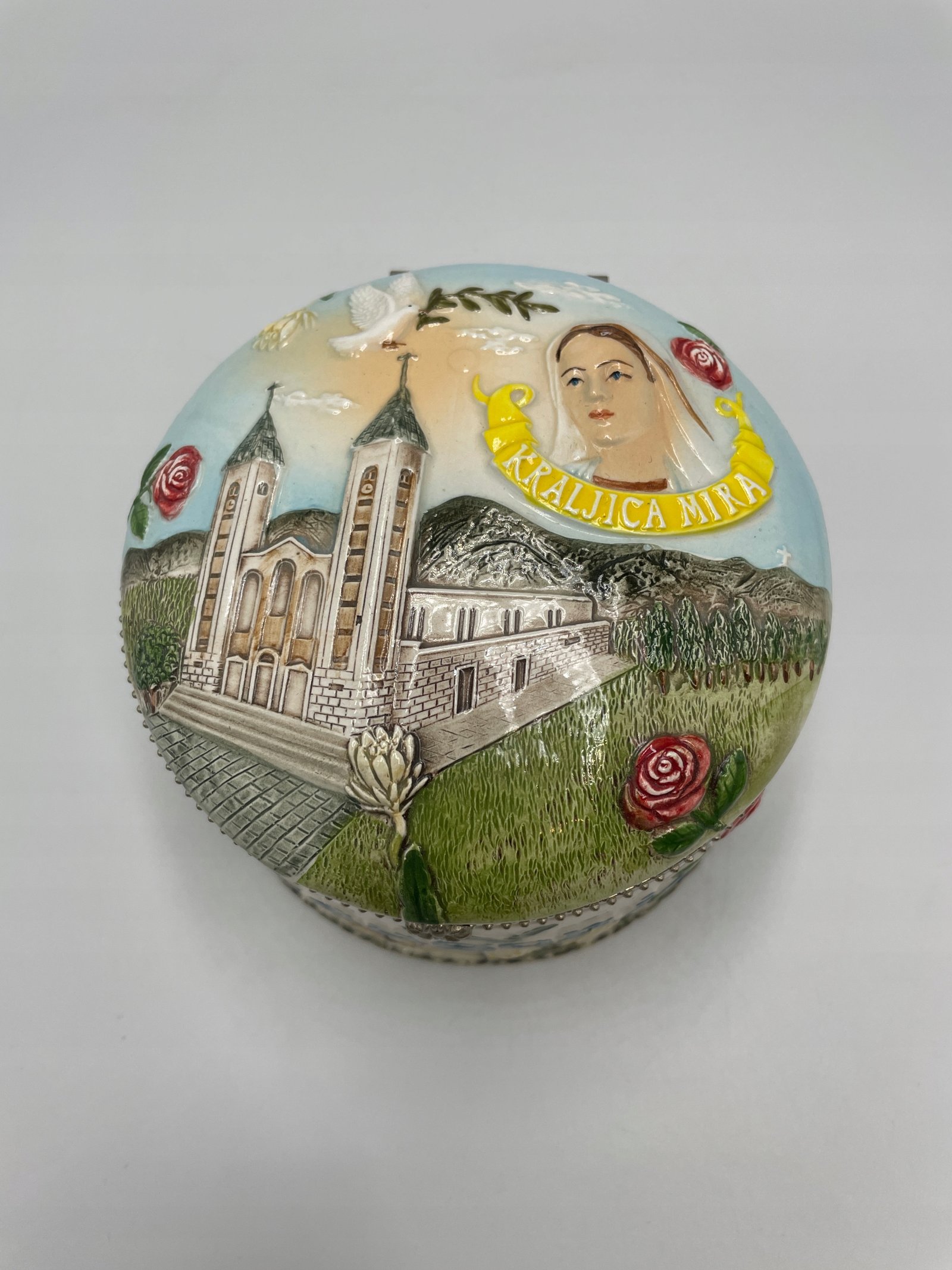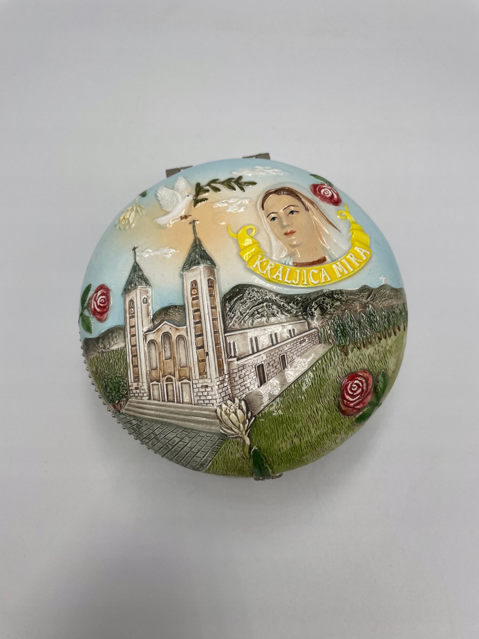 Ozdobna, ręcznie malowana szkatułka inspirowana sanktuarium w Medjugorje.