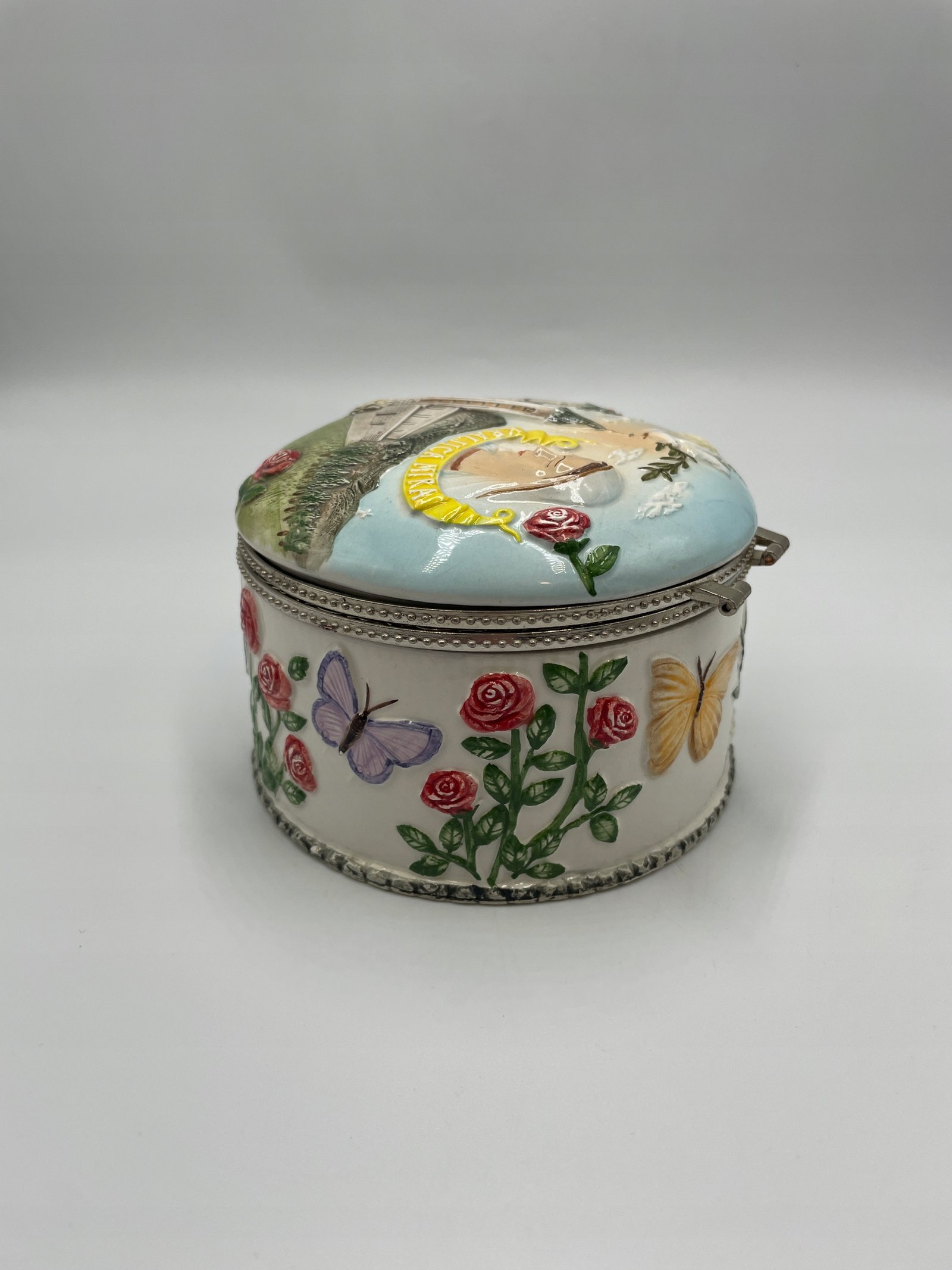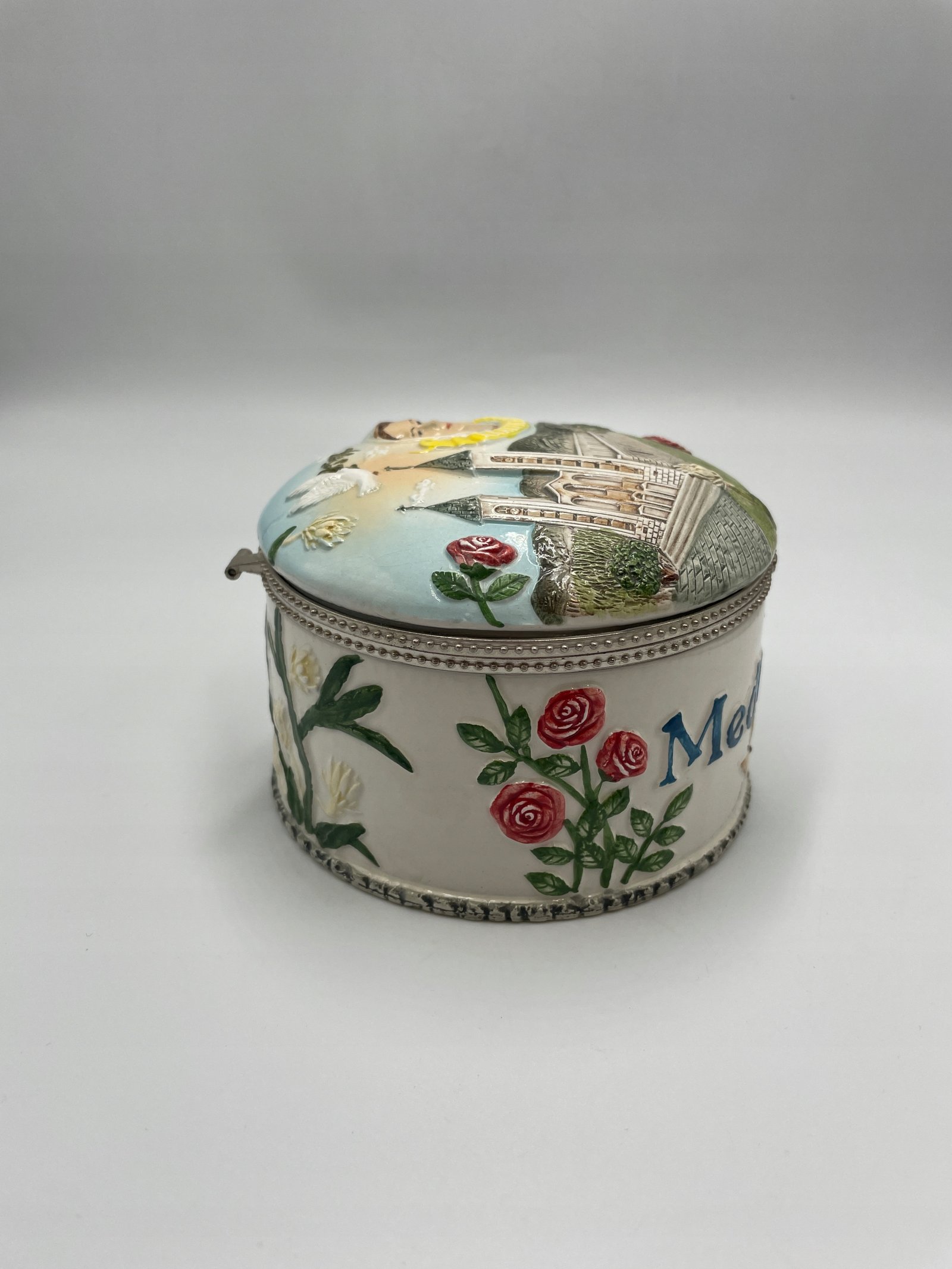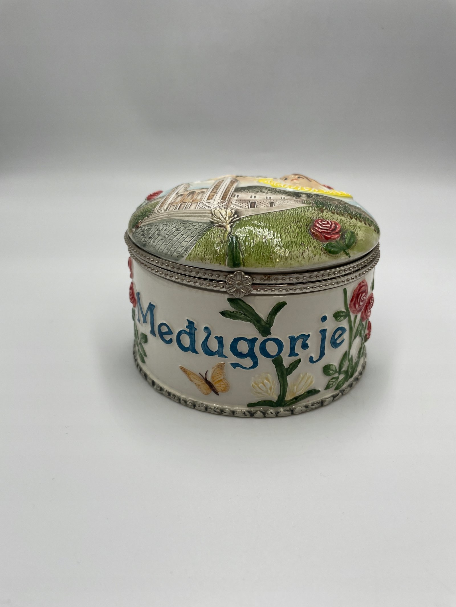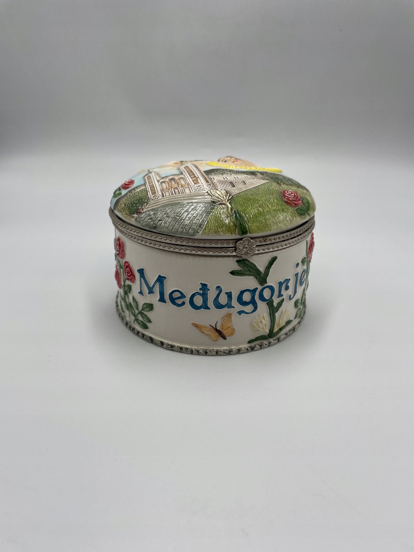 Ozdobna, ręcznie malowana szkatułka inspirowana sanktuarium w Medjugorje.