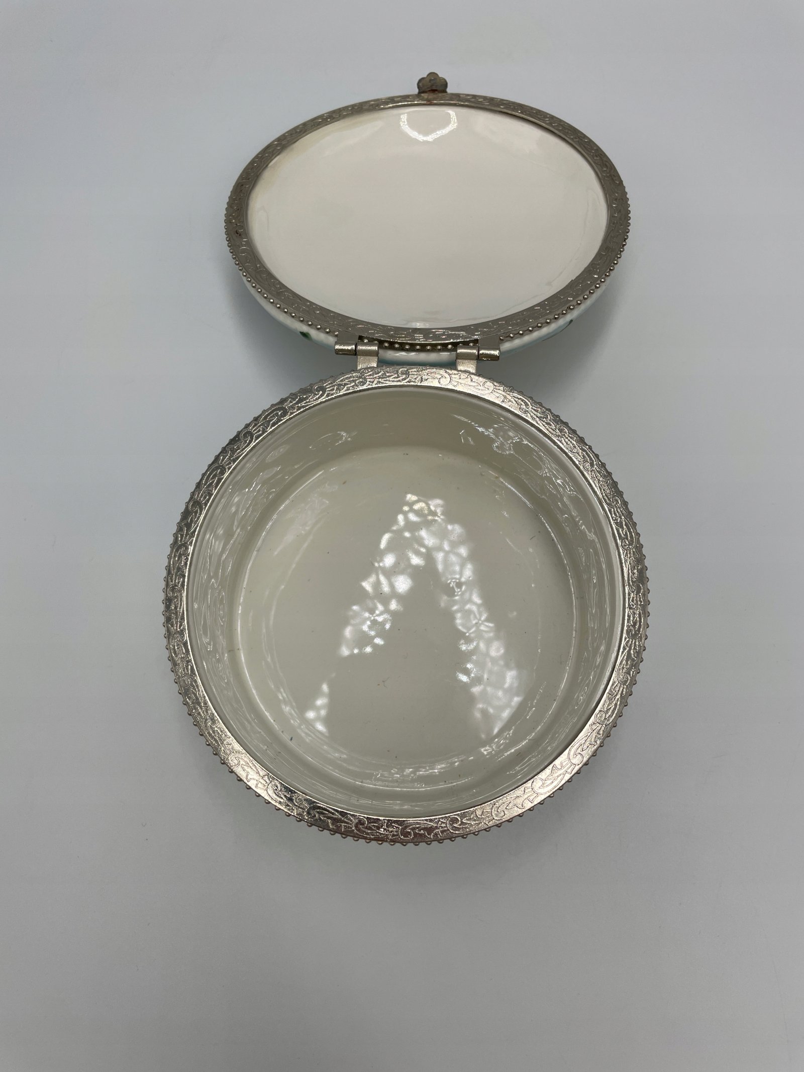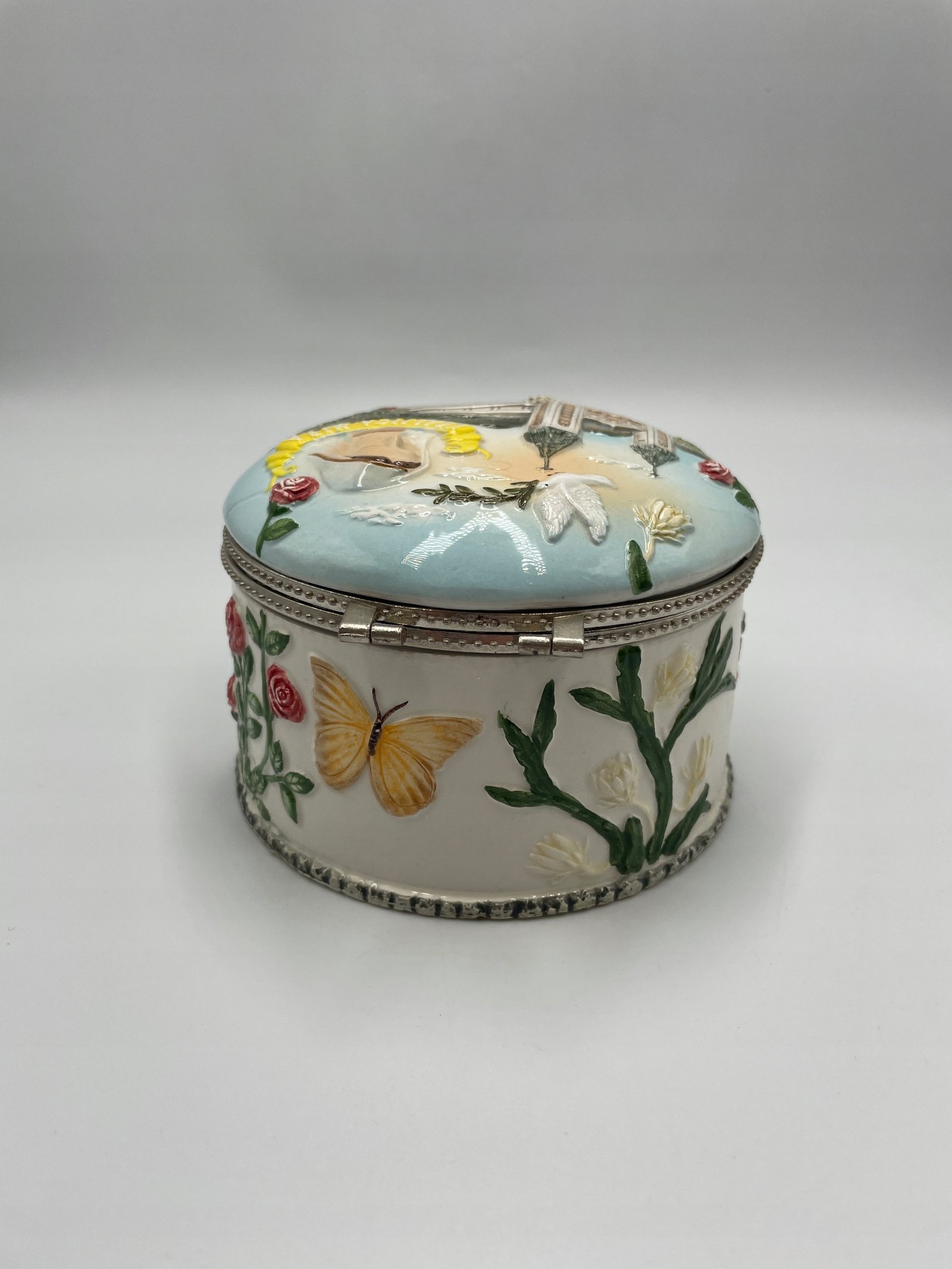Wnętrze wykończone jasną ceramiką, idealne do przechowywania drobiazgów, biżuterii lub pamiątek religijnych.