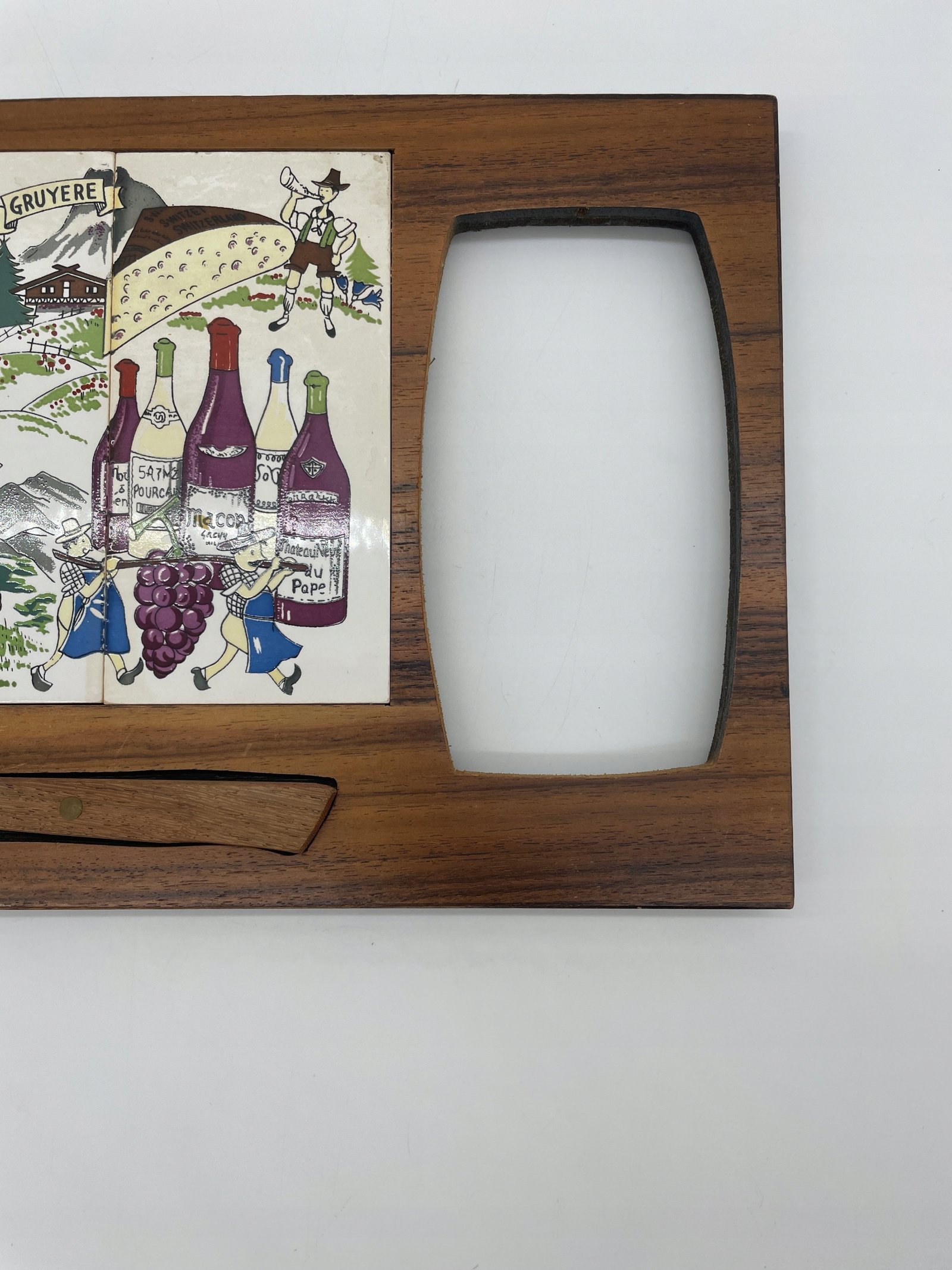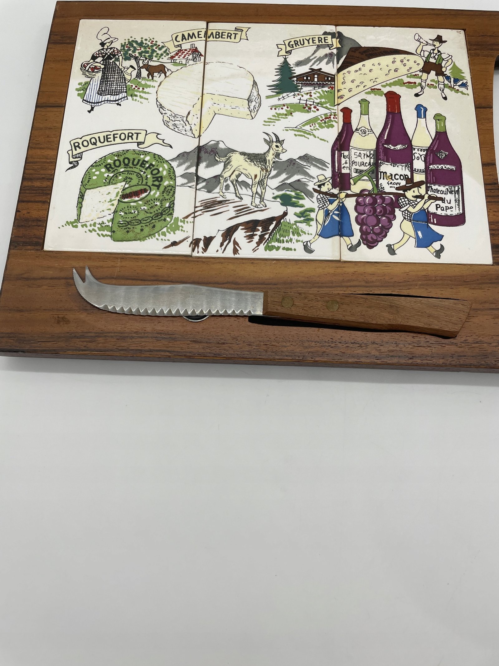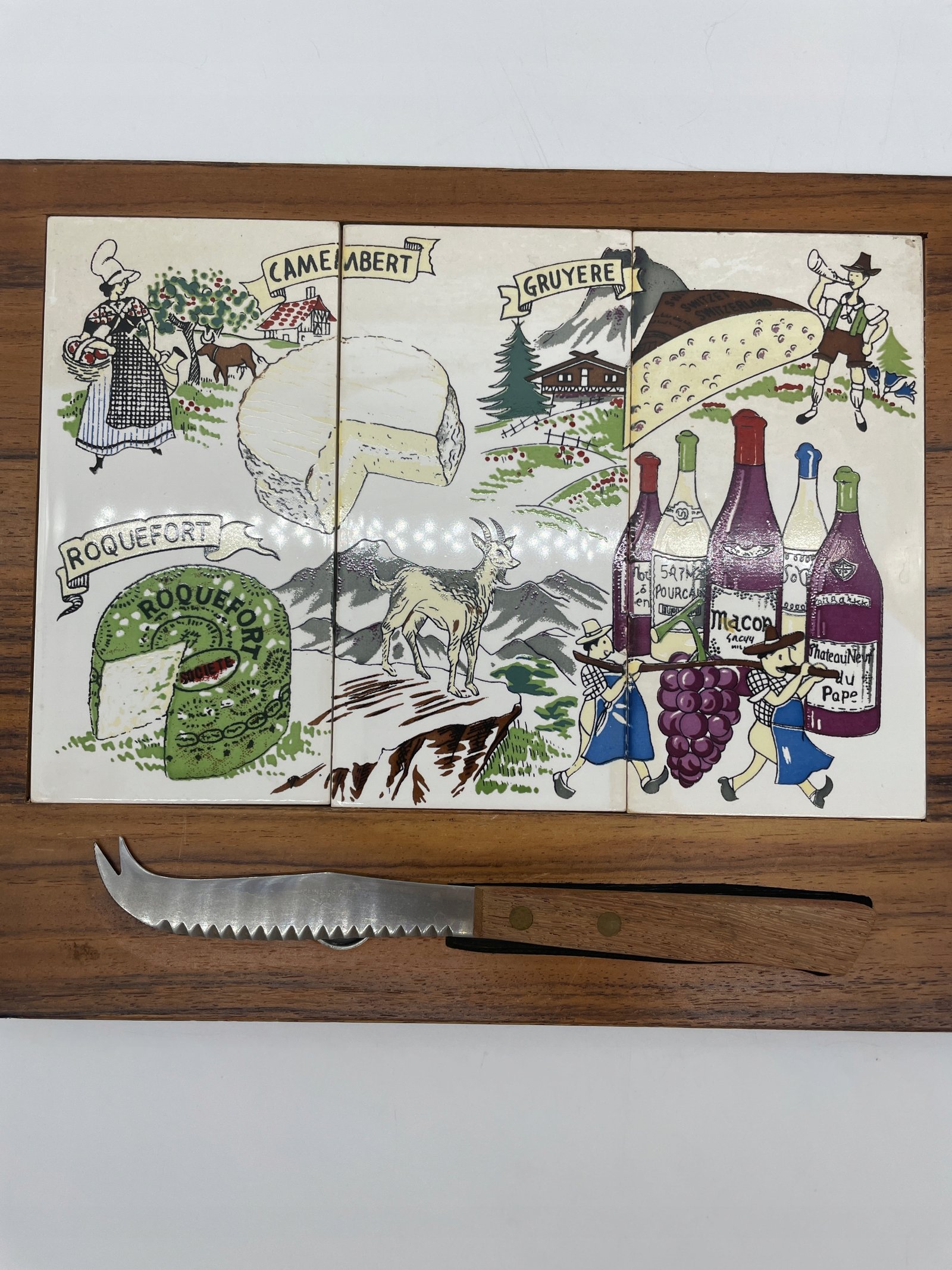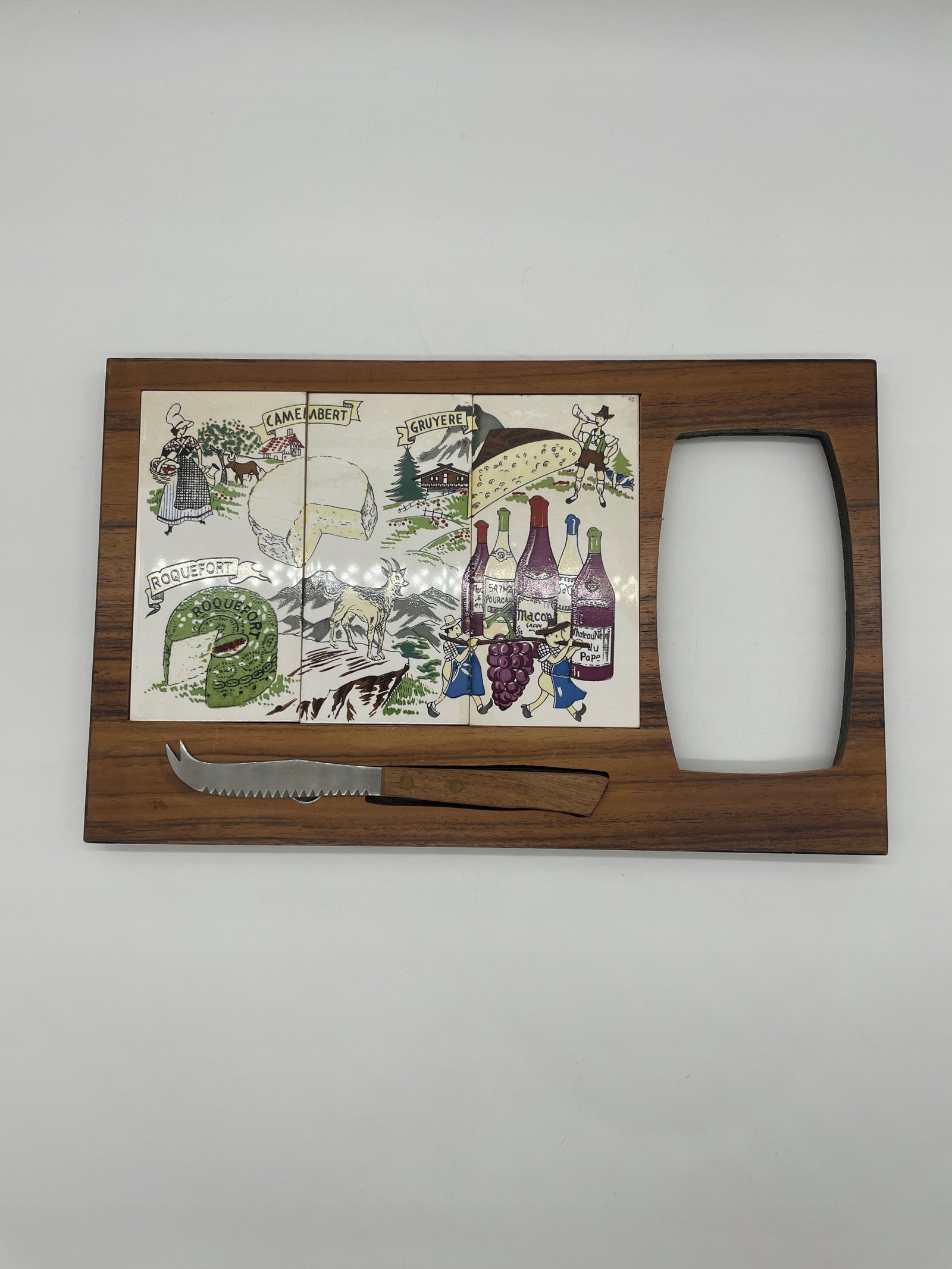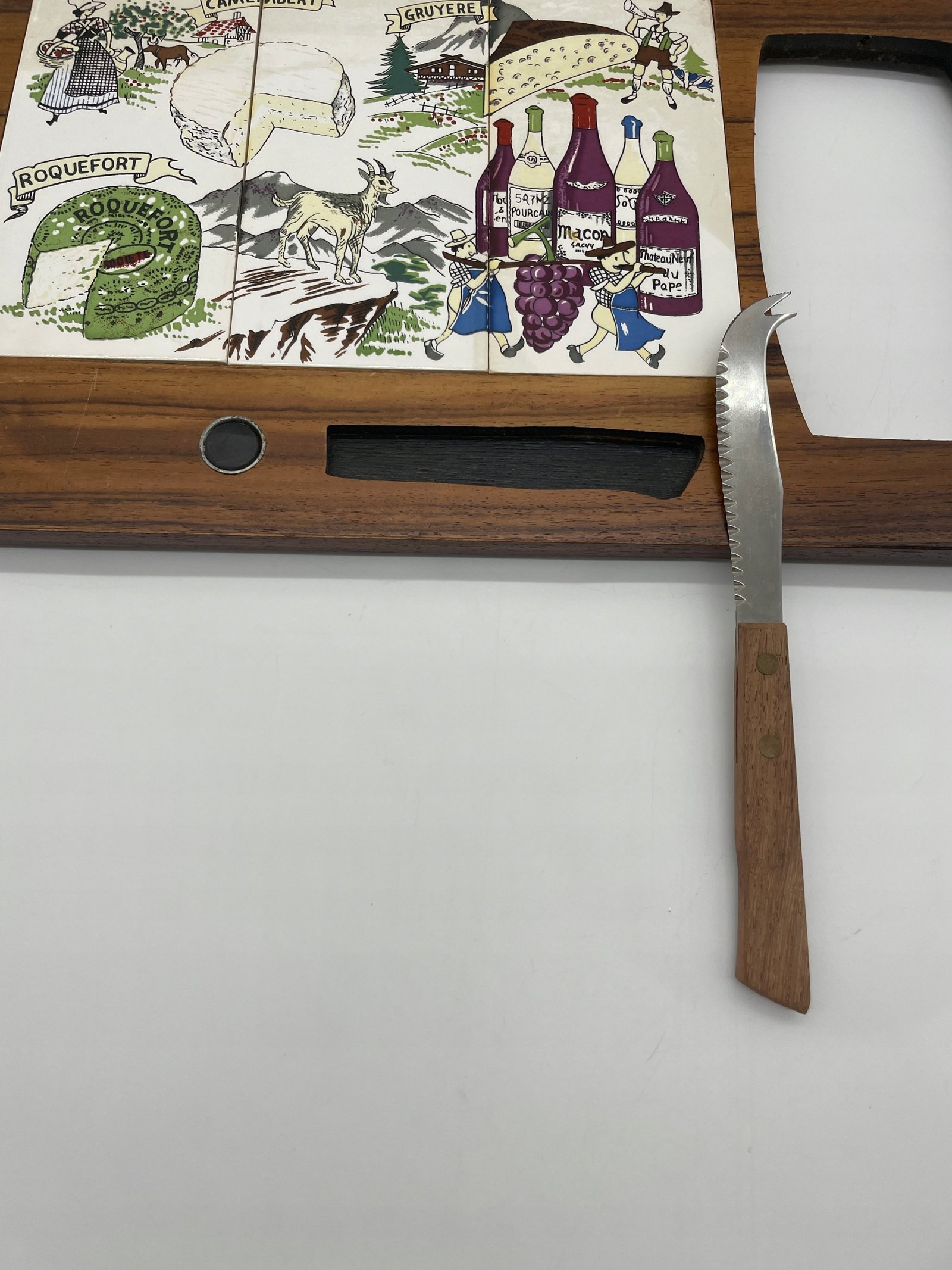 Deska do sera z nożem Francja 1970s z płytkami ceramicznymi