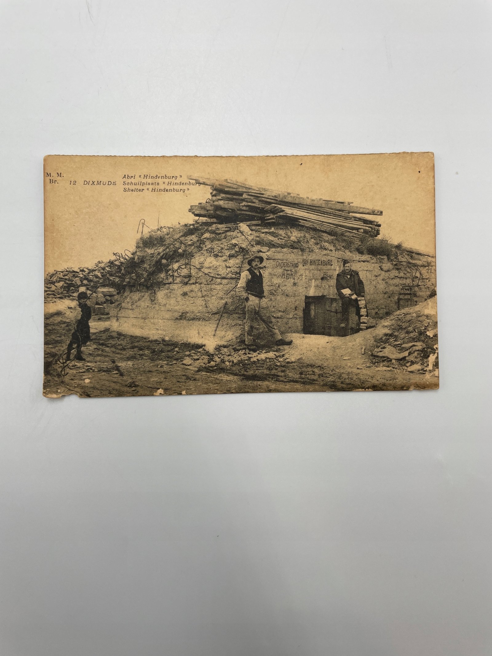 Oryginalna pocztówka przedstawiająca niemiecki schron „Hindenburg” z okresu I wojny światowej w okolicach miasta Diksmuide (Belgia). Na zdjęciu widać żołnierzy przy wejściu do ufortyfikowanego stanowiska, przykrytego darnią i drewnianymi belkami. Historyczny charakter i autentyczność potwierdza styl druku i grafika.