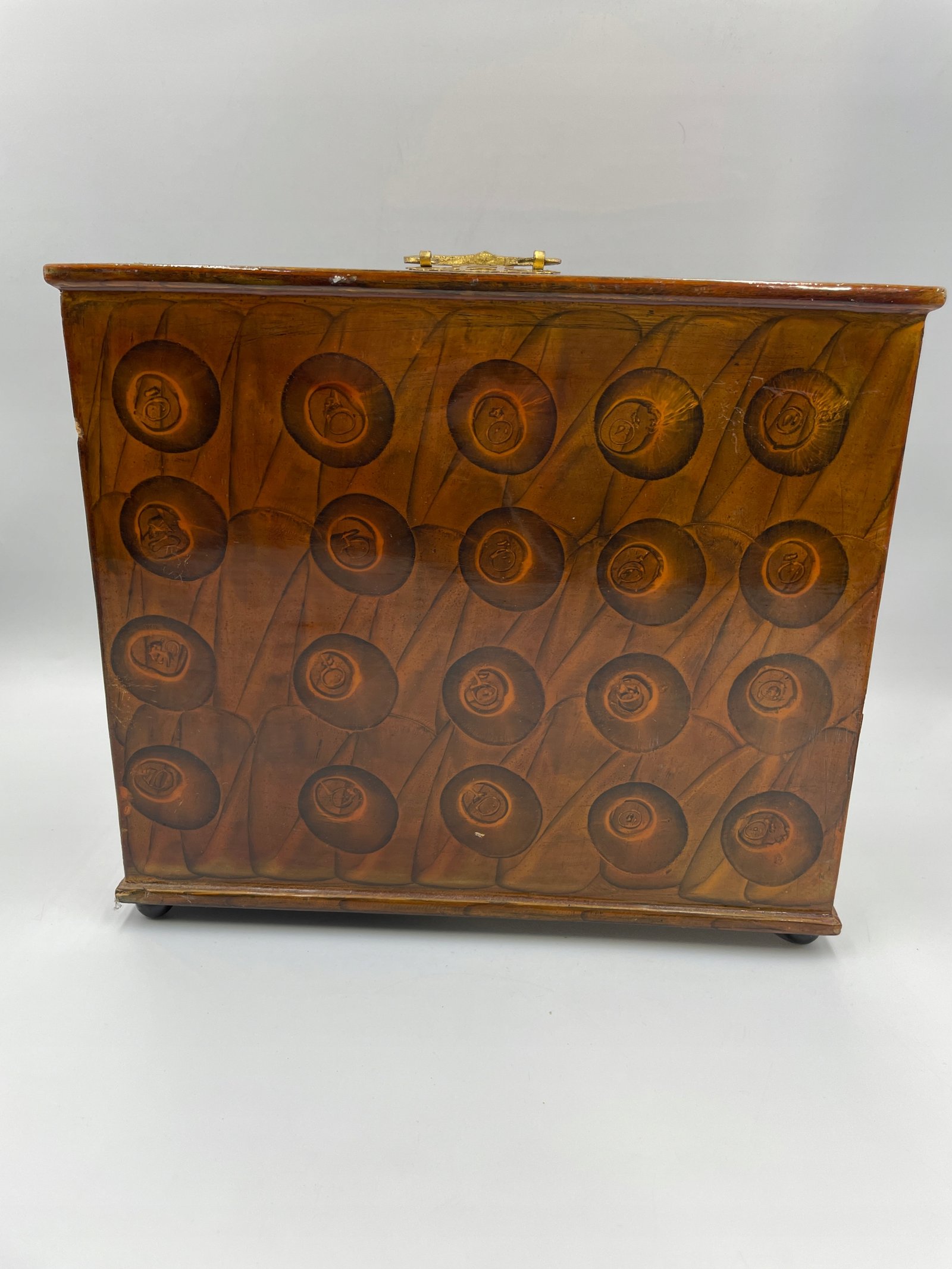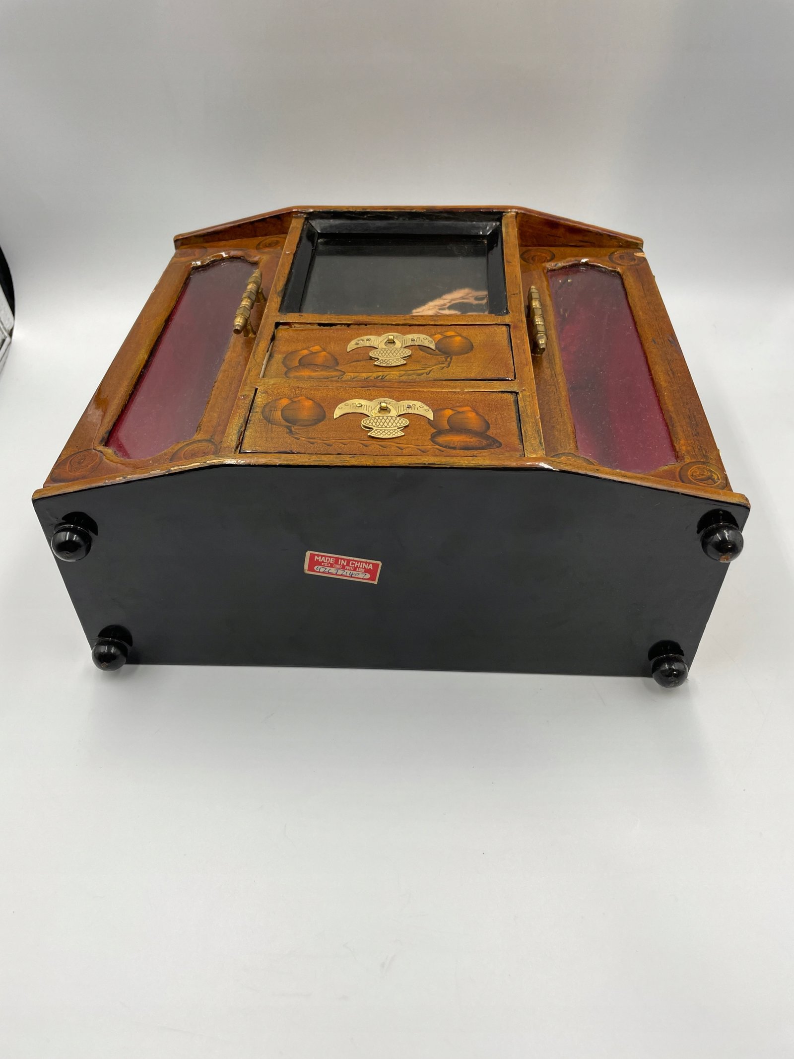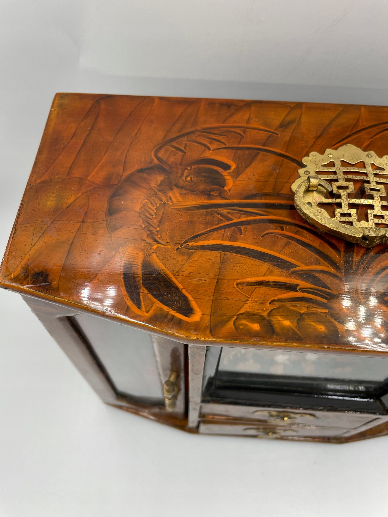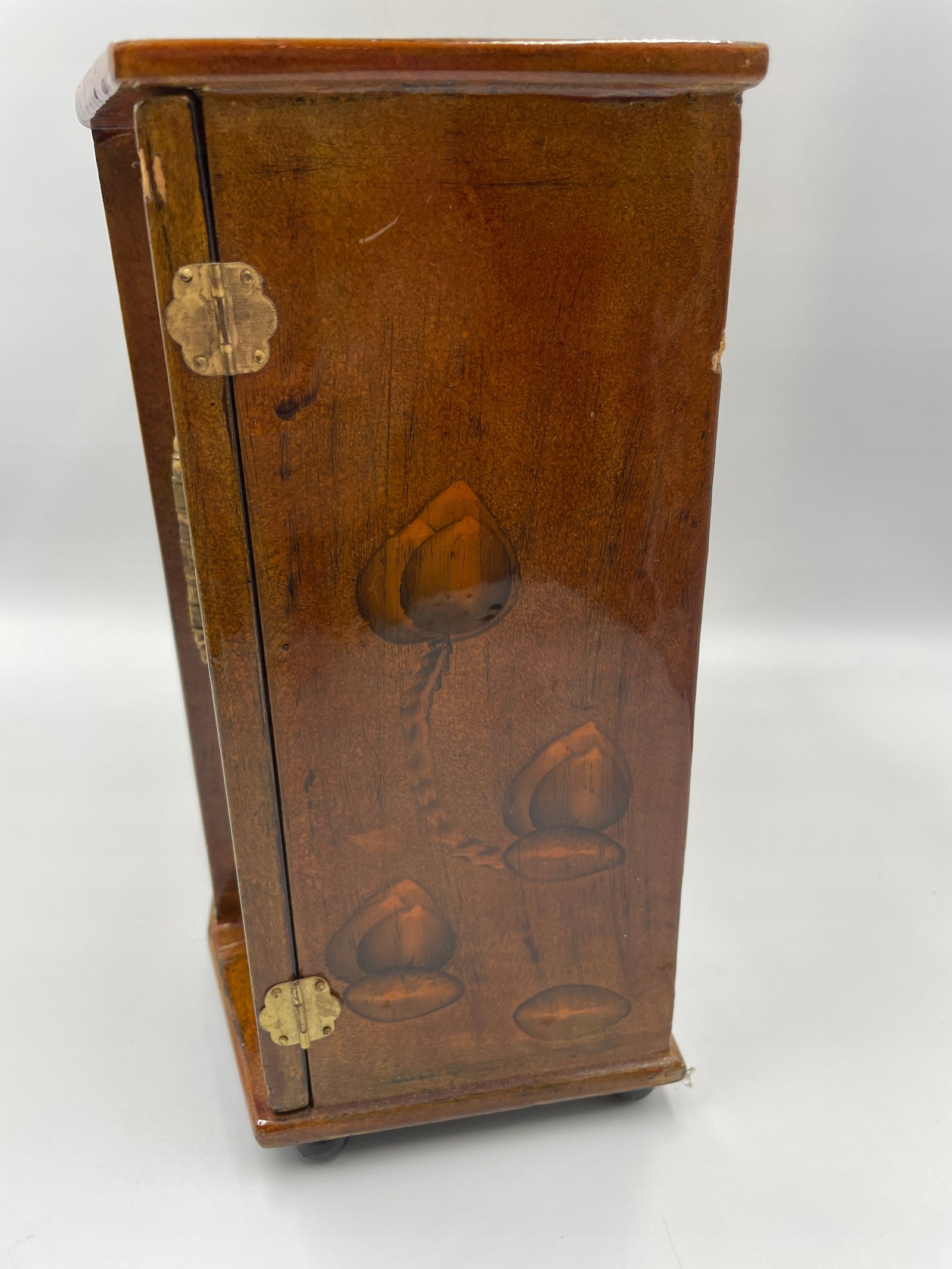 Wintydżowa drewniana szkatułka z Chin o rzadkim zdobieniu. Na całej powierzchni, w tym na bokach i tyle, znajduje się malunek pod lakierem: kwiaty magnolii oraz modliszka na pokrywie. W centralnej części, za szkłem, umieszczona jest trójwymiarowa rzeźba w drewnie przedstawiająca pagodę, postacie ludzkie i rozłożyste drzewo, tworząca efekt miniaturowego pejzażu. Wnętrze wykończone czerwonym aksamitem, z dwiema wysuwanymi szufladkami i metalowym okuciem. Unikalność przedmiotu polega na połączeniu ornamentu roślinnego, symbolicznego owada oraz przestrzennej rzeźby.