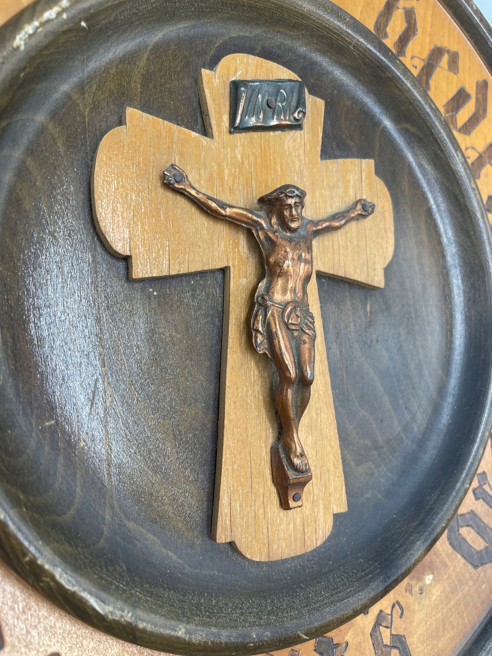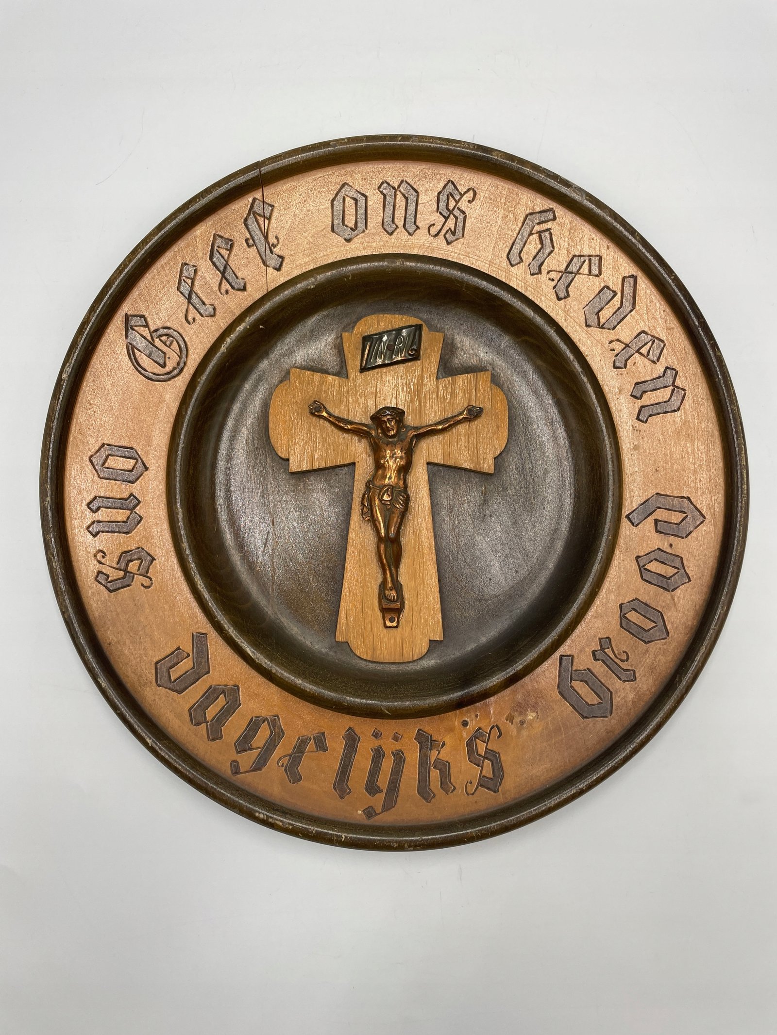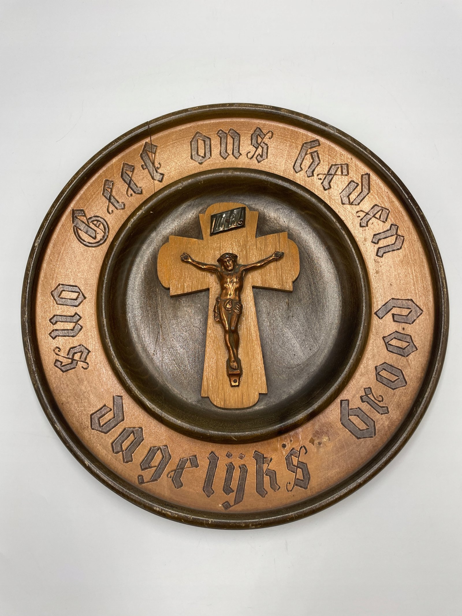 Dekoracyjna płaskorzeźba sakralna wykonana z drewna, przedstawiająca krucyfiks z figurą Chrystusa w centralnej części. Wokół widnieje inskrypcja w języku niderlandzkim: „Geef ons heden ons dagelijks brood”, co oznacza „Daj nam dzisiaj naszego powszedniego chleba”. Centralny krzyż oraz figura Chrystusa wykonane są z metalu w kolorze brązu, co dodaje kompozycji wyrazistości.