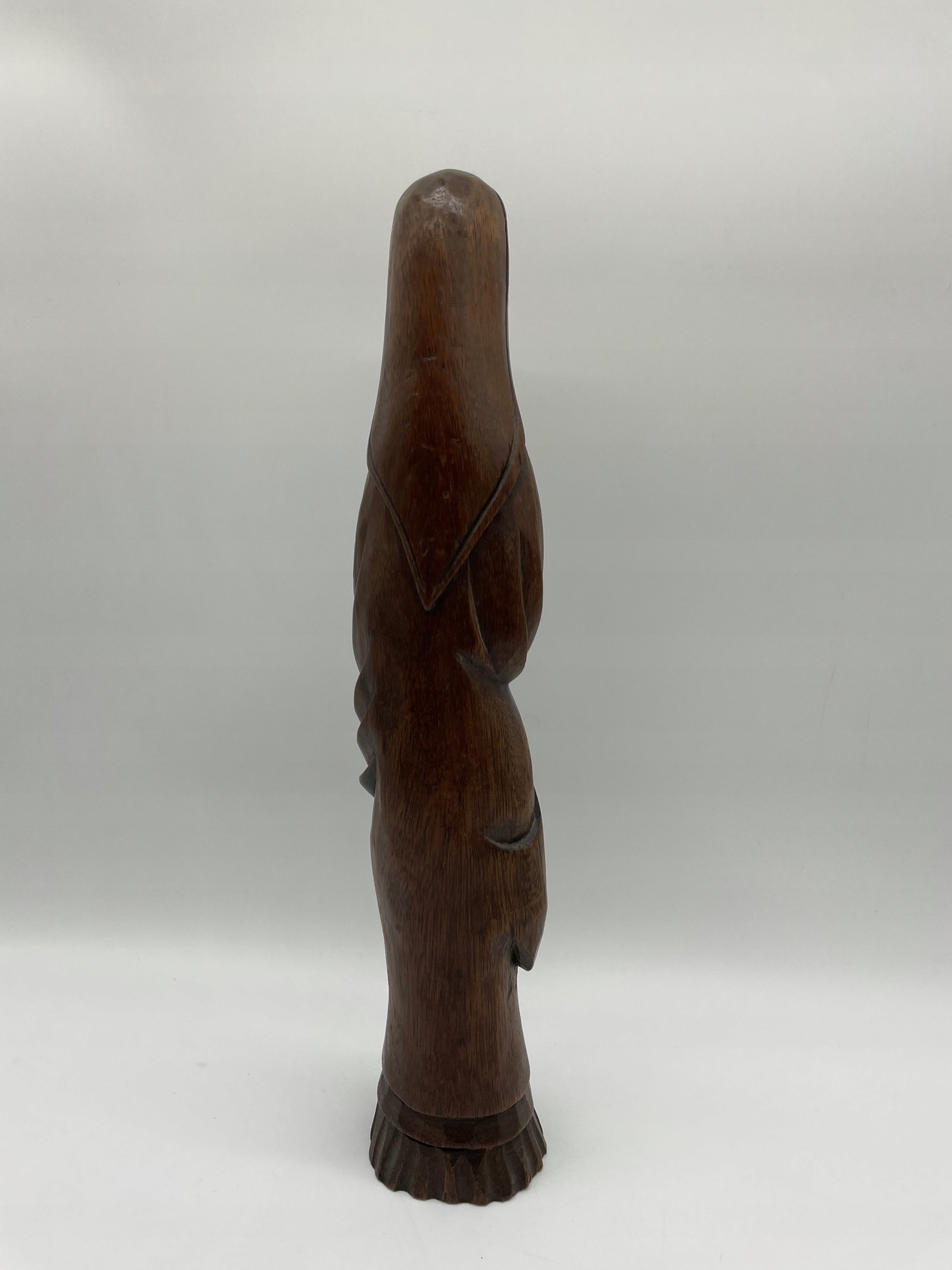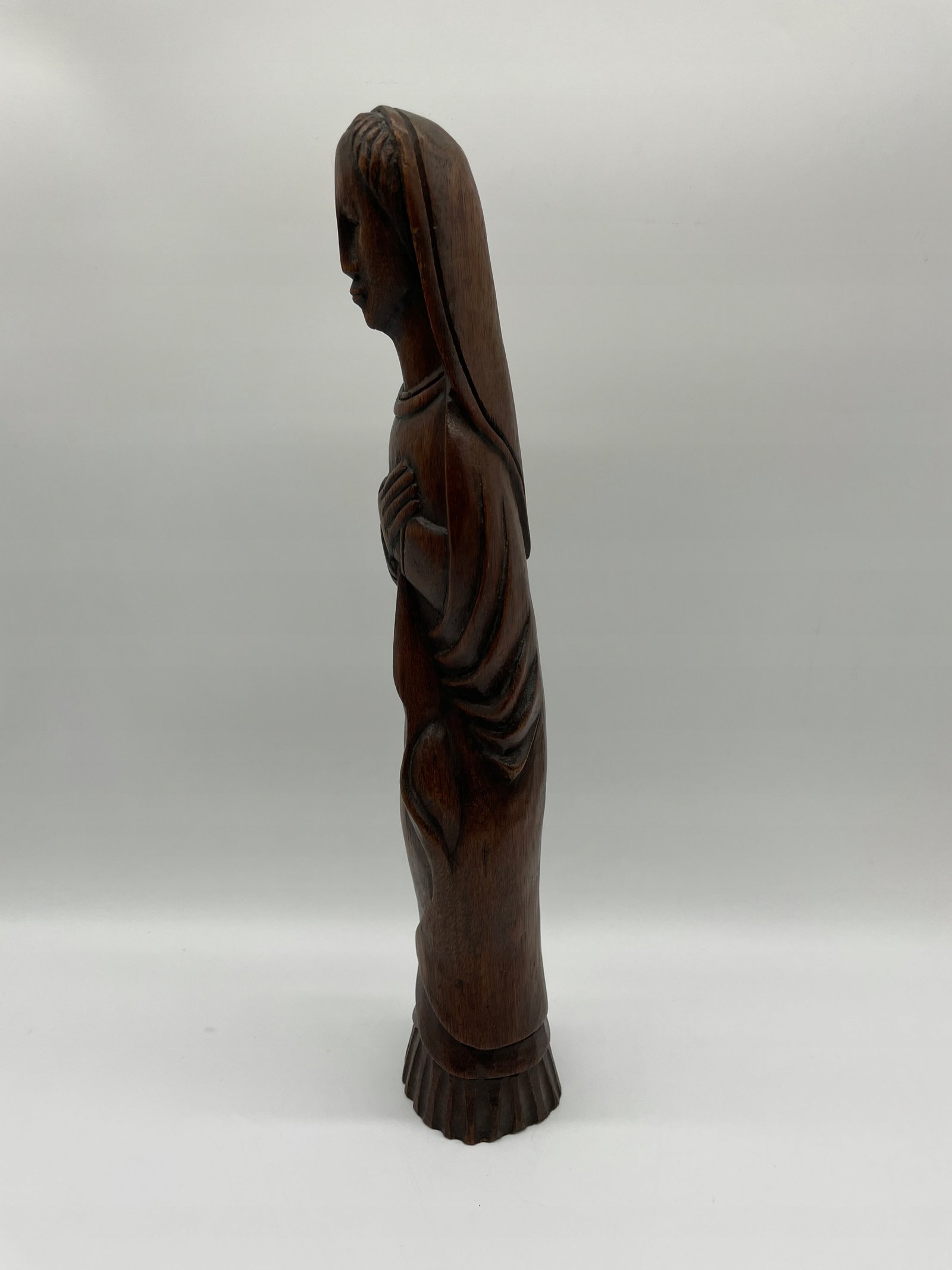 Pięknie wykonana rzeźba z drewna przedstawiająca stojącą postać kobiety z dłońmi złożonymi na piersi. Może symbolizować postać religijną lub kobiecą figurę w tradycyjnym, stylizowanym ujęciu. Ciepły odcień drewna i delikatna linia rzeźby tworzą spokojną, elegancką kompozycję.