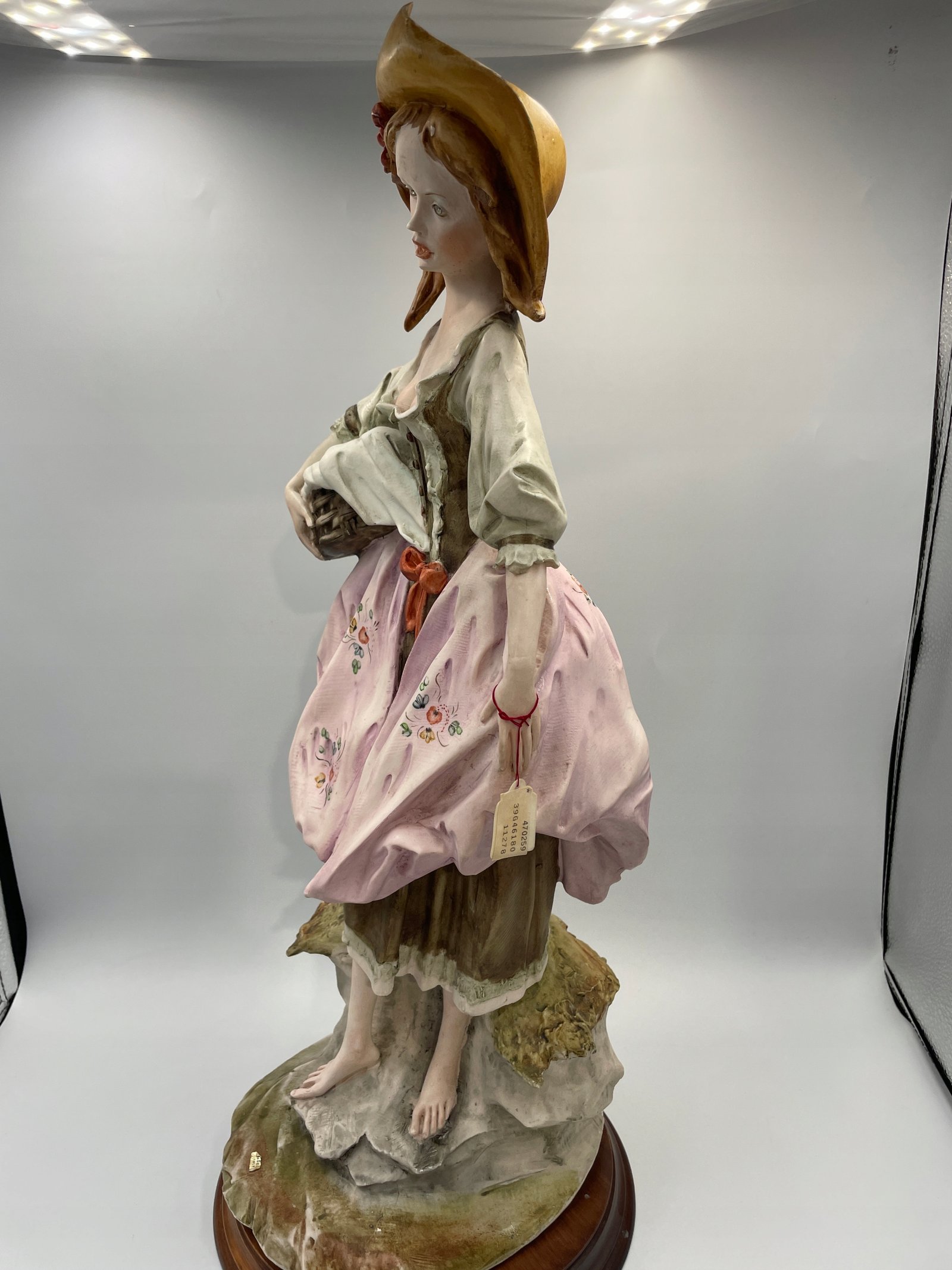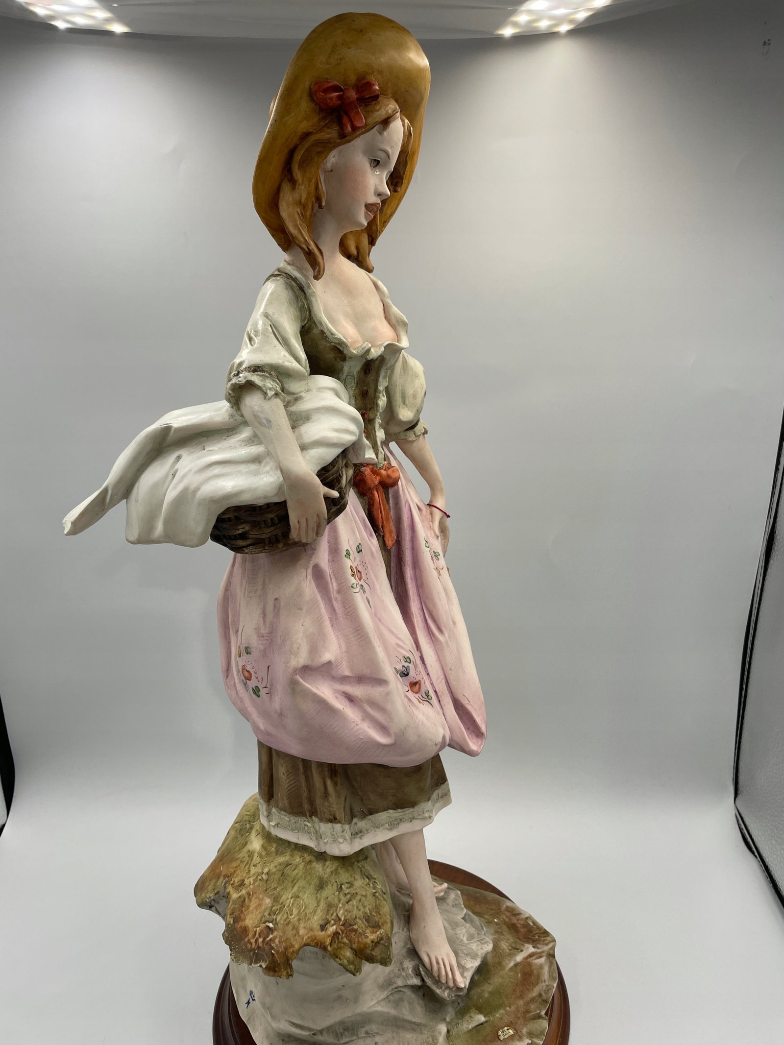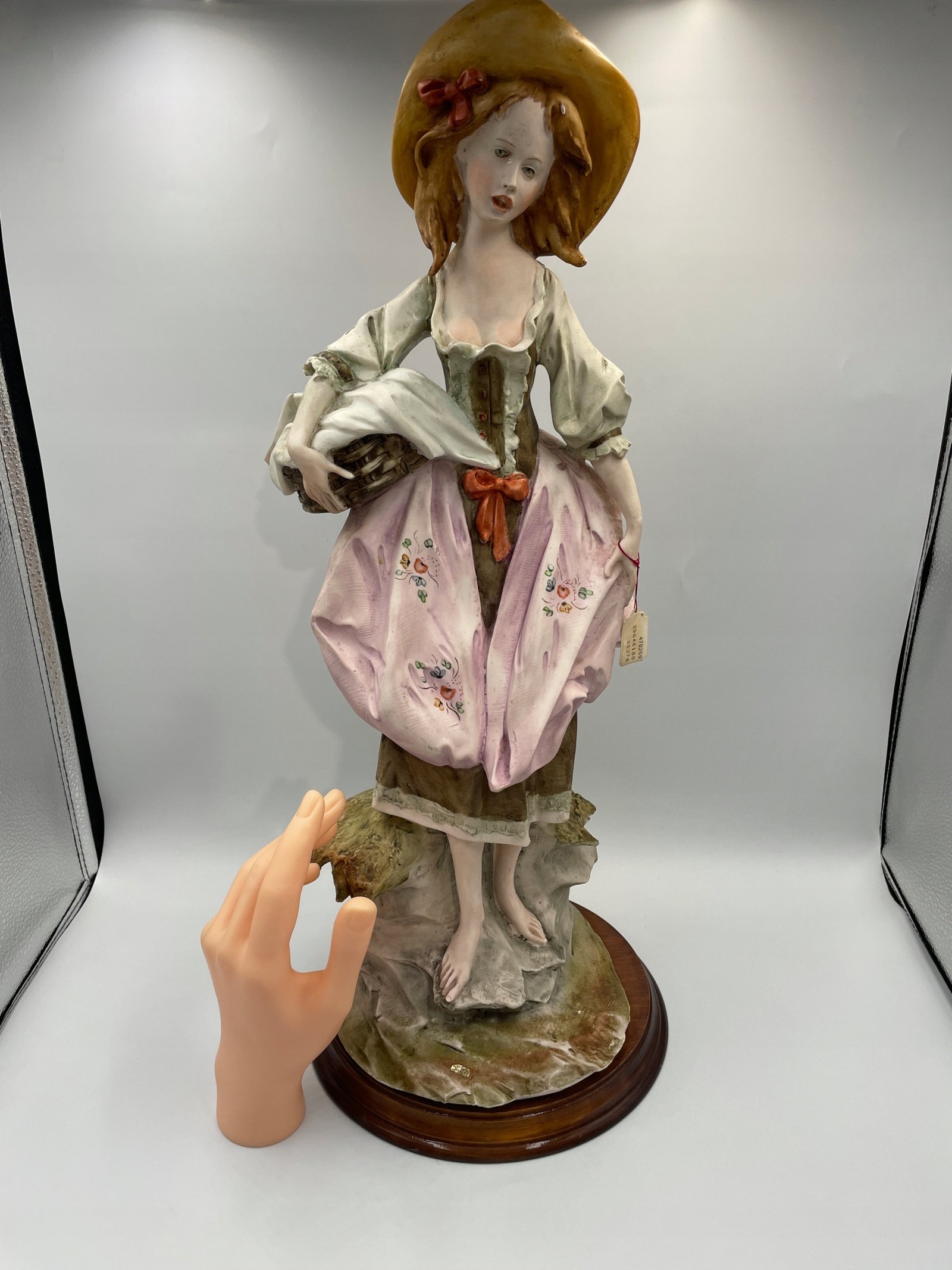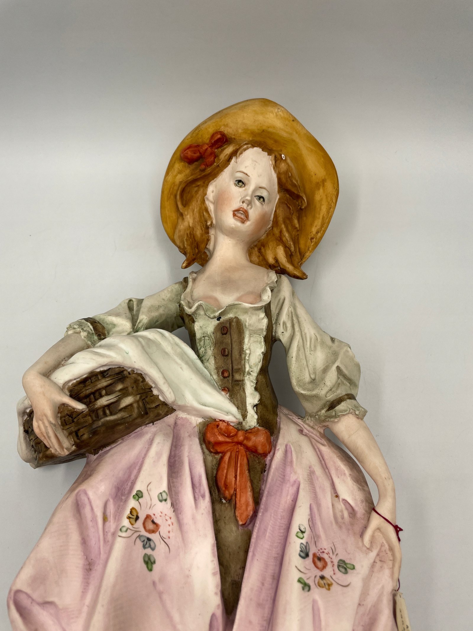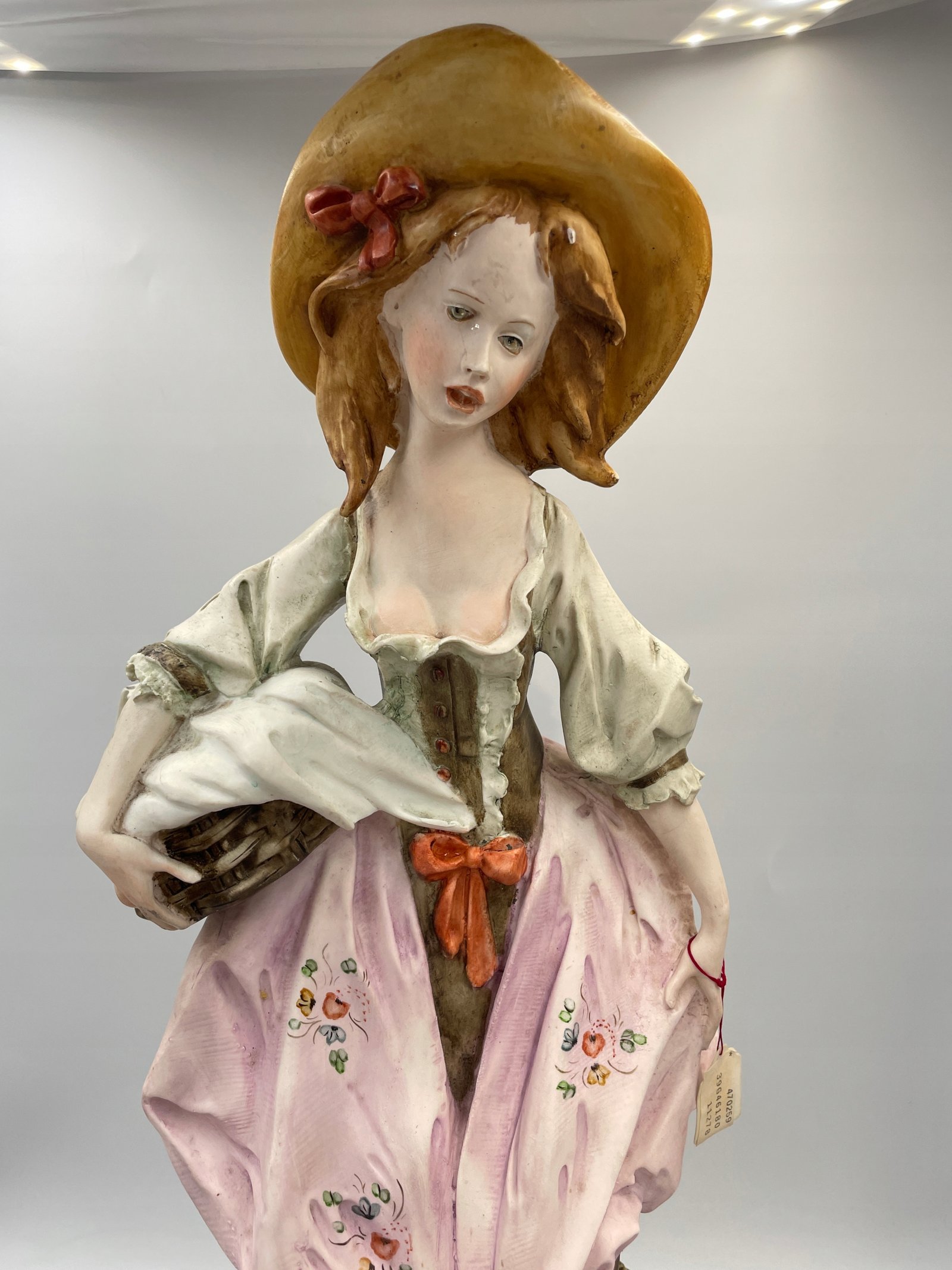 Rzadka, duża figurka porcelanowa Capodimonte, wykonana z typową dla tej manufaktury precyzją i subtelnym, malarskim wykończeniem. Przedstawia elegancką młodą kobietę w kapeluszu z szerokim rondem, ubraną w tradycyjną suknię i fartuch, trzymającą przed sobą złożoną bieliznę. Draperia ubioru oraz delikatne fałdy materiału zostały oddane z wyjątkową starannością, podkreślając kunszt rzeźbiarza.