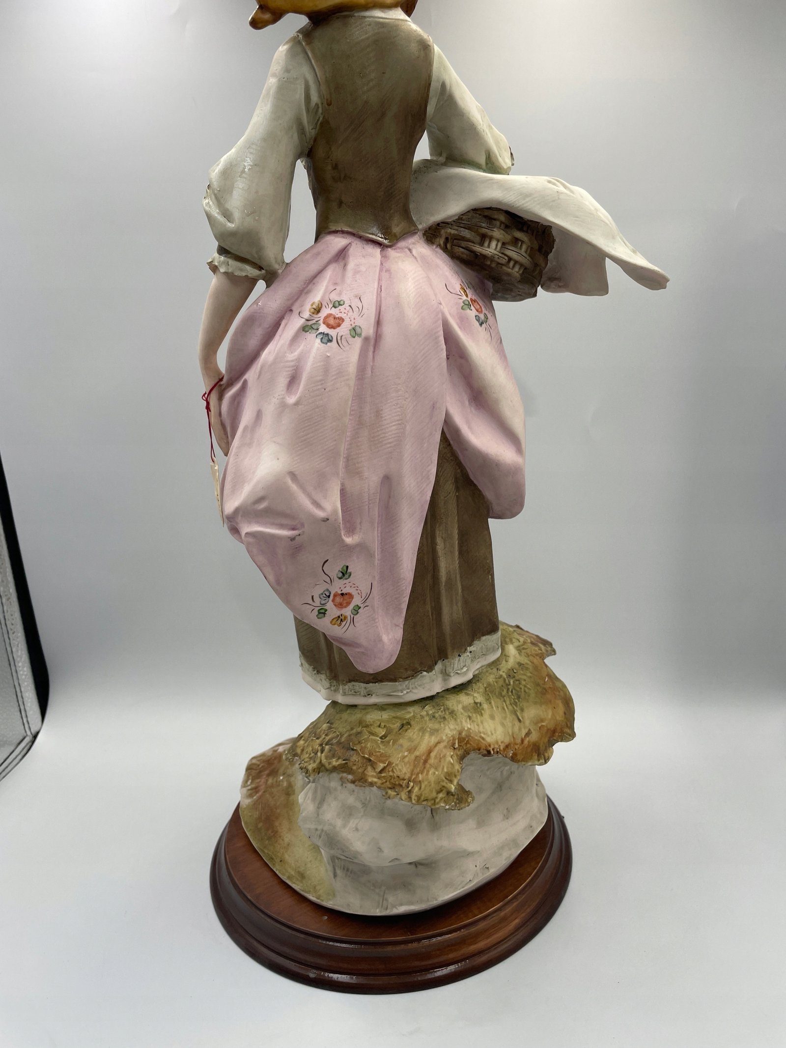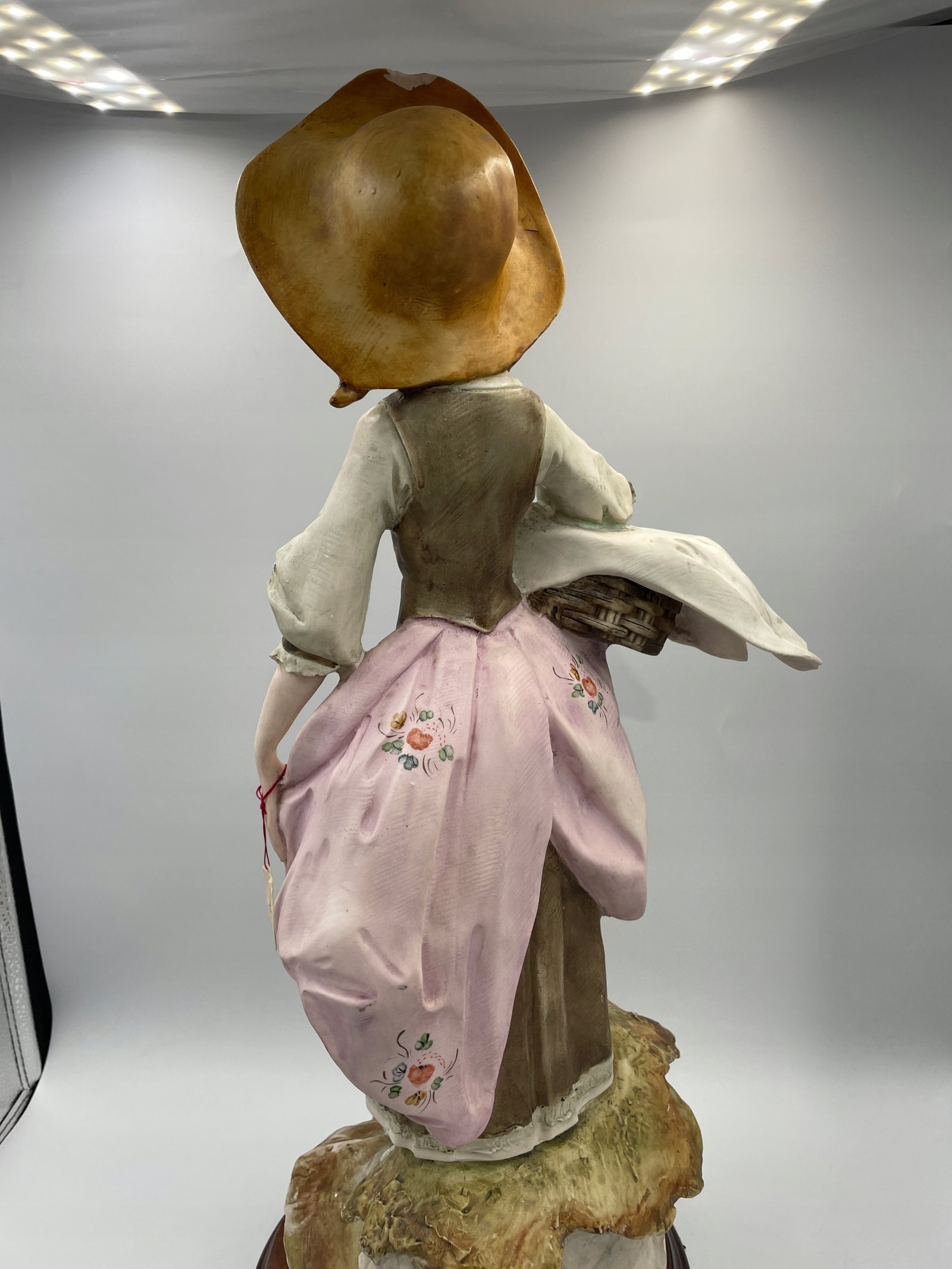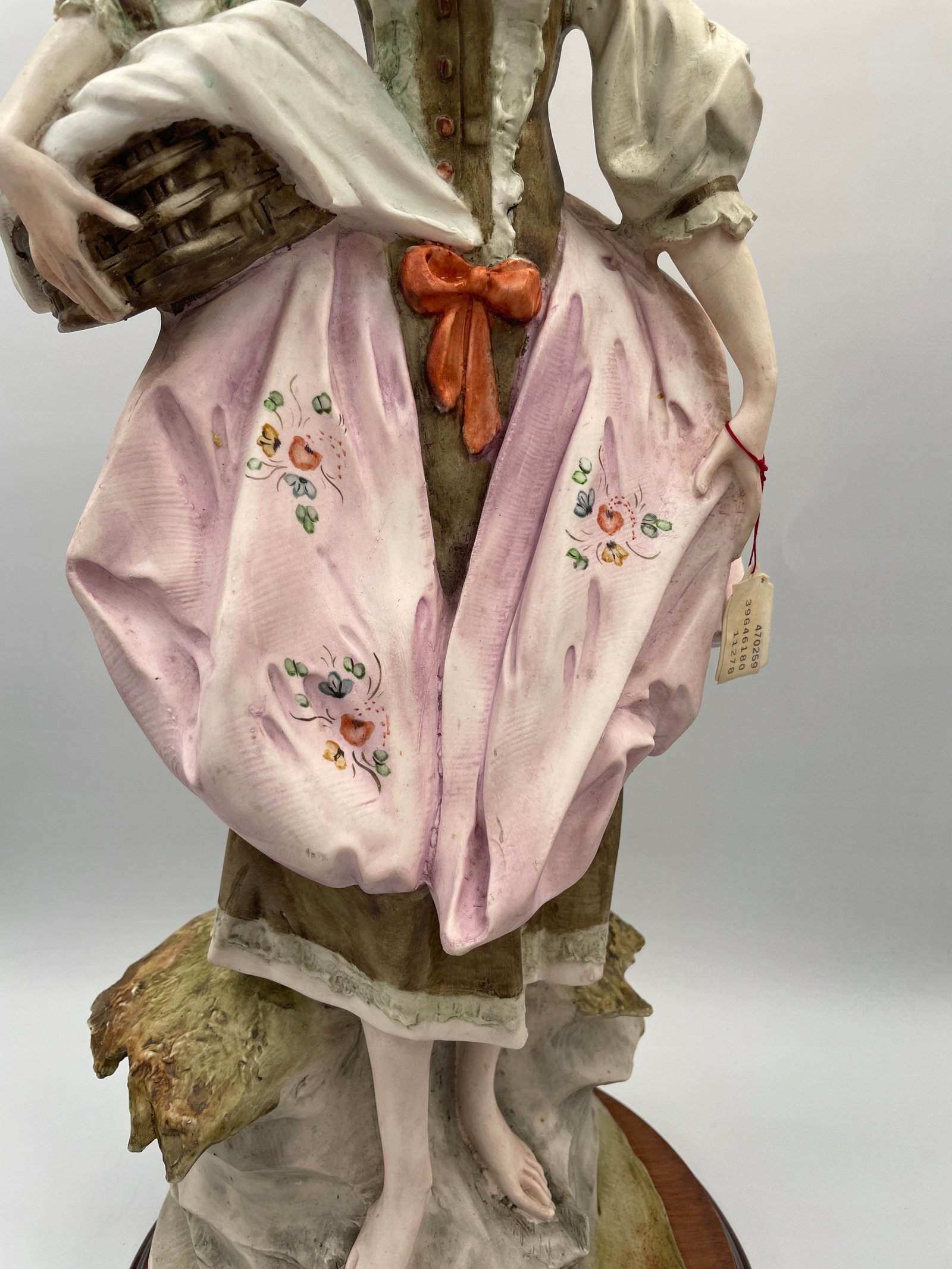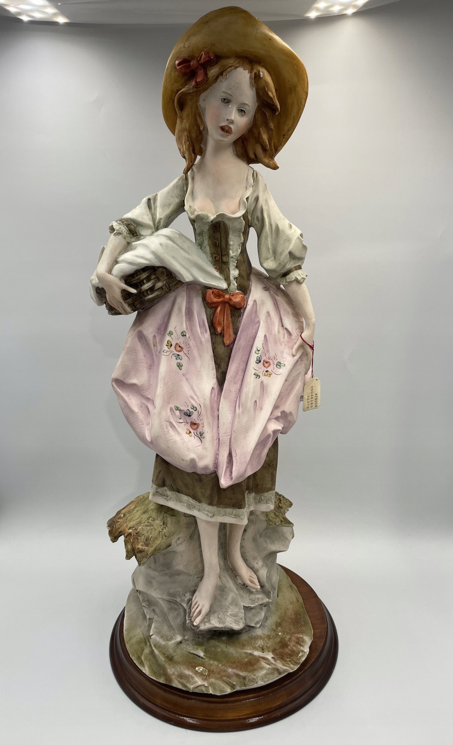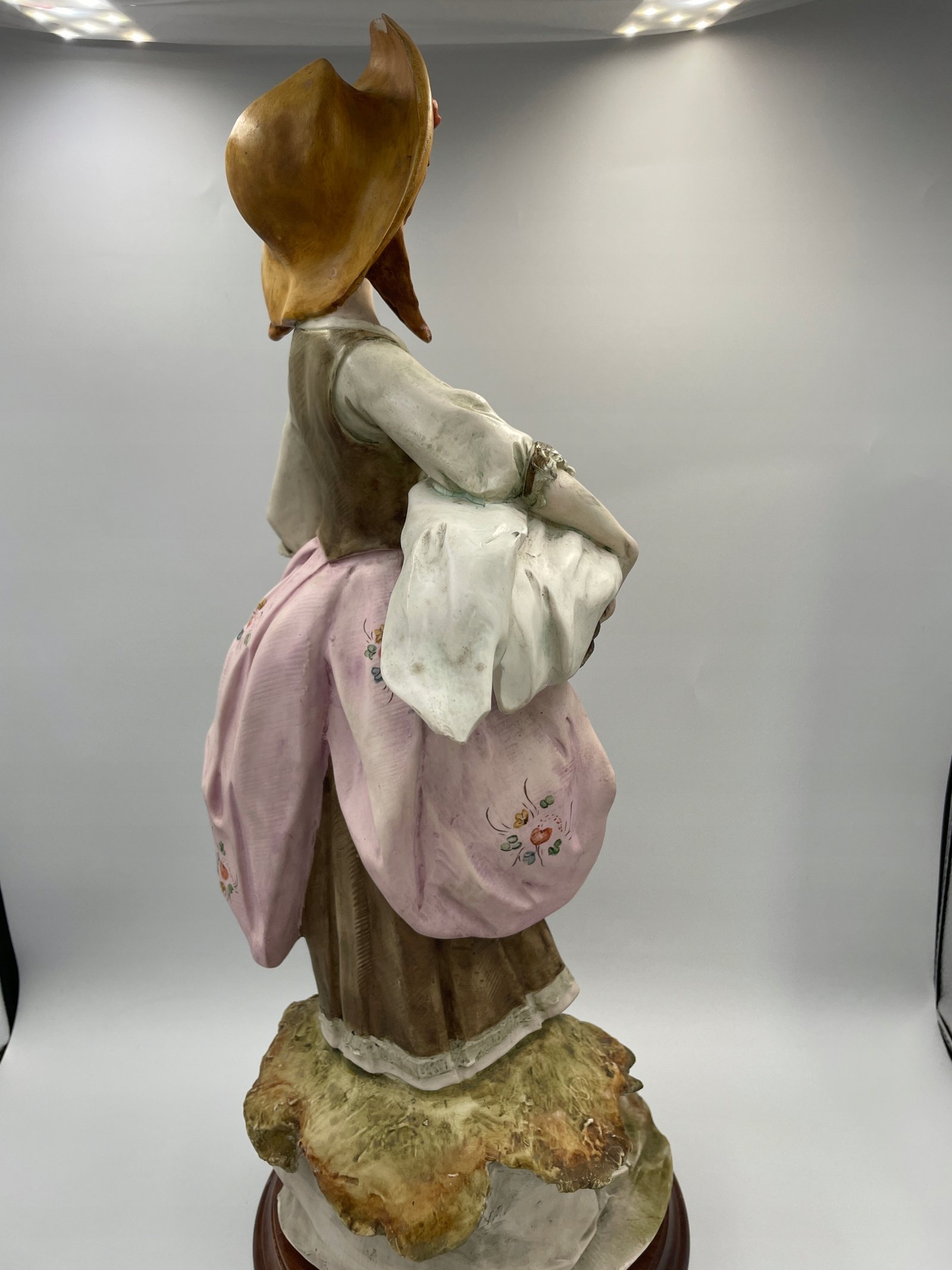 Rzadka, duża figurka porcelanowa Capodimonte, wykonana z typową dla tej manufaktury precyzją i subtelnym, malarskim wykończeniem. Przedstawia elegancką młodą kobietę w kapeluszu z szerokim rondem, ubraną w tradycyjną suknię i fartuch, trzymającą przed sobą złożoną bieliznę. Draperia ubioru oraz delikatne fałdy materiału zostały oddane z wyjątkową starannością, podkreślając kunszt rzeźbiarza.