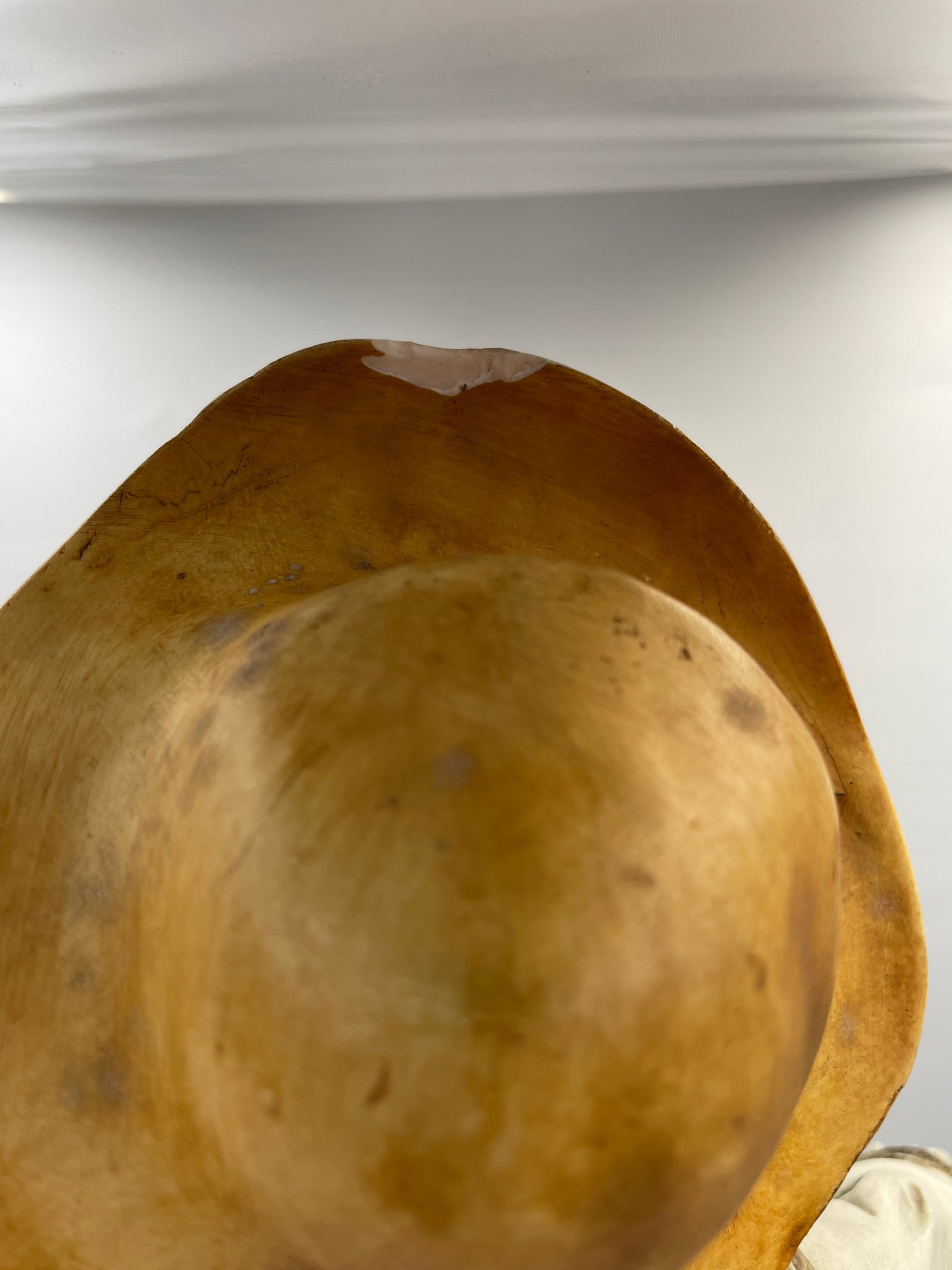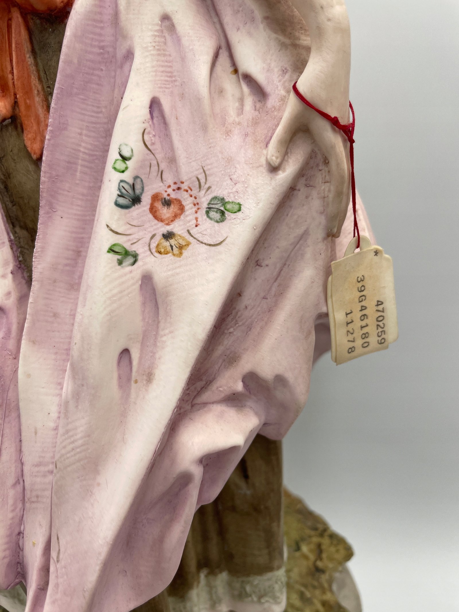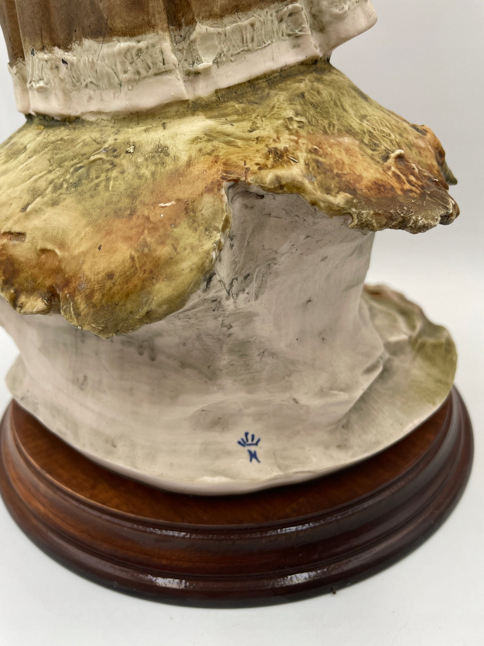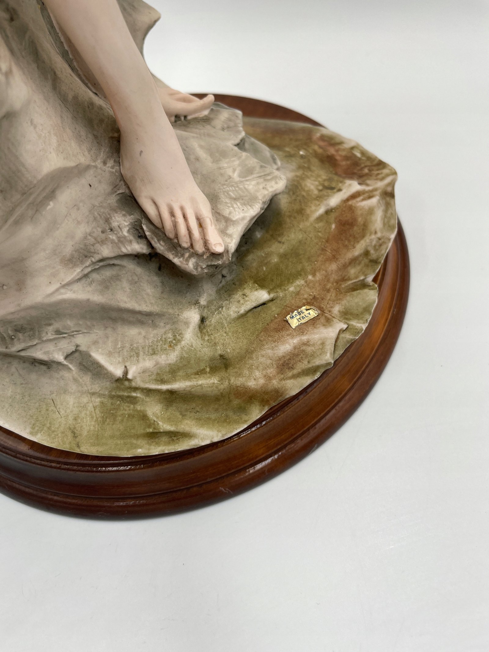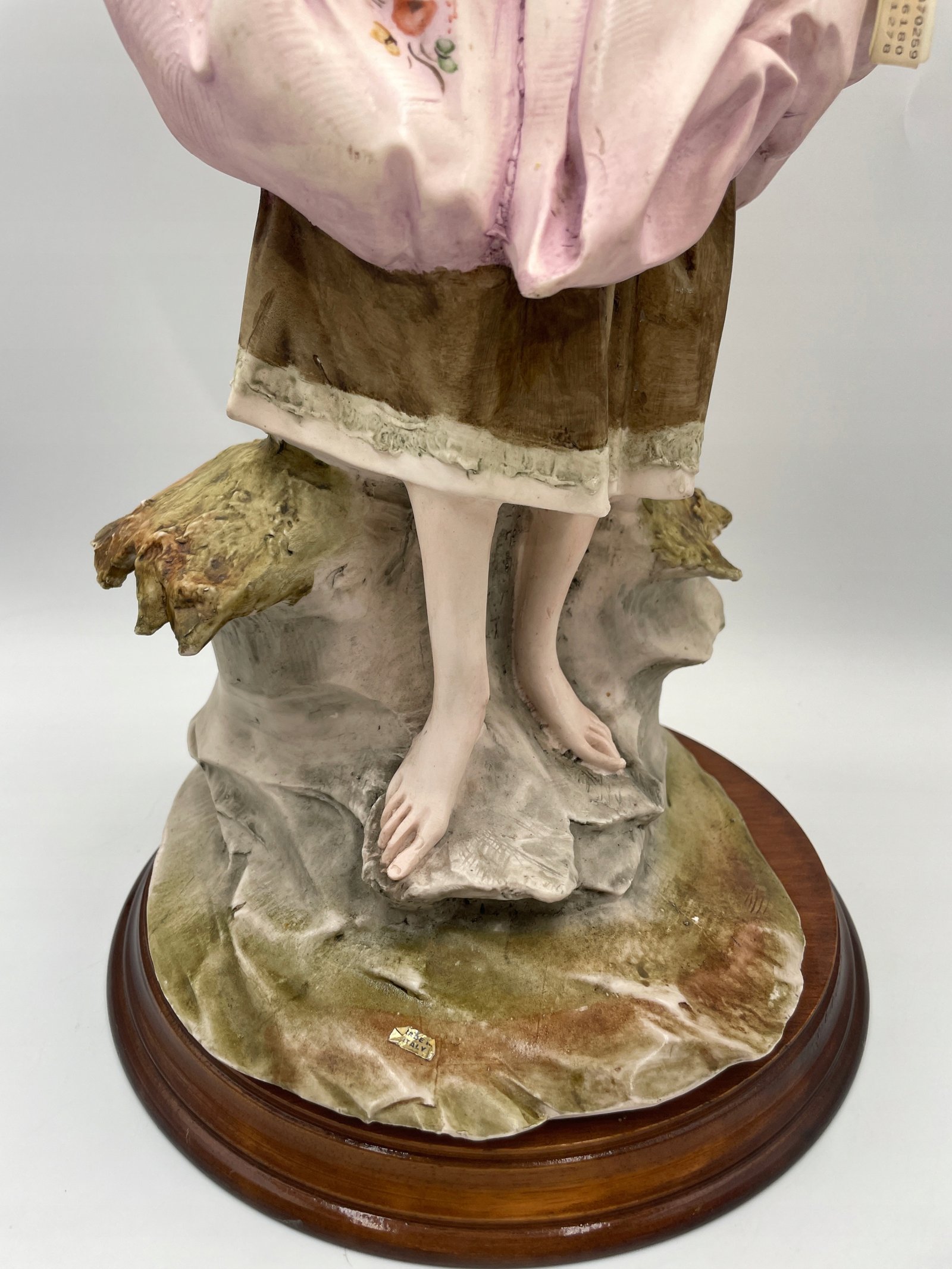 Rzadka, duża figurka porcelanowa Capodimonte, wykonana z typową dla tej manufaktury precyzją i subtelnym, malarskim wykończeniem. Przedstawia elegancką młodą kobietę w kapeluszu z szerokim rondem, ubraną w tradycyjną suknię i fartuch, trzymającą przed sobą złożoną bieliznę. Draperia ubioru oraz delikatne fałdy materiału zostały oddane z wyjątkową starannością, podkreślając kunszt rzeźbiarza.