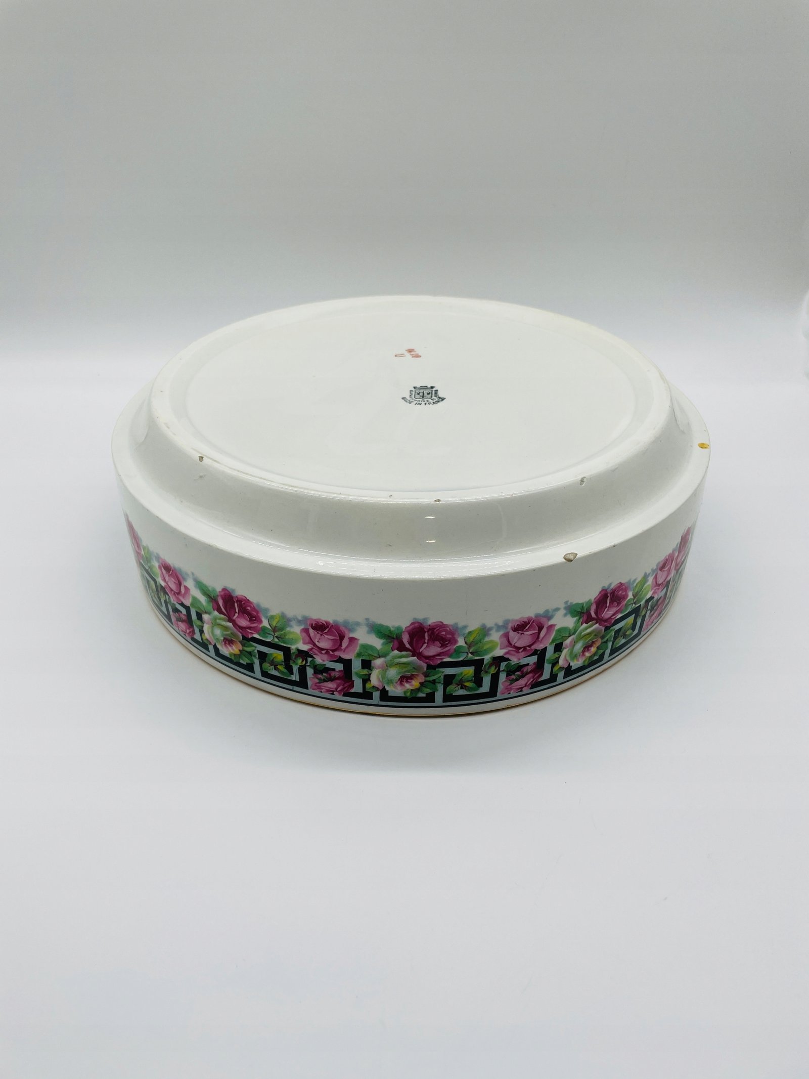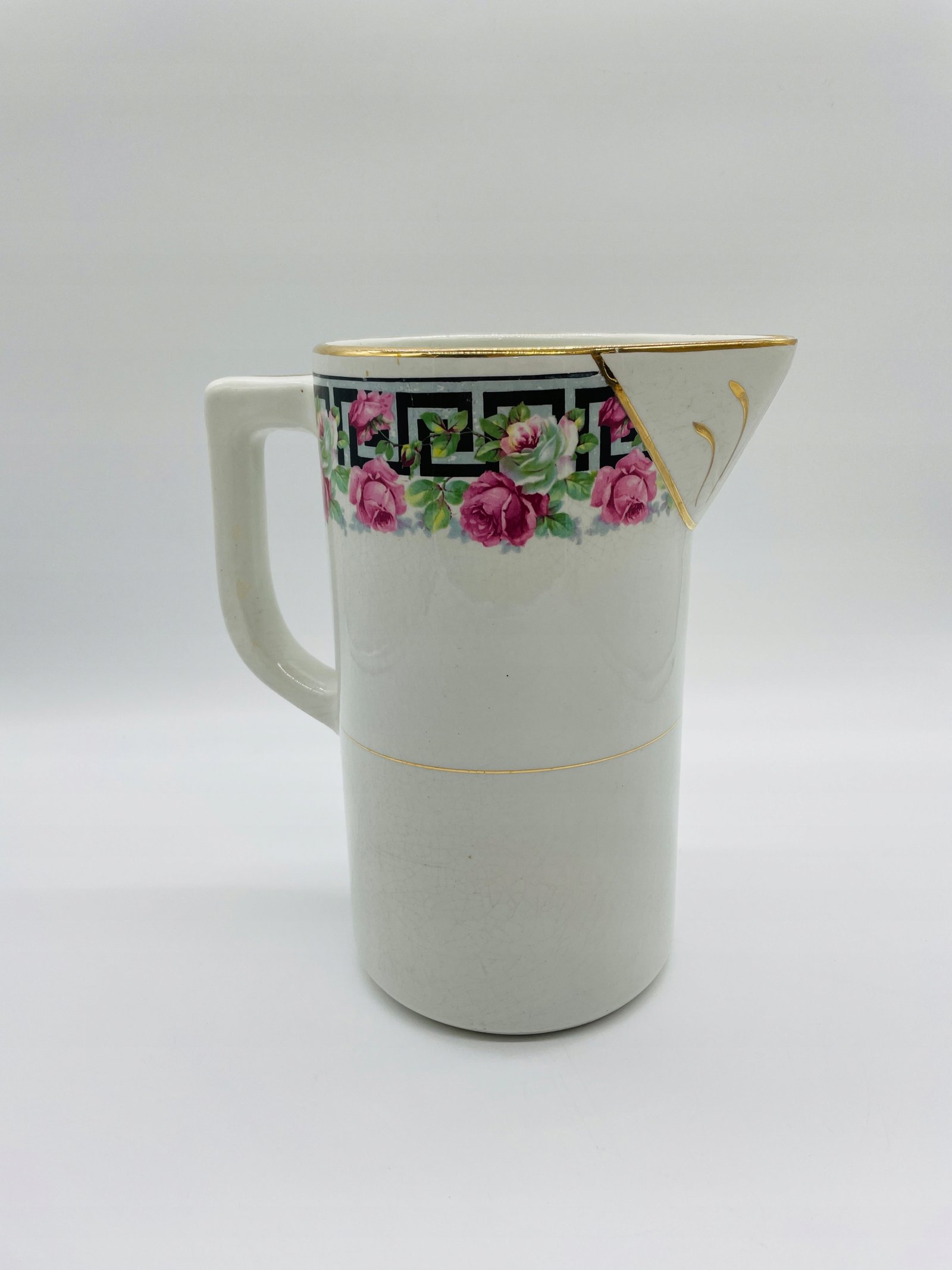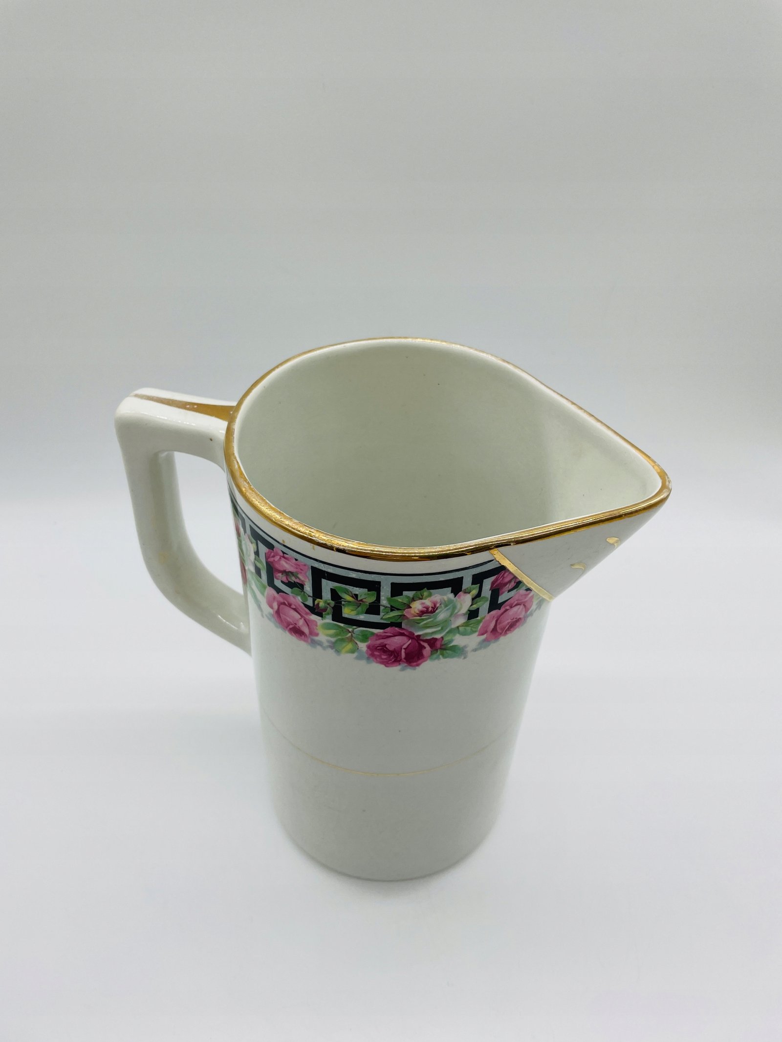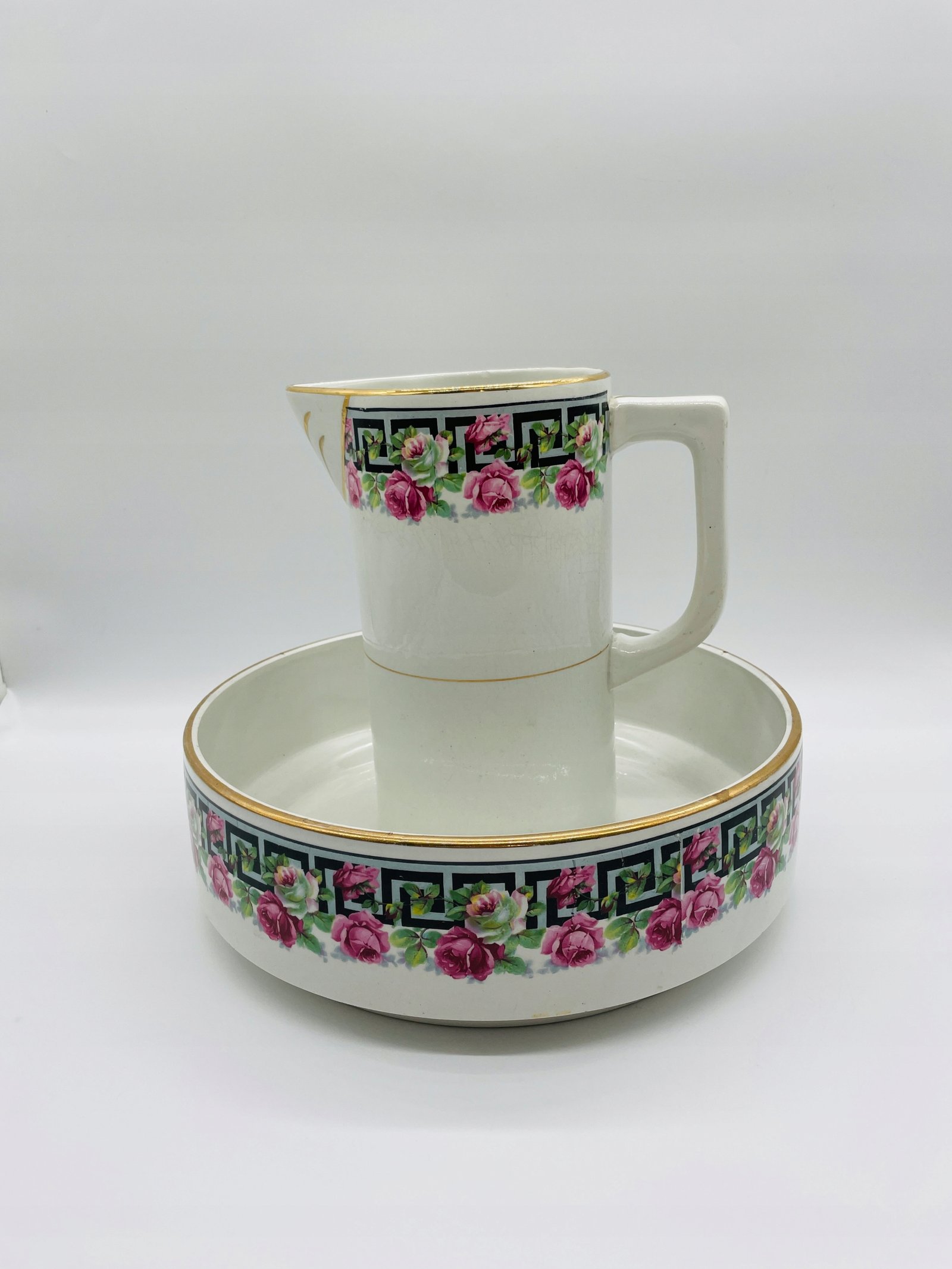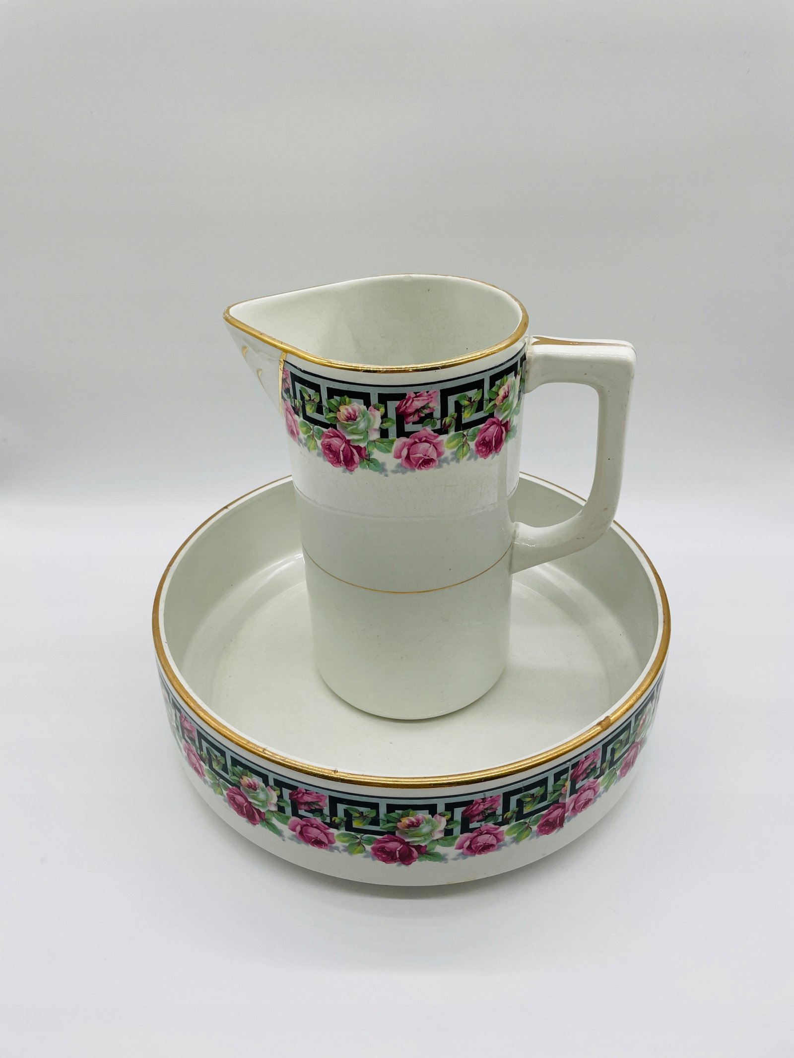 Zestaw do mycia z fajansu – dzbanek i misa dekorowane fryzem z róż na tle geometrycznego ornamentu w kolorach zieleni i czerni. Złocone obramowania i detale. Oznaczenie „St. Amand Dinoise Made in France” wskazuje na wytwórnię fajansu Saint-Amand z regionu Nord. Forma i dekor pozwalają datować przedmiot na lata 30. XX wieku.