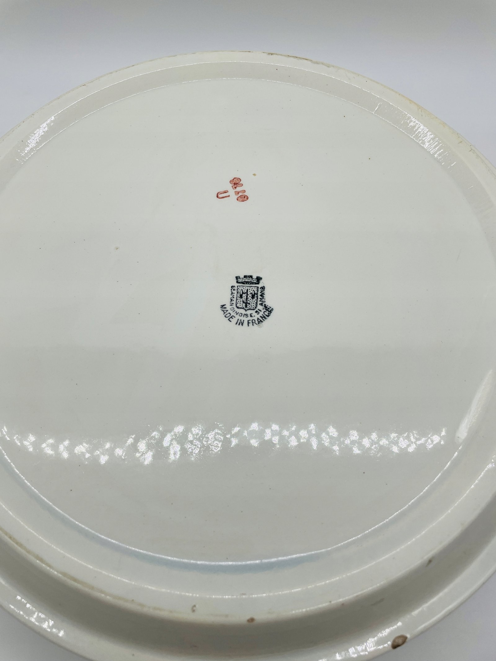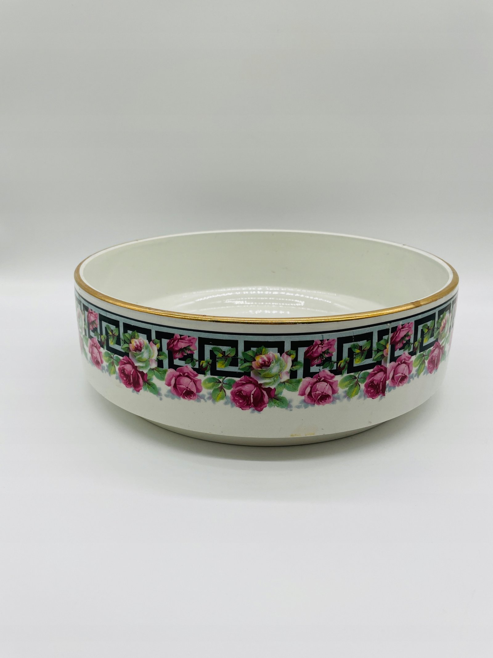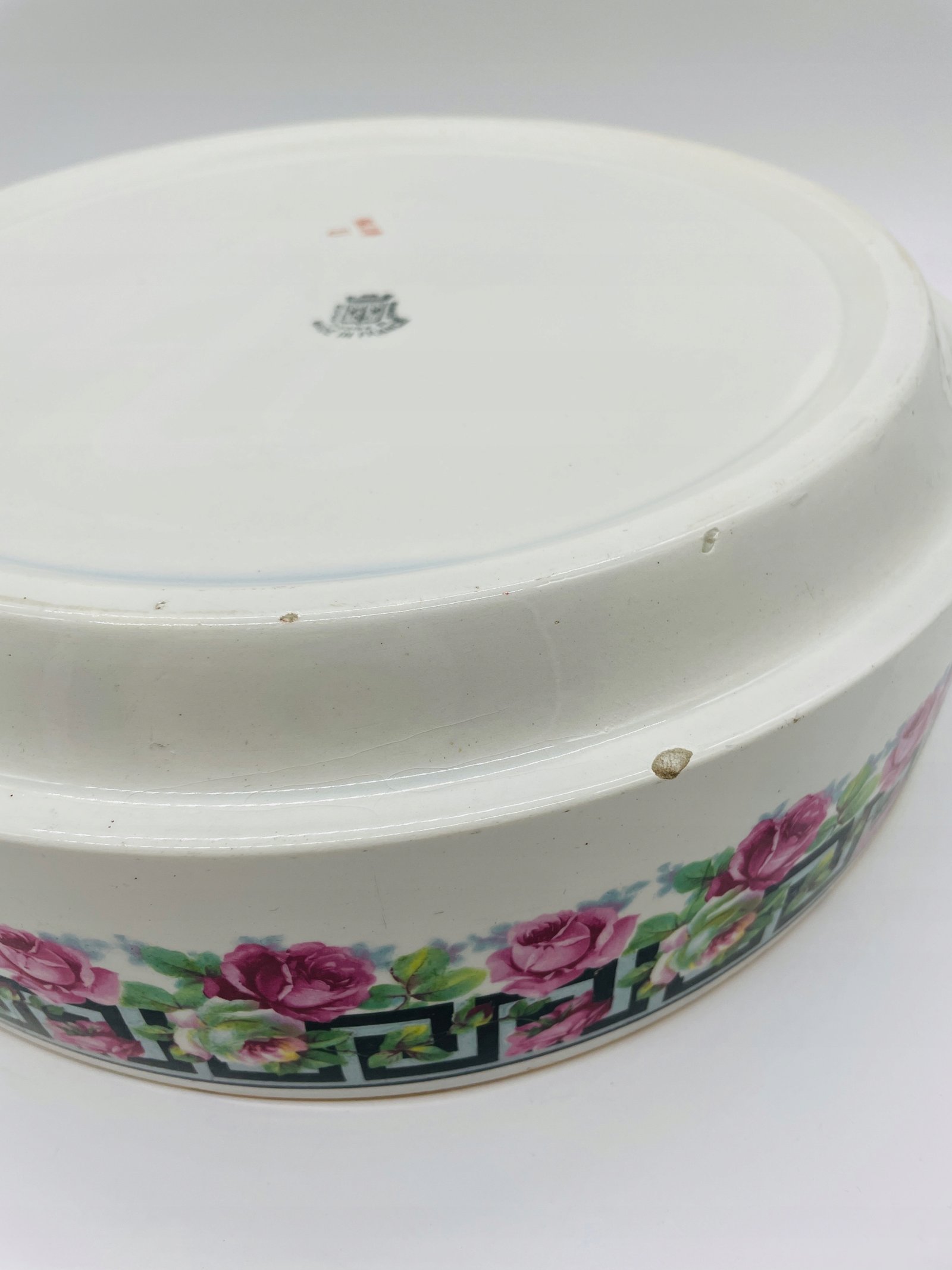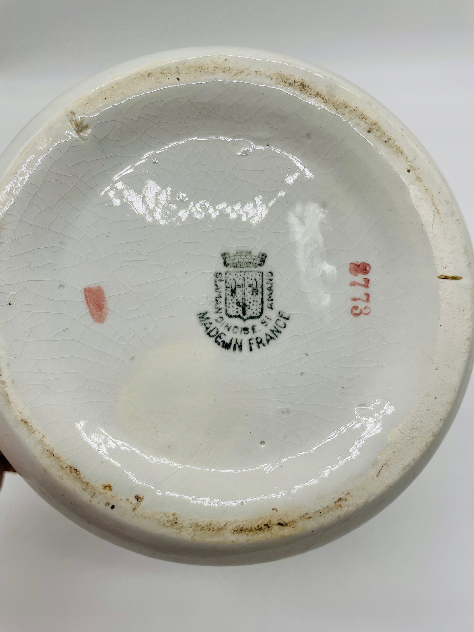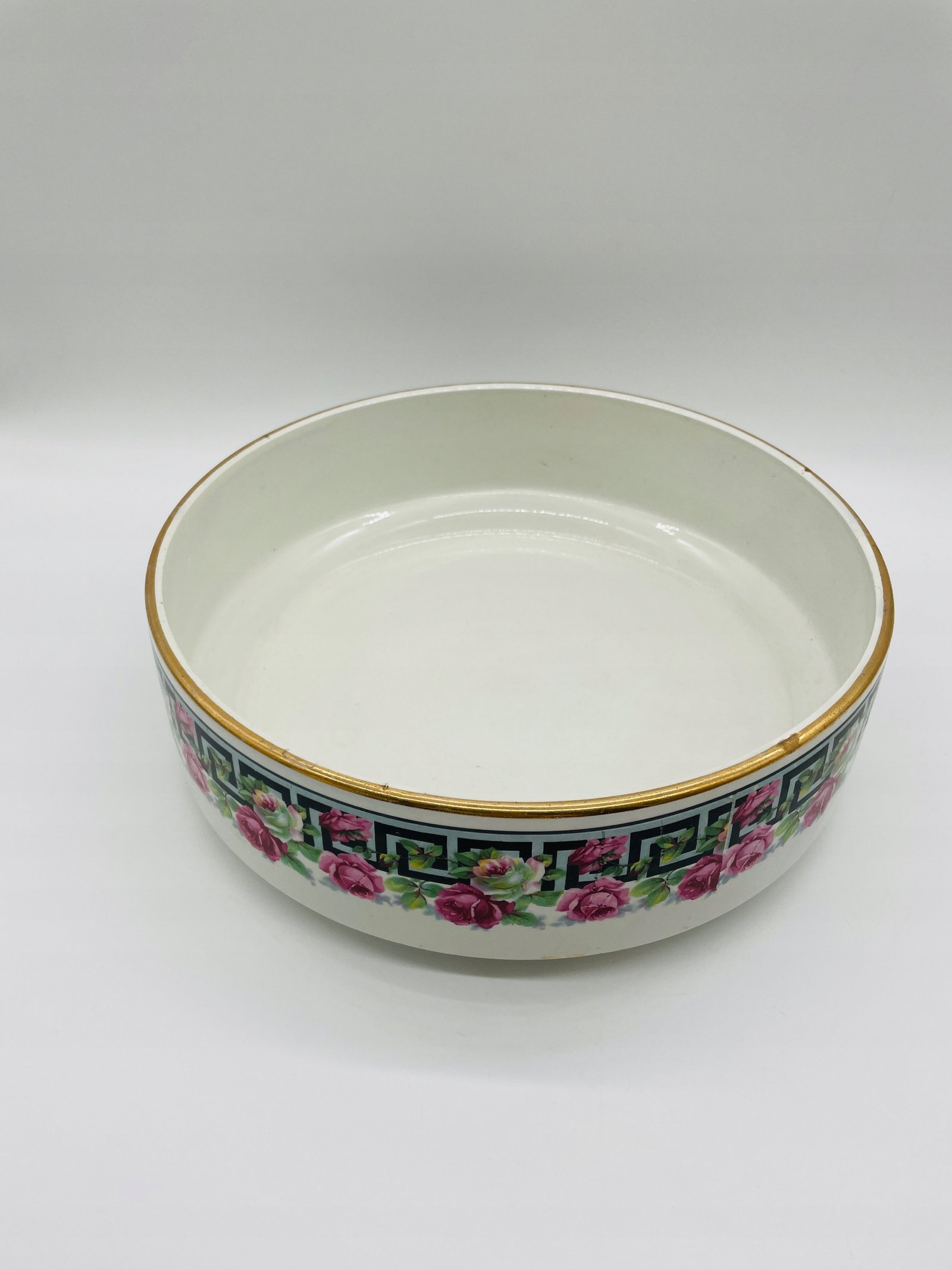 Zestaw do mycia z fajansu – dzbanek i misa dekorowane fryzem z róż na tle geometrycznego ornamentu w kolorach zieleni i czerni. Złocone obramowania i detale. Oznaczenie „St. Amand Dinoise Made in France” wskazuje na wytwórnię fajansu Saint-Amand z regionu Nord. Forma i dekor pozwalają datować przedmiot na lata 30. XX wieku.