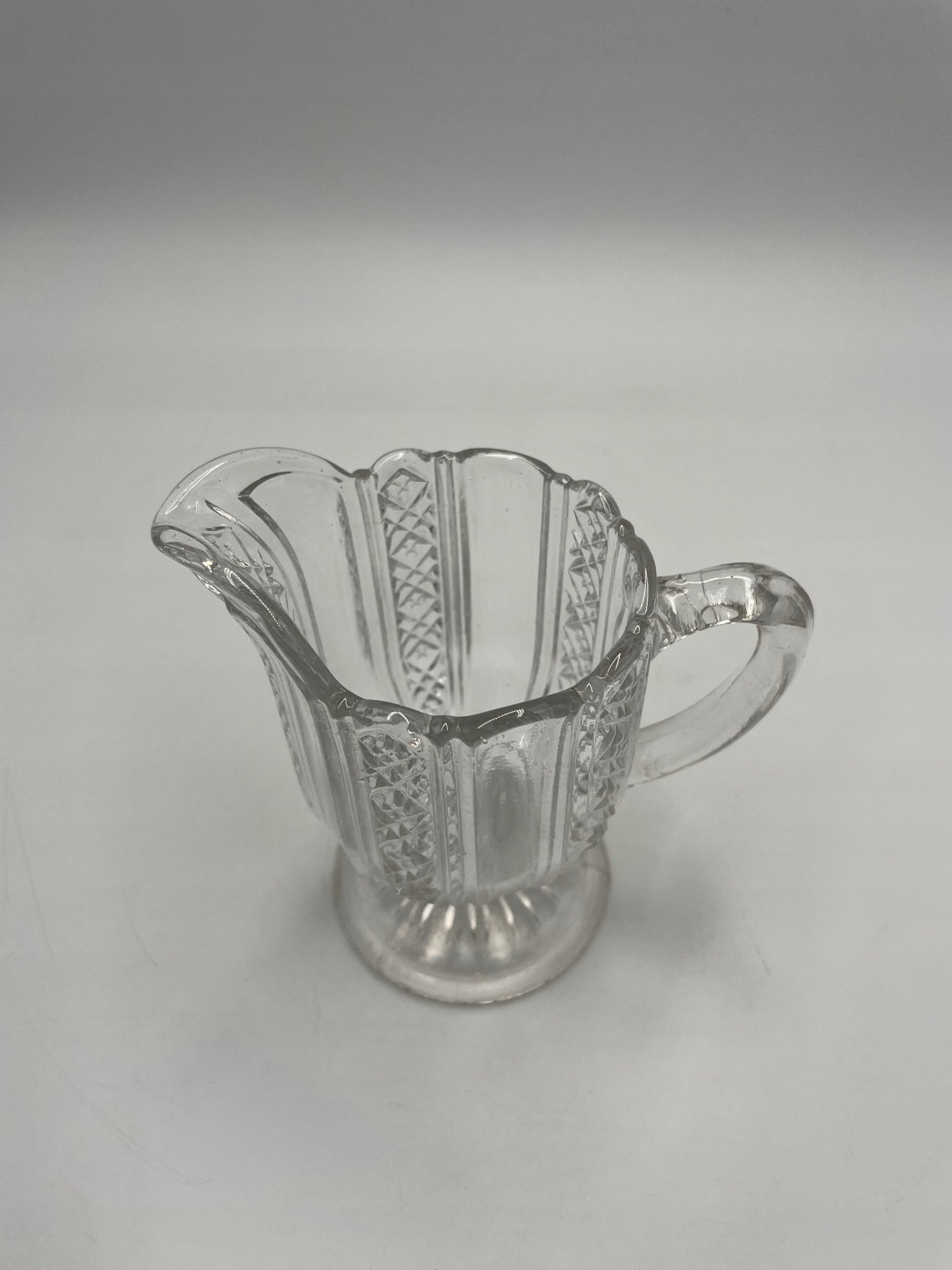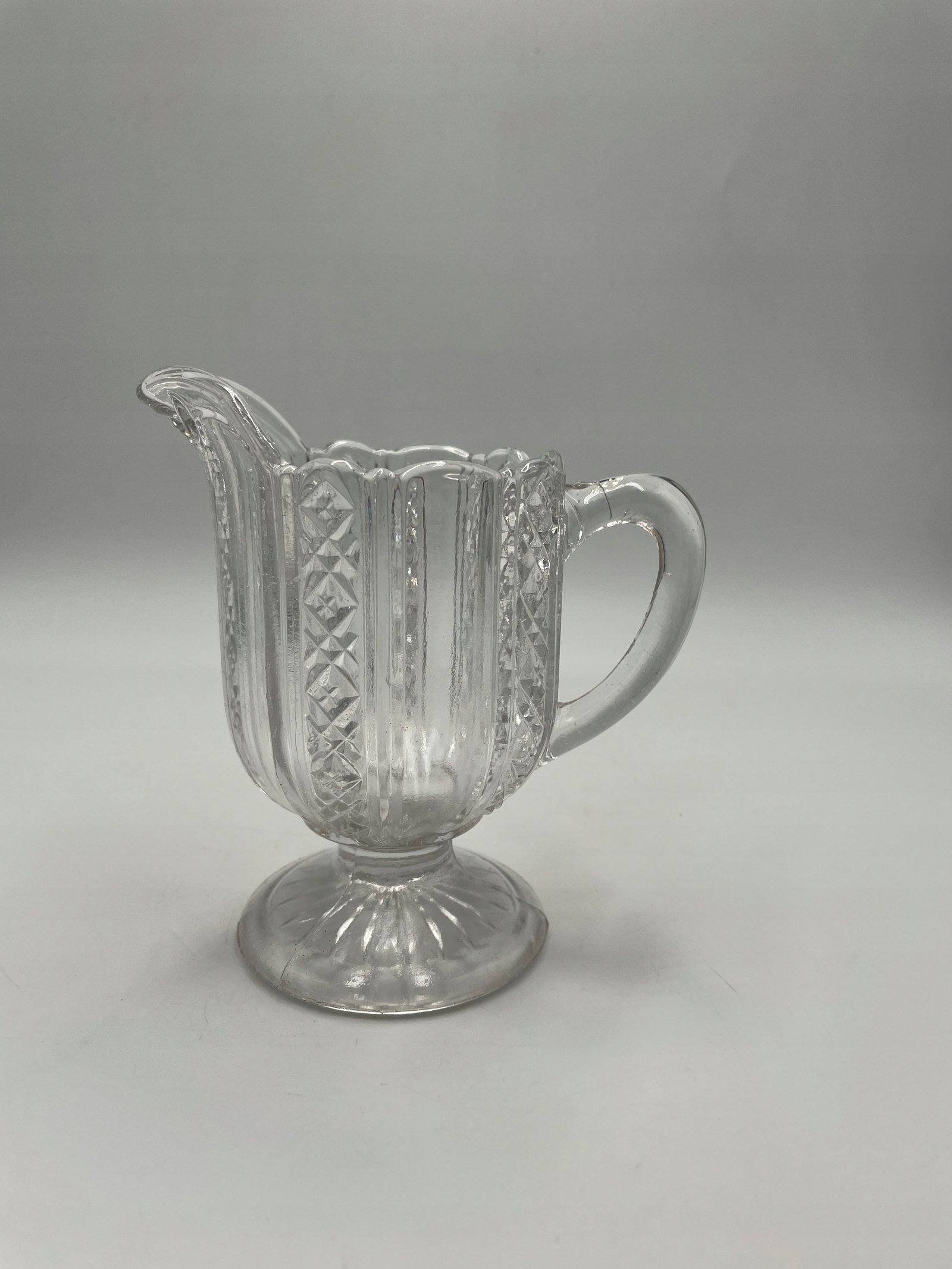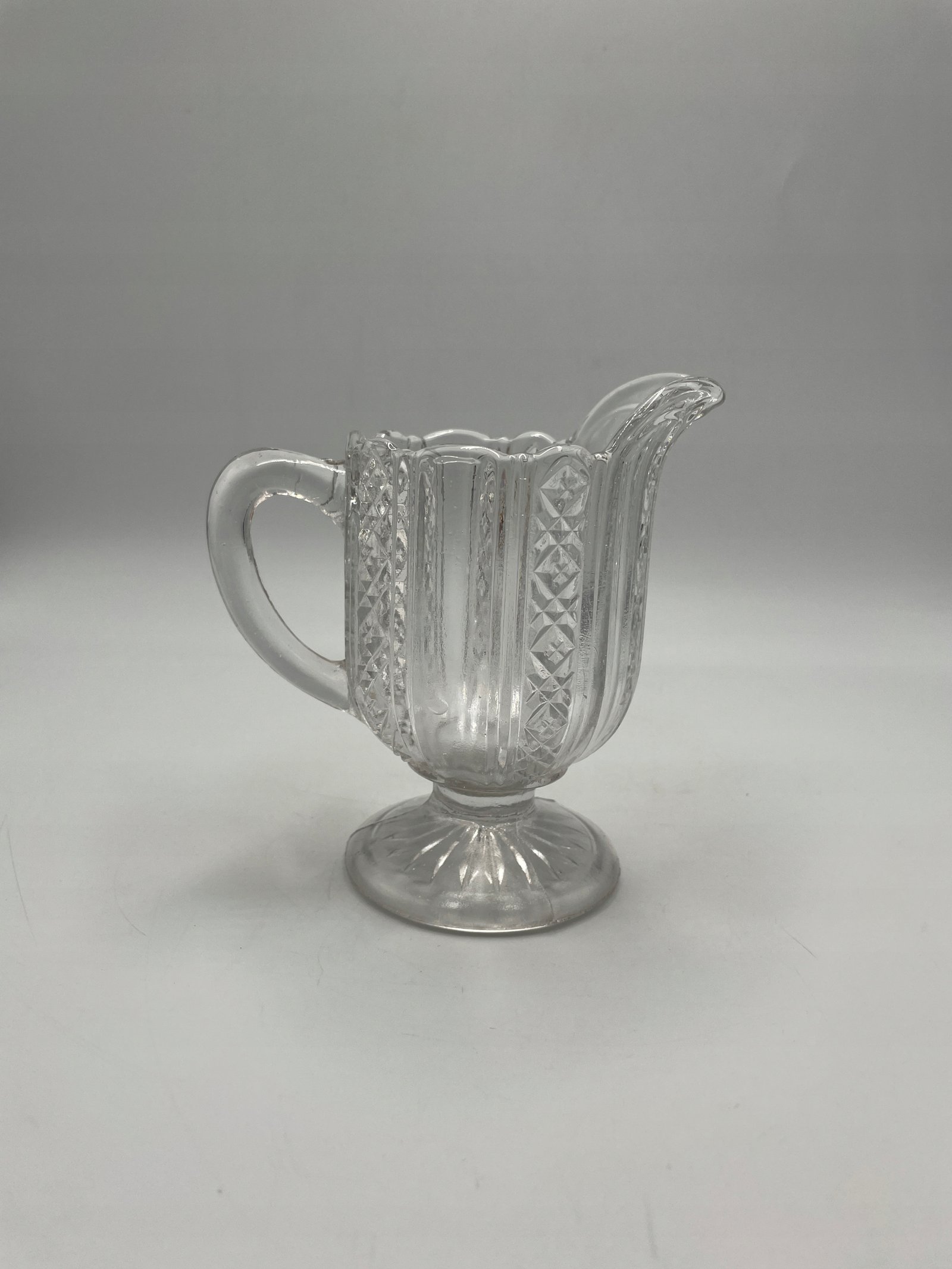 Elegancki dzbanuszek do śmietanki wykonany z przezroczystego tłoczonego szkła. Jego powierzchnia ozdobiona jest klasycznym reliefowym wzorem geometrycznym i florystycznym, co dodaje mu wyjątkowego charakteru. Posiada wygodny uchwyt oraz szeroki, dekoracyjny wylew ułatwiający nalewanie. Stabilna, okrągła podstawa podkreśla jego estetykę.
