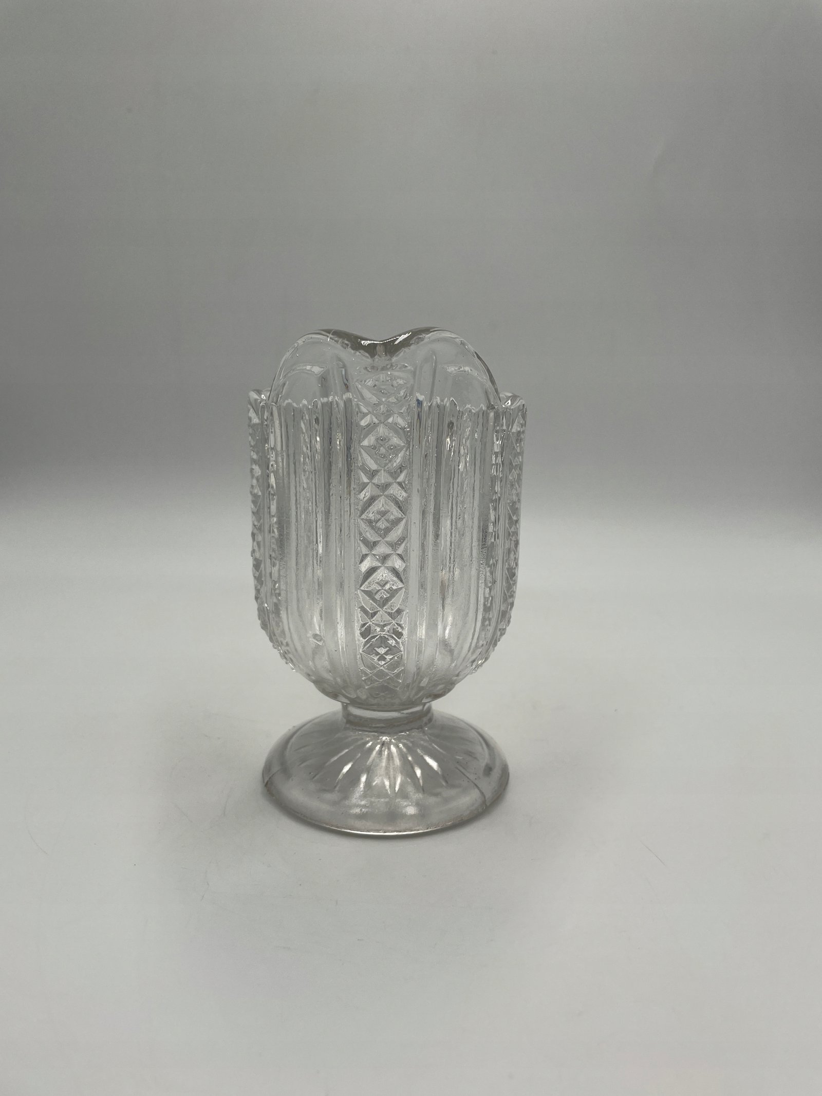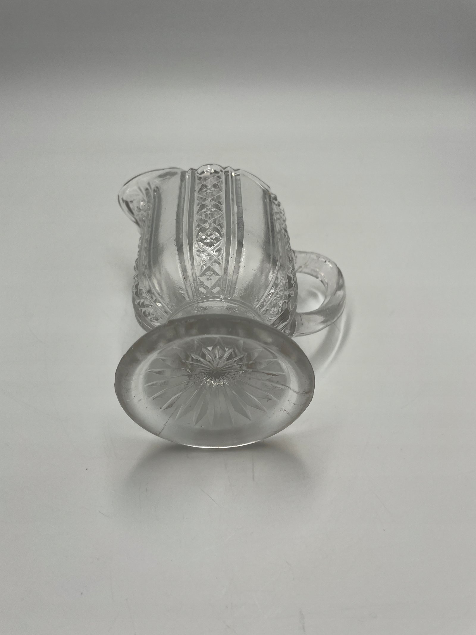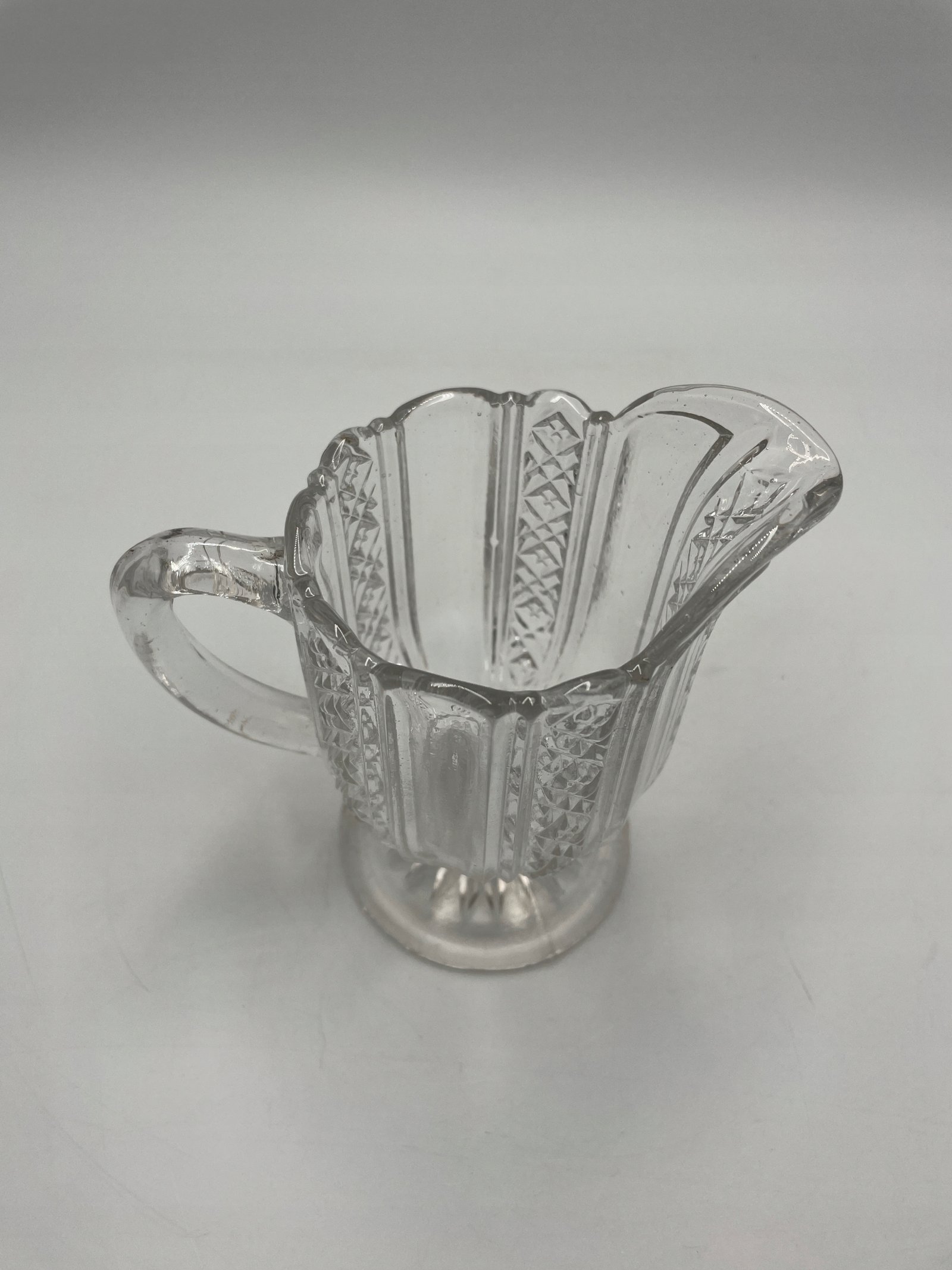 Elegancki dzbanuszek do śmietanki wykonany z przezroczystego tłoczonego szkła. Jego powierzchnia ozdobiona jest klasycznym reliefowym wzorem geometrycznym i florystycznym, co dodaje mu wyjątkowego charakteru. Posiada wygodny uchwyt oraz szeroki, dekoracyjny wylew ułatwiający nalewanie. Stabilna, okrągła podstawa podkreśla jego estetykę.