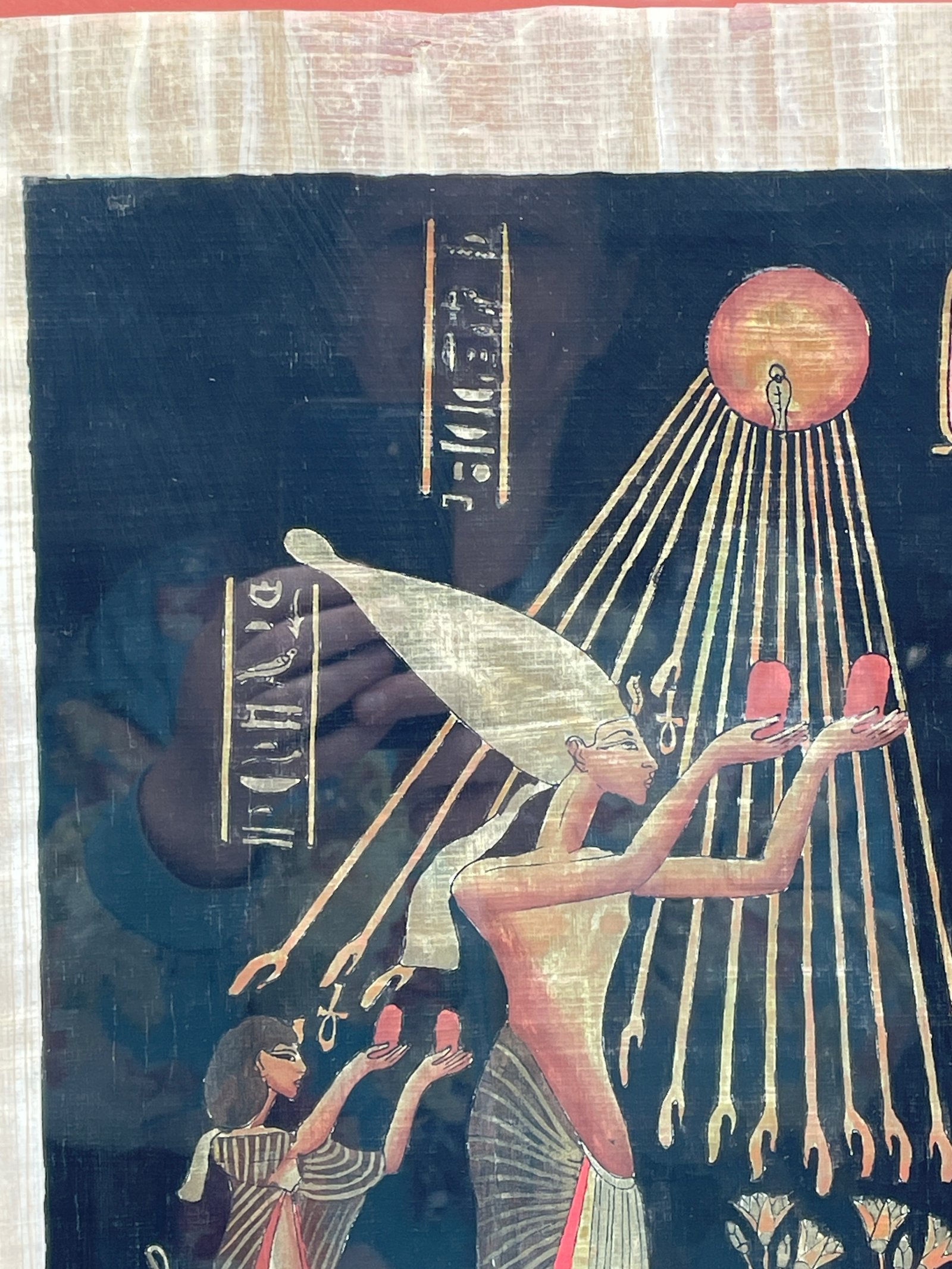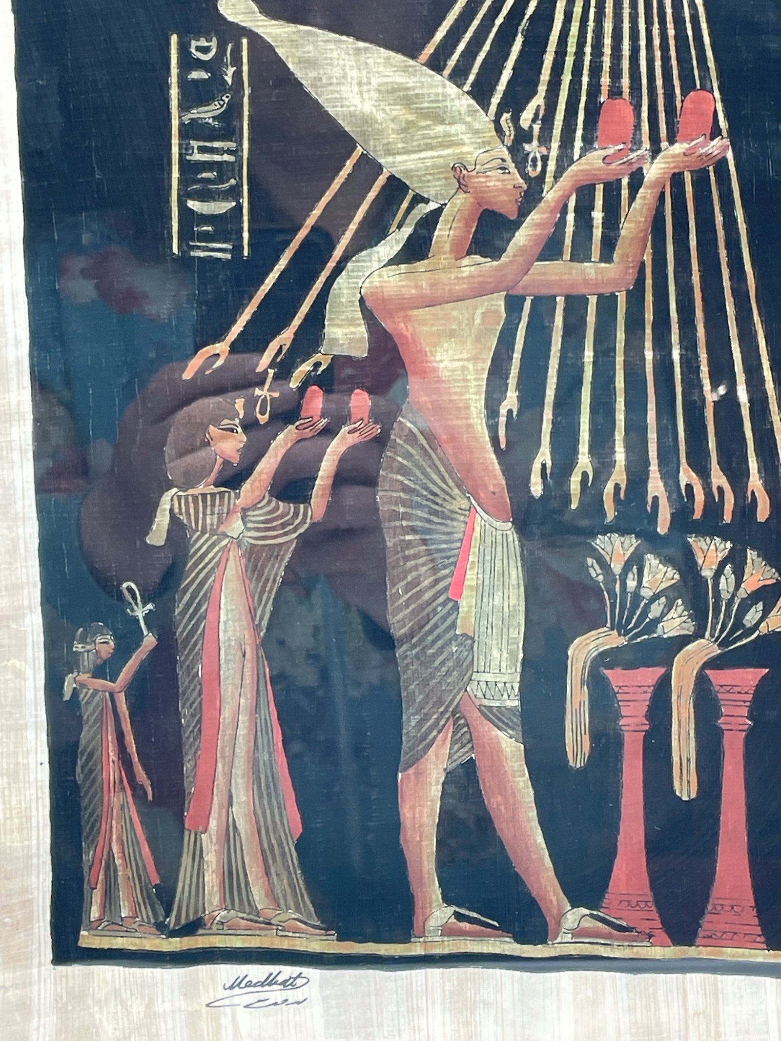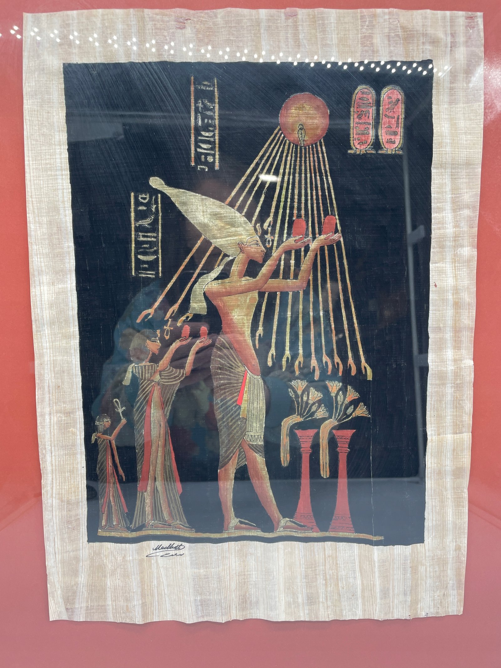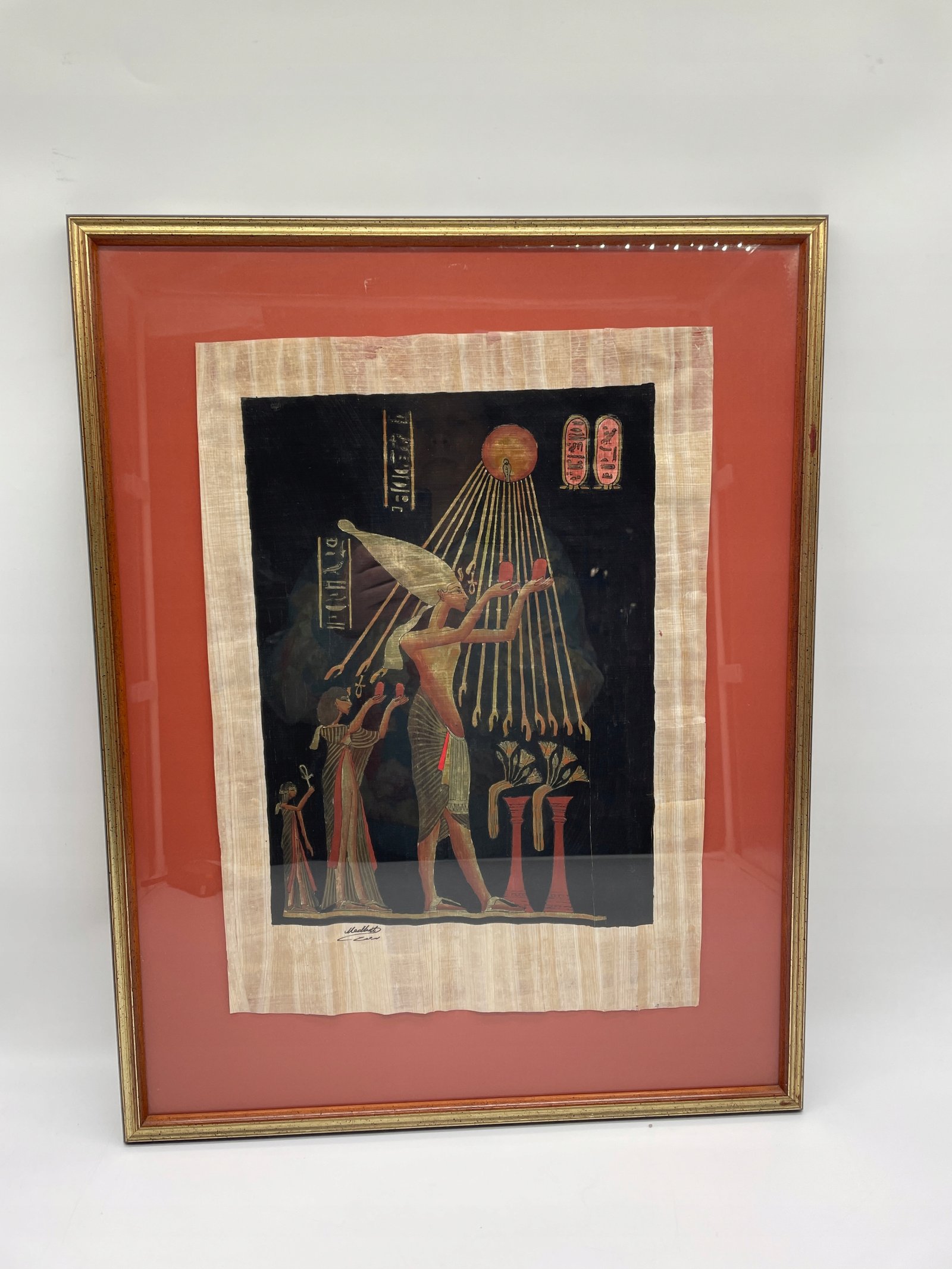 Oryginalny obraz ręcznie malowany na autentycznym egipskim papirusie. Przedstawia scenę z faraonem oddającym cześć bogu Atonowi. Praca sygnowana ręcznie. Umieszczona w ramie z szybą. Gotowy do powieszenia na ścianie.