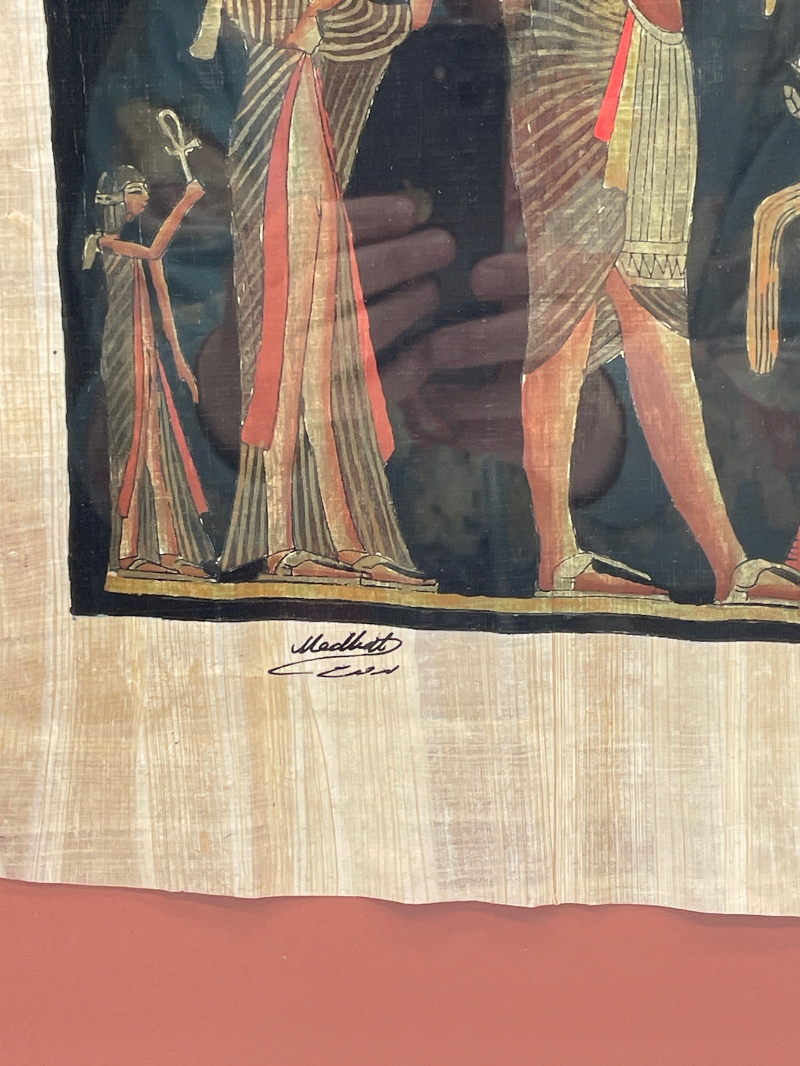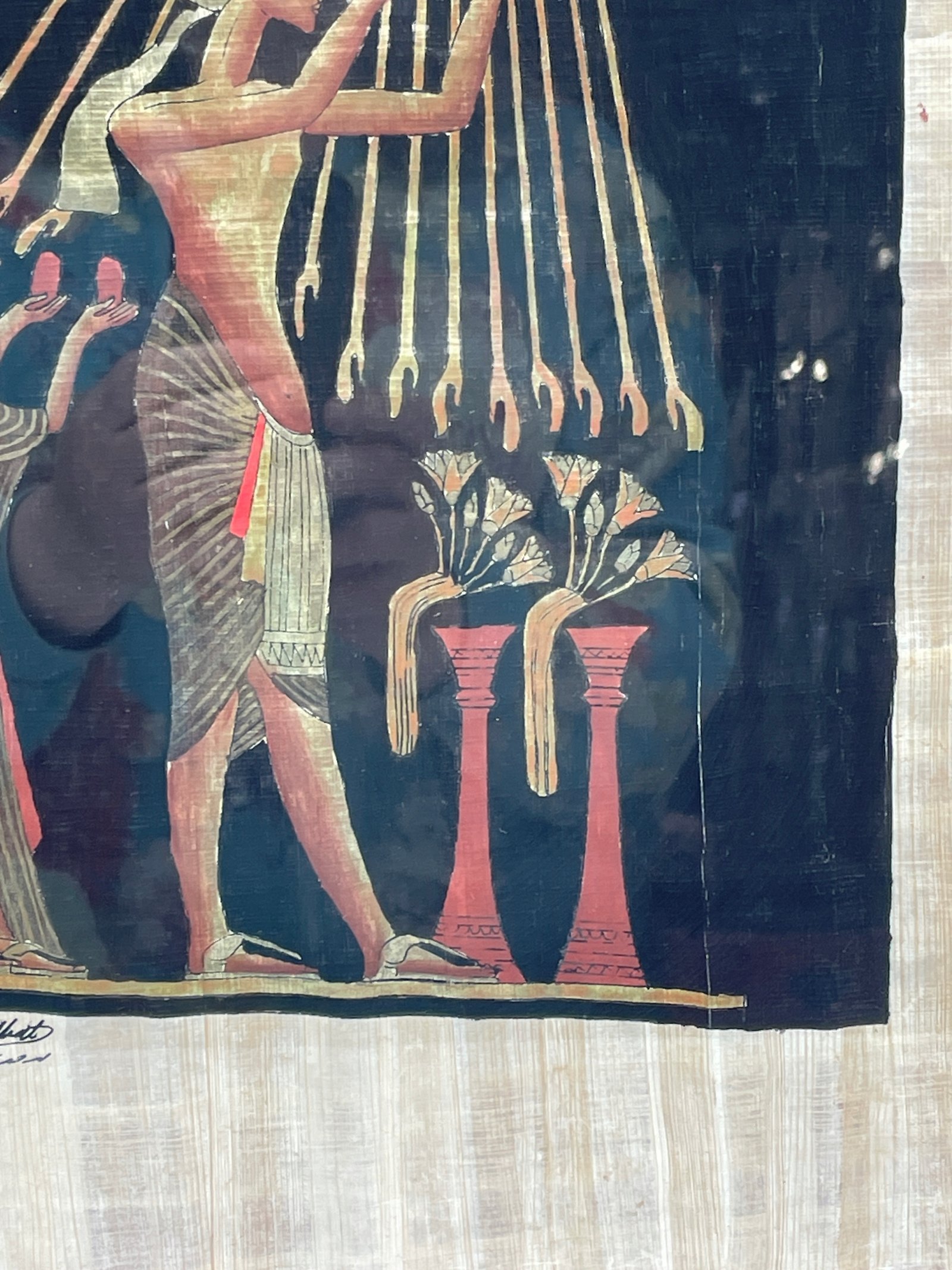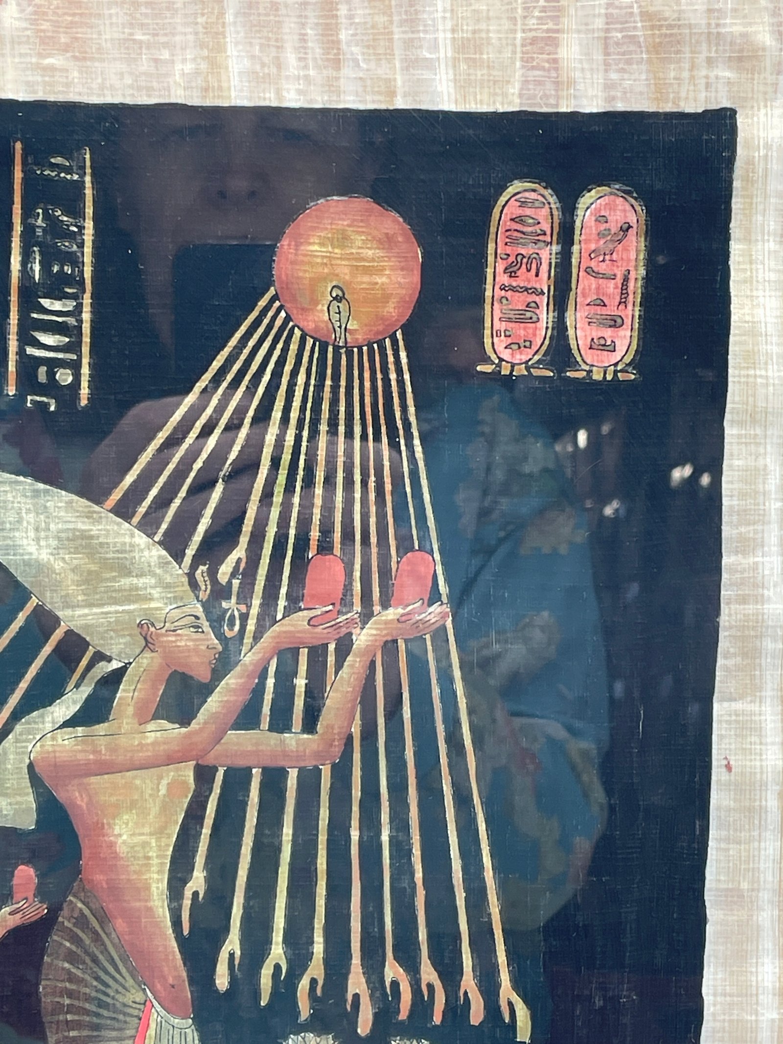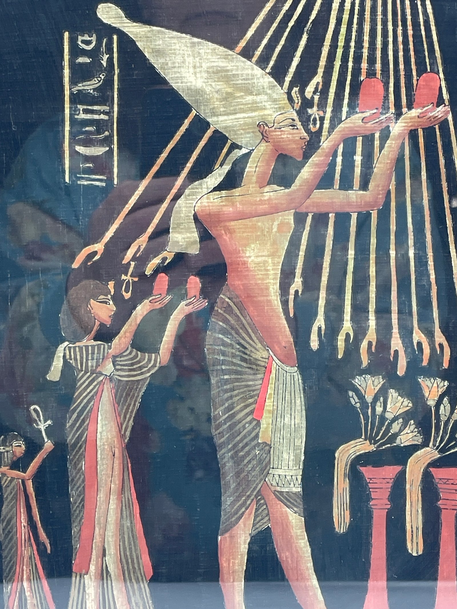 Oryginalny obraz ręcznie malowany na autentycznym egipskim papirusie. Przedstawia scenę z faraonem oddającym cześć bogu Atonowi. Praca sygnowana ręcznie. Umieszczona w ramie z szybą. Gotowy do powieszenia na ścianie.