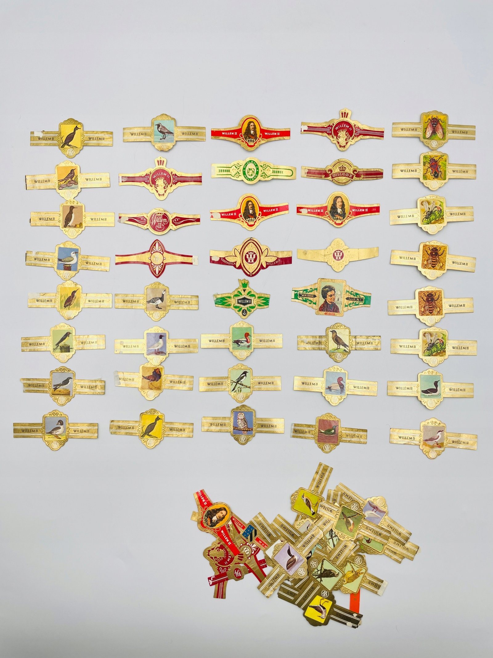 Etykiety cygarowe Willem II Holandia ok. 1950s seria ptaków 68 szt.