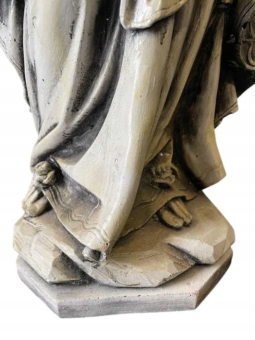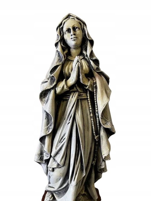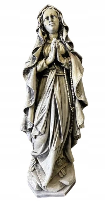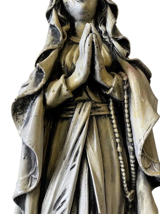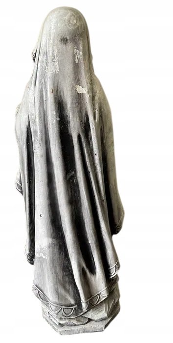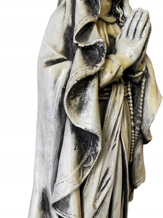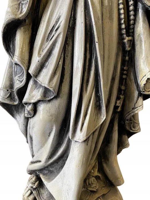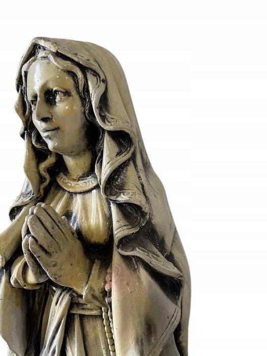 Imponująca, ciężka rzeźba Matki Bożej, wykonana w klasycznym stylu religijnym. Postać przedstawiona jest w modlitewnej pozie, z łagodnym wyrazem twarzy, złożonymi dłońmi i różańcem opadającym wzdłuż szat. Szczegółowe fałdy szat, kaptur i efekt postarzenia nadają figurze wygląd antycznego dzieła sztuki.