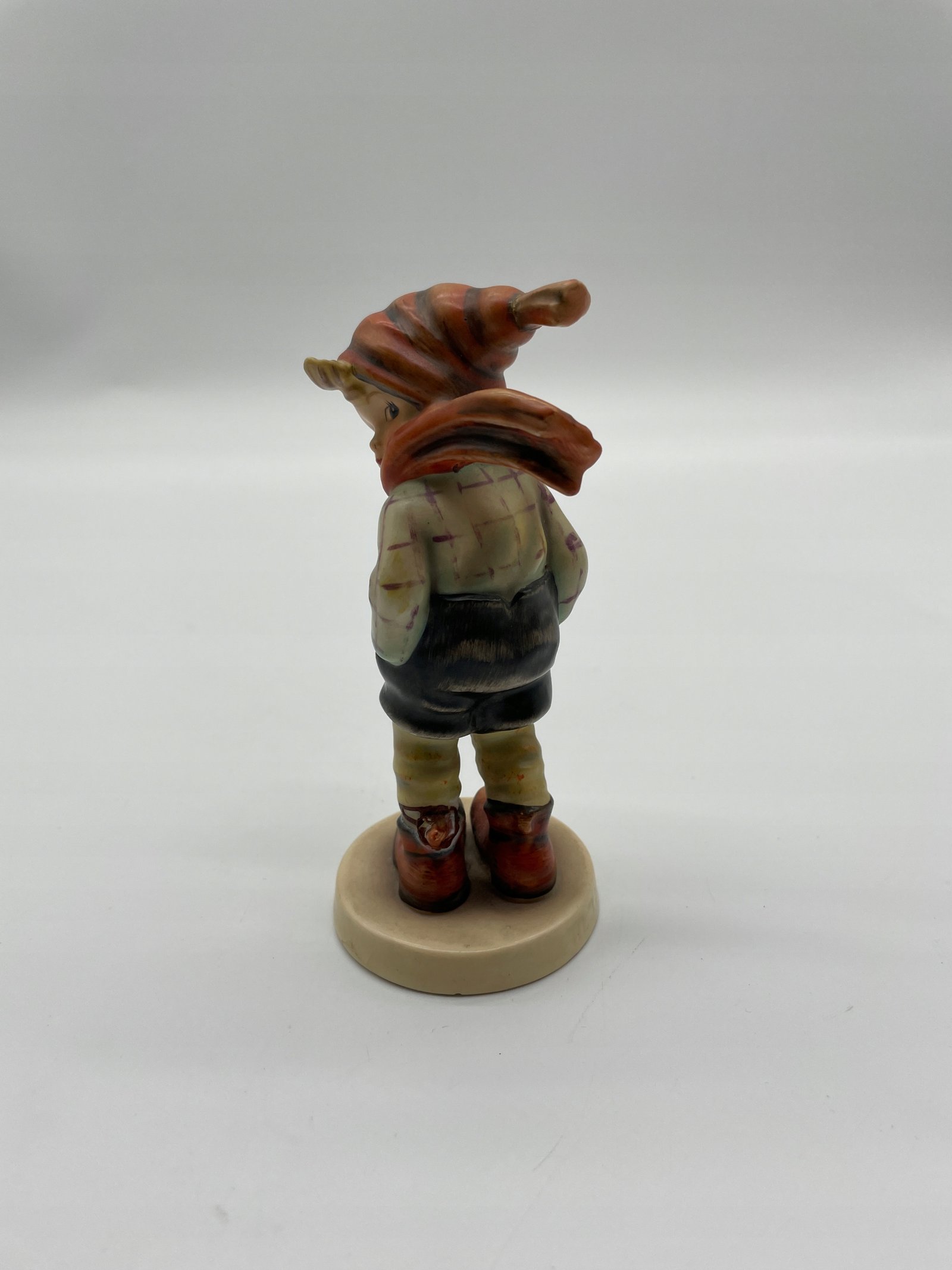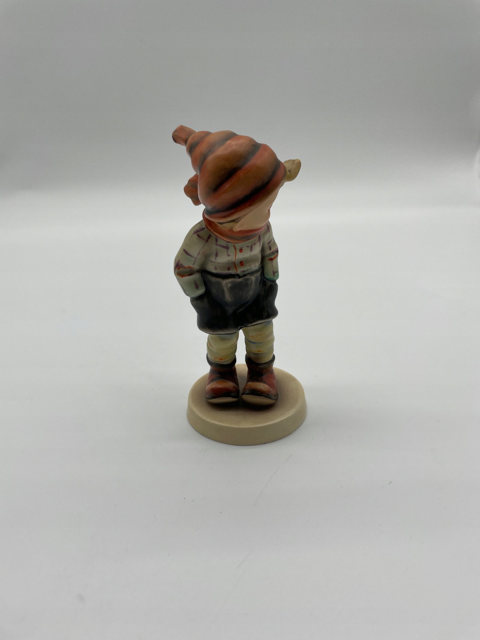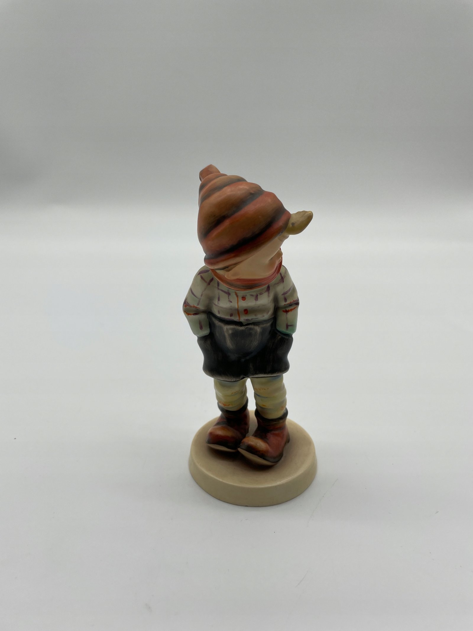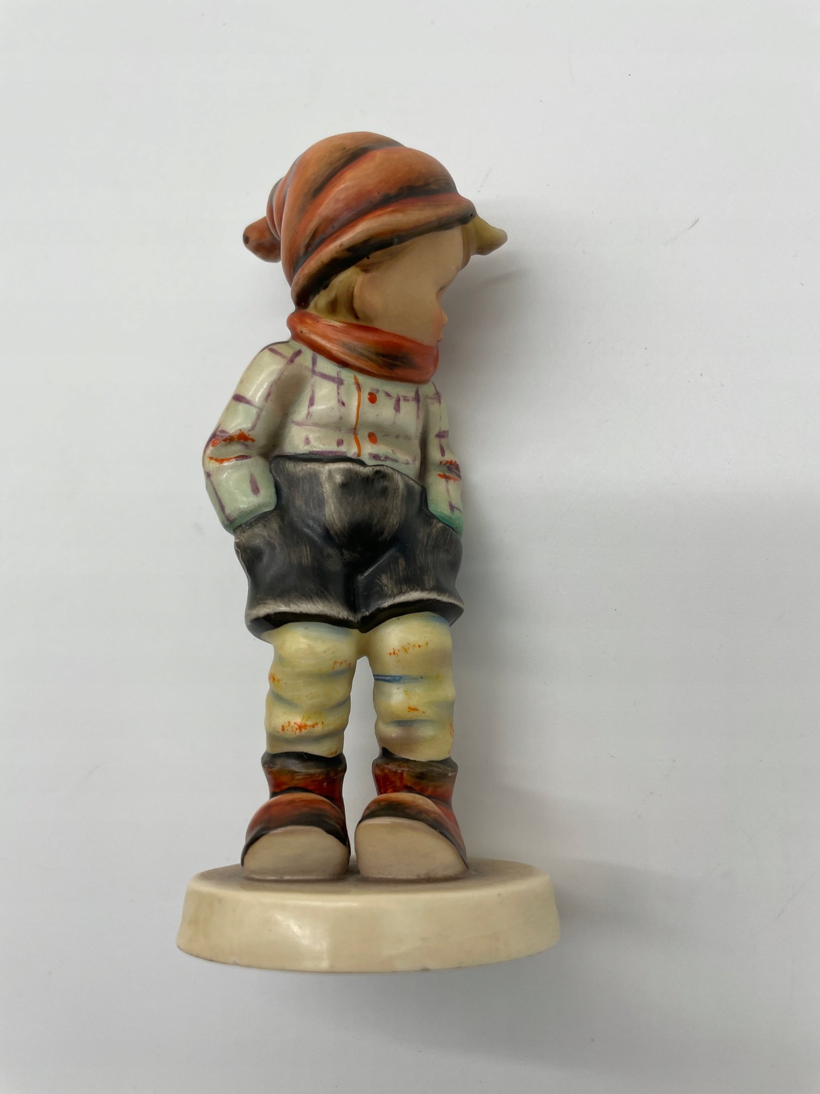 Porcelanowa figurka wyprodukowana w Niemczech Zachodnich przedstawia chłopca w pasiastym kapeluszu i zimowym ubraniu. Charakterystyczny styl Hummel z dopracowanymi detalami twarzy i stroju. Na spodzie widoczne sygnowanie „W. Germany” z logotypem Goebel.