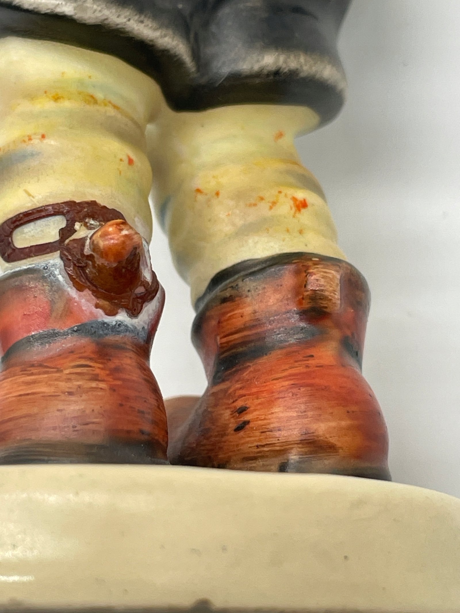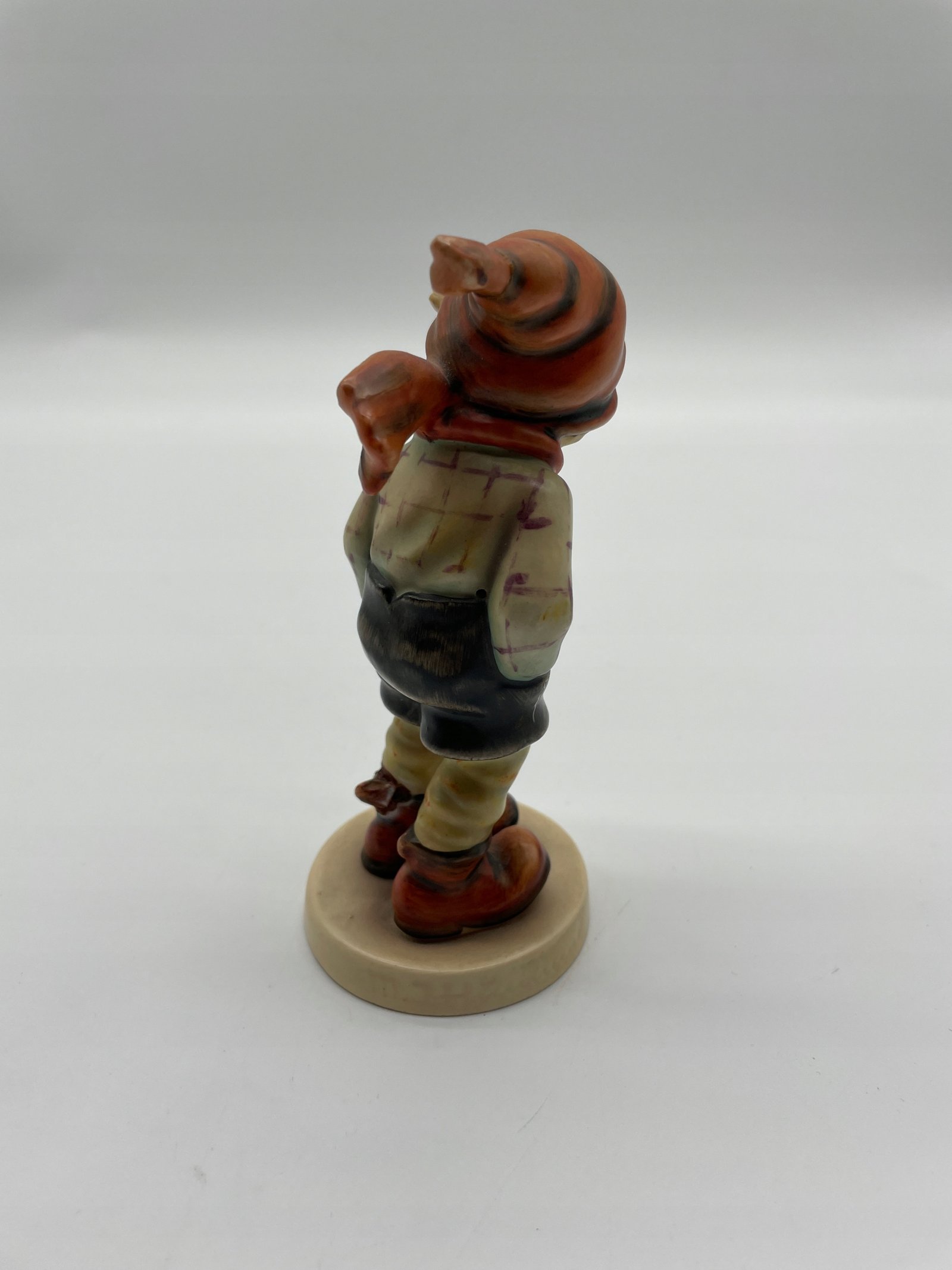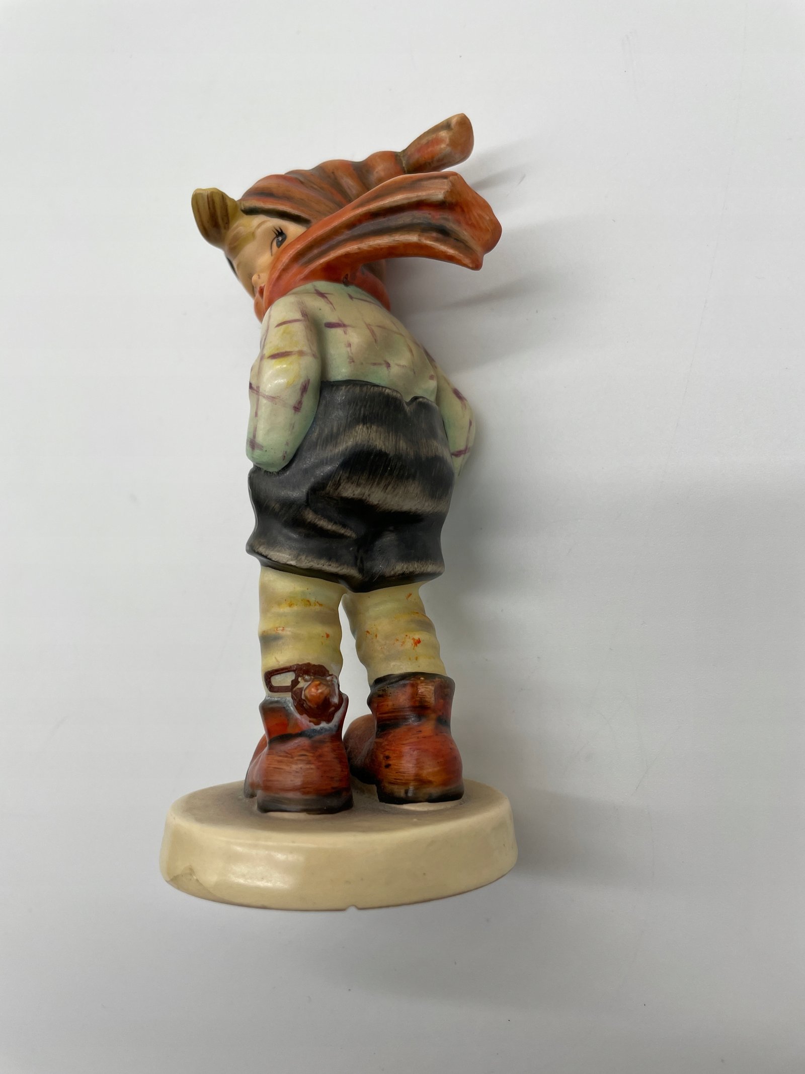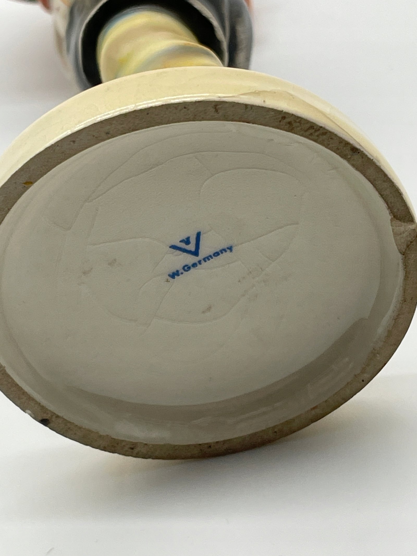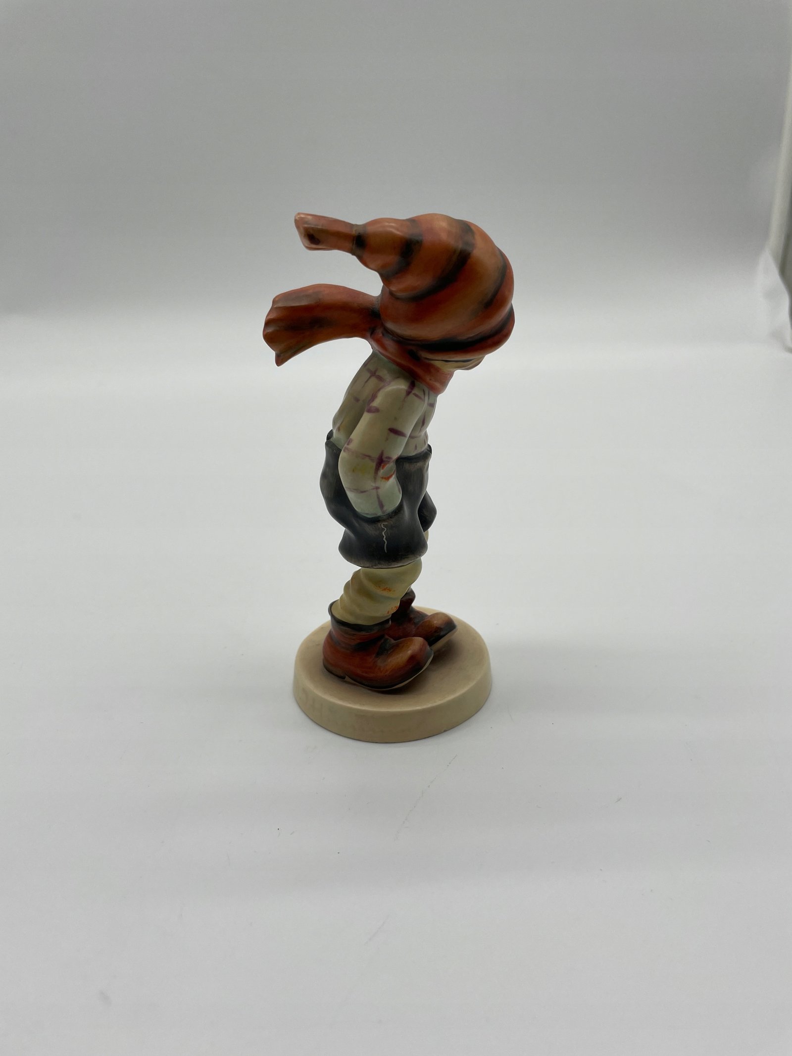 Porcelanowa figurka wyprodukowana w Niemczech Zachodnich przedstawia chłopca w pasiastym kapeluszu i zimowym ubraniu. Charakterystyczny styl Hummel z dopracowanymi detalami twarzy i stroju. Na spodzie widoczne sygnowanie „W. Germany” z logotypem Goebel.