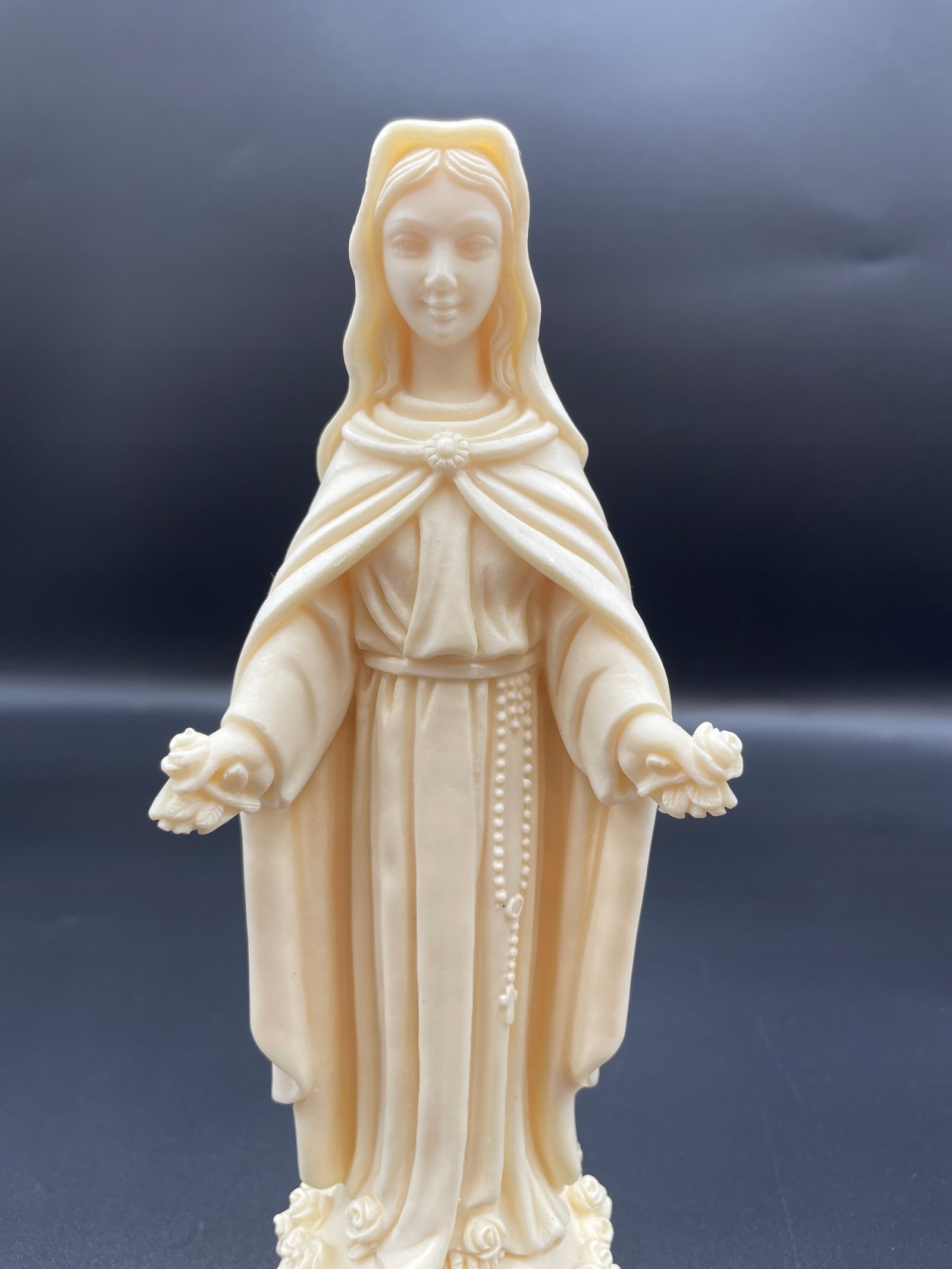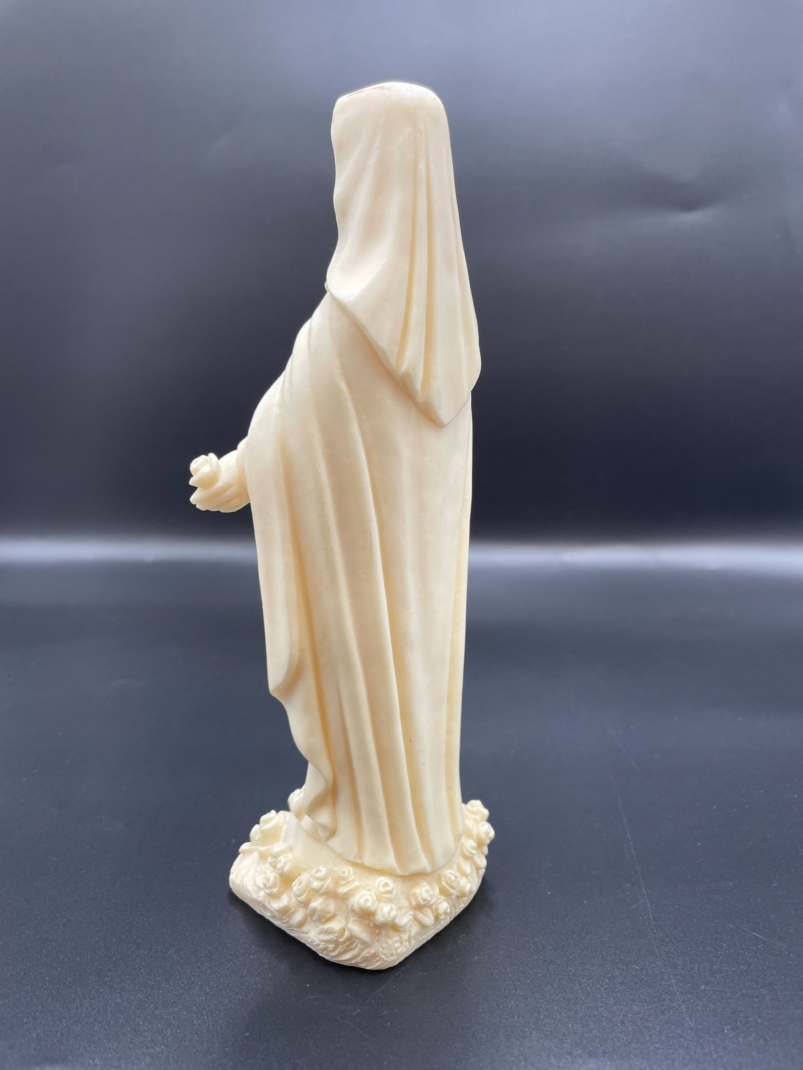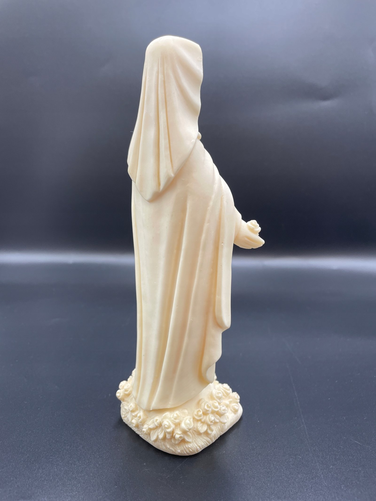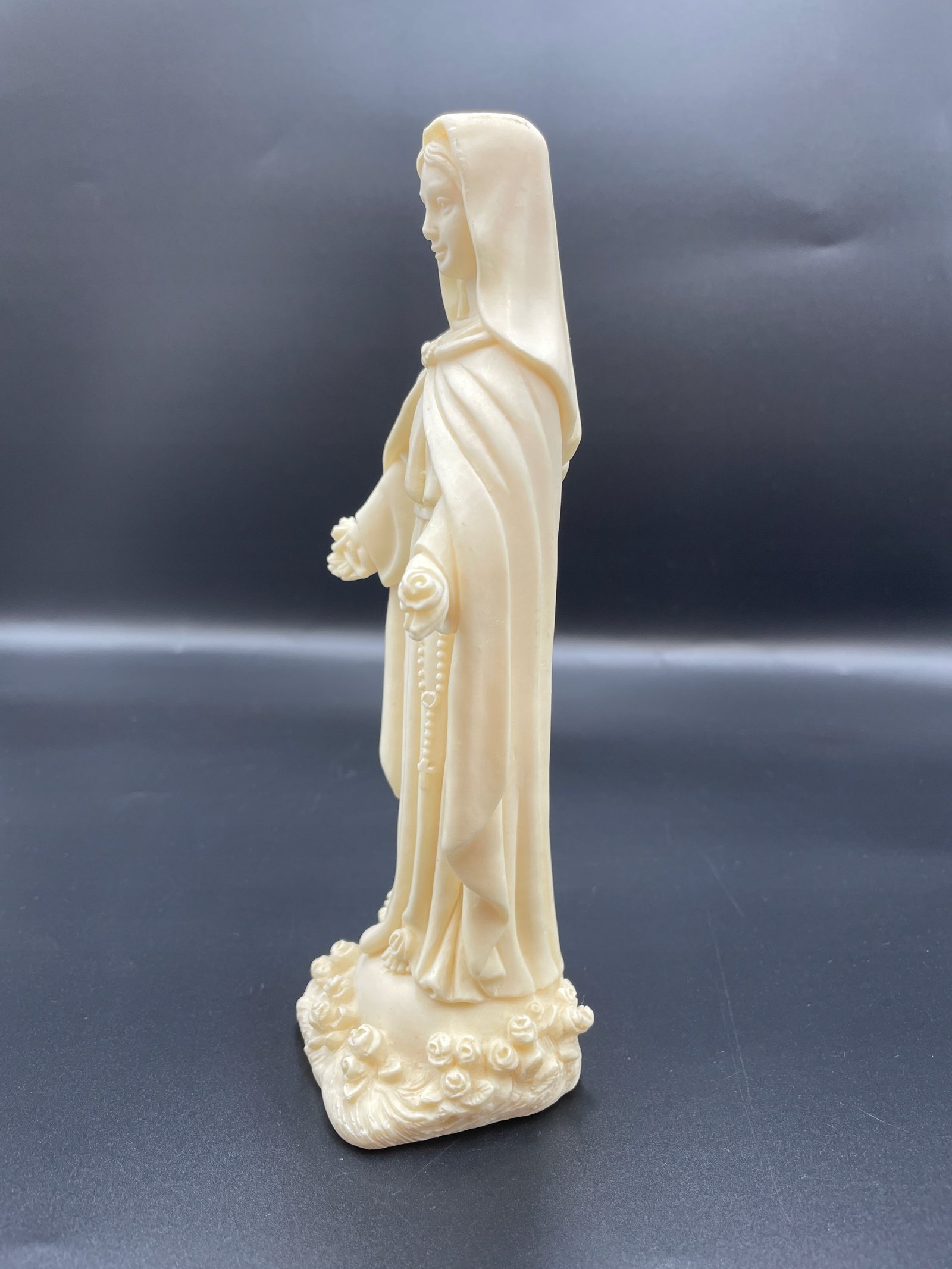 Delikatna figurka Matki Bożej wykonana z żywicy w kolorze kości słoniowej. Przedstawia Maryję z różańcem, stojącą na podstawie ozdobionej różami. Ręce wyciągnięte w geście błogosławieństwa.