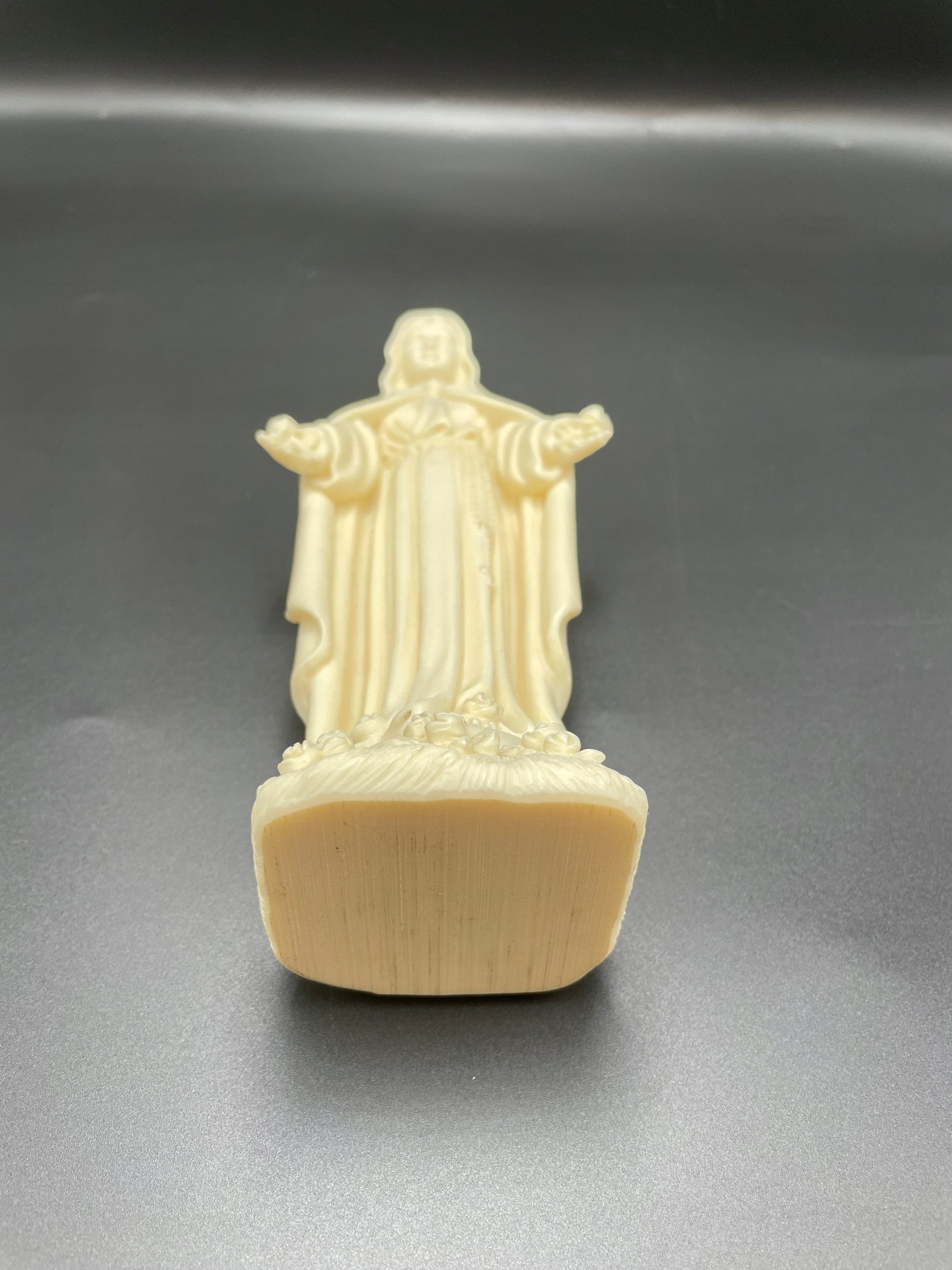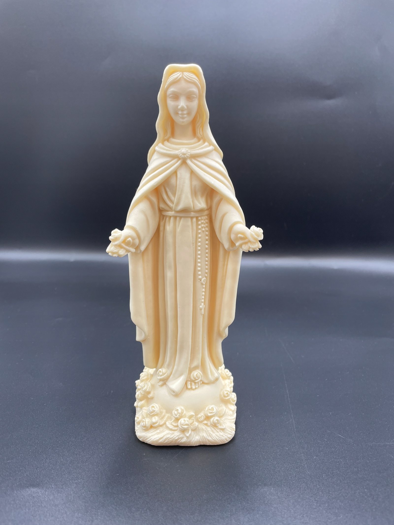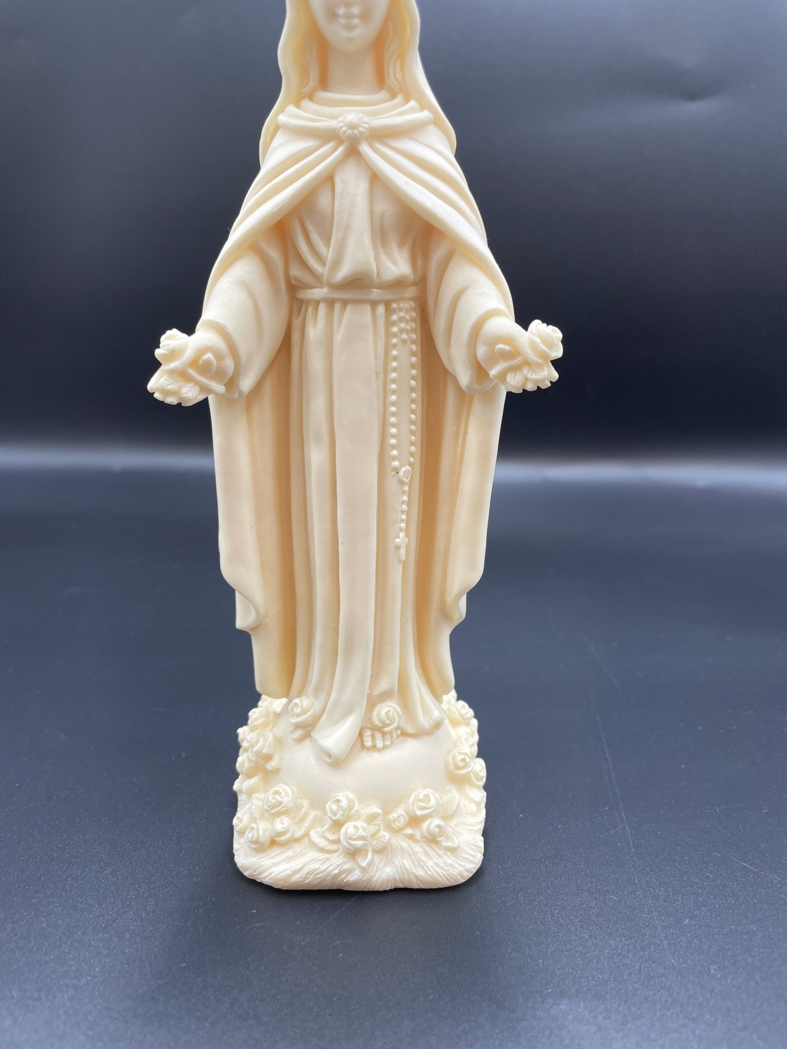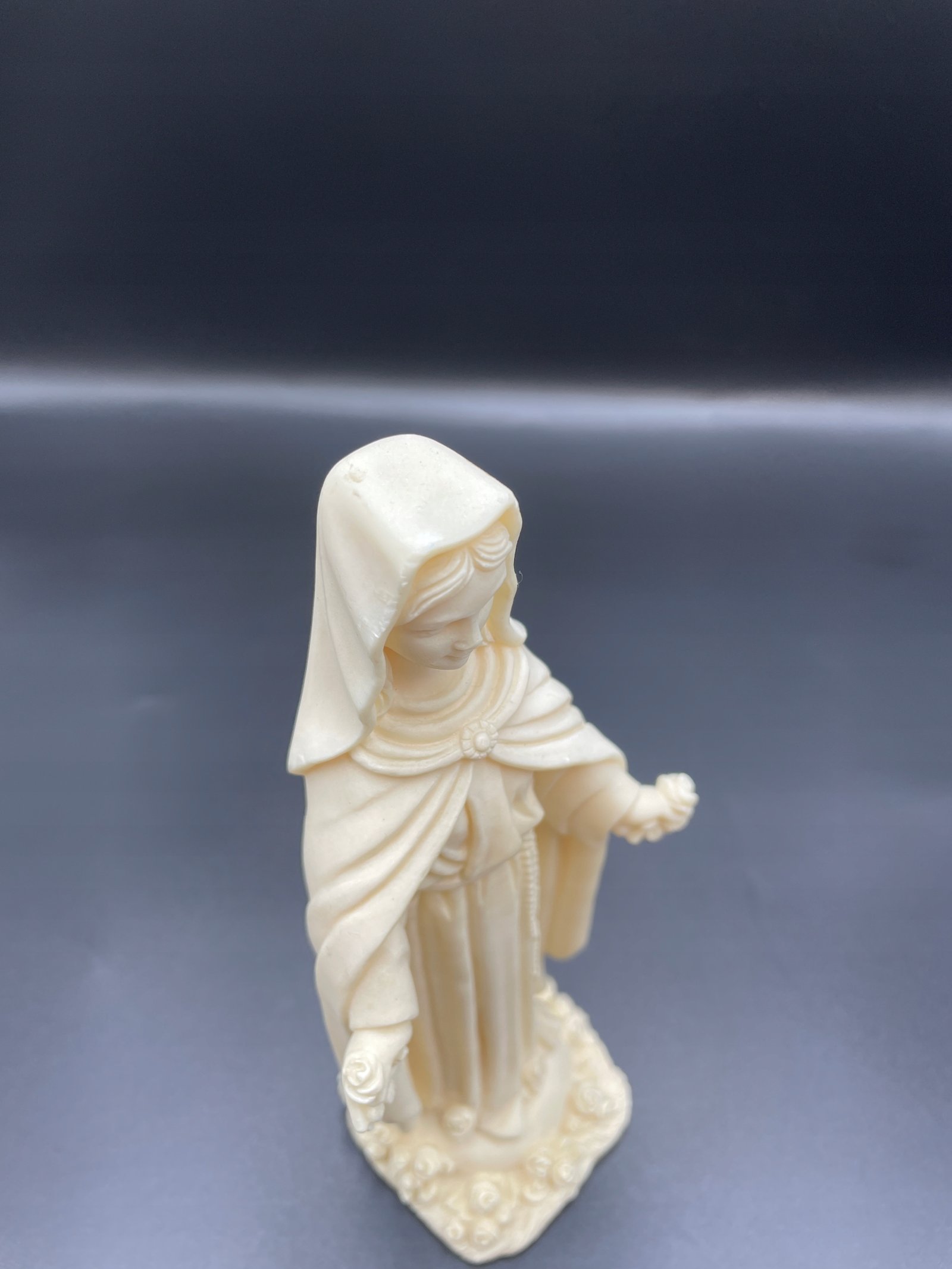 Delikatna figurka Matki Bożej wykonana z żywicy w kolorze kości słoniowej. Przedstawia Maryję z różańcem, stojącą na podstawie ozdobionej różami. Ręce wyciągnięte w geście błogosławieństwa.