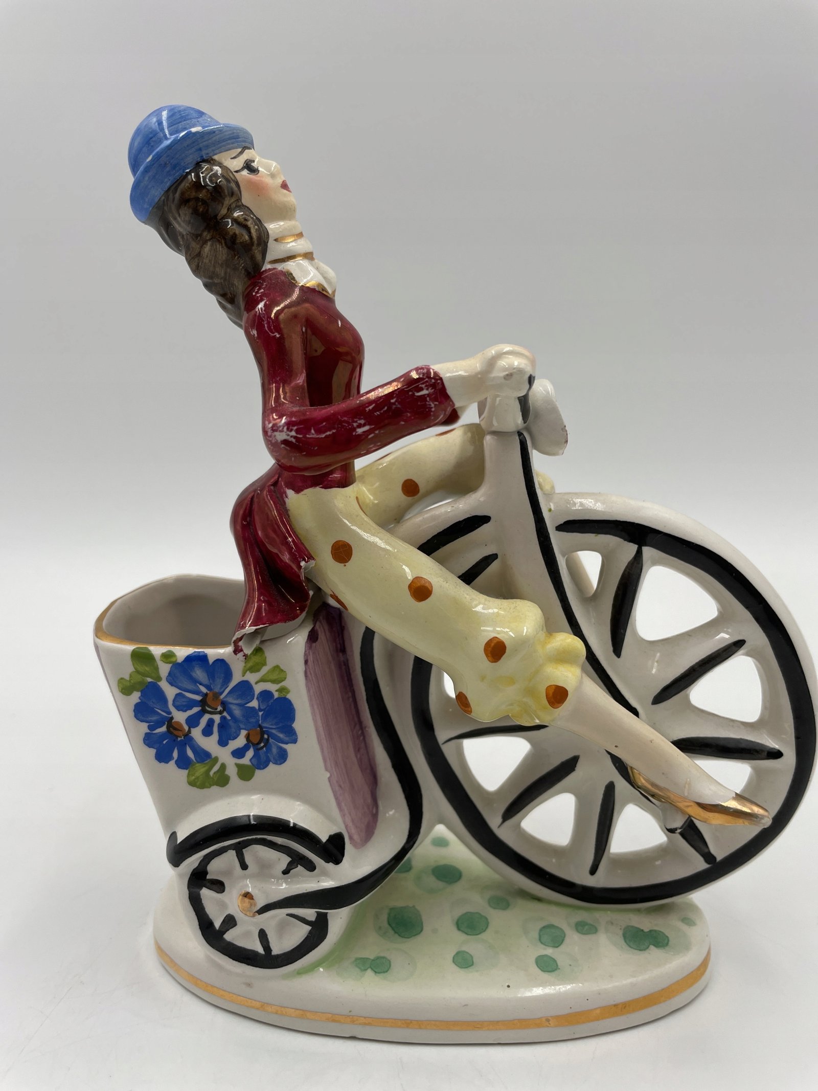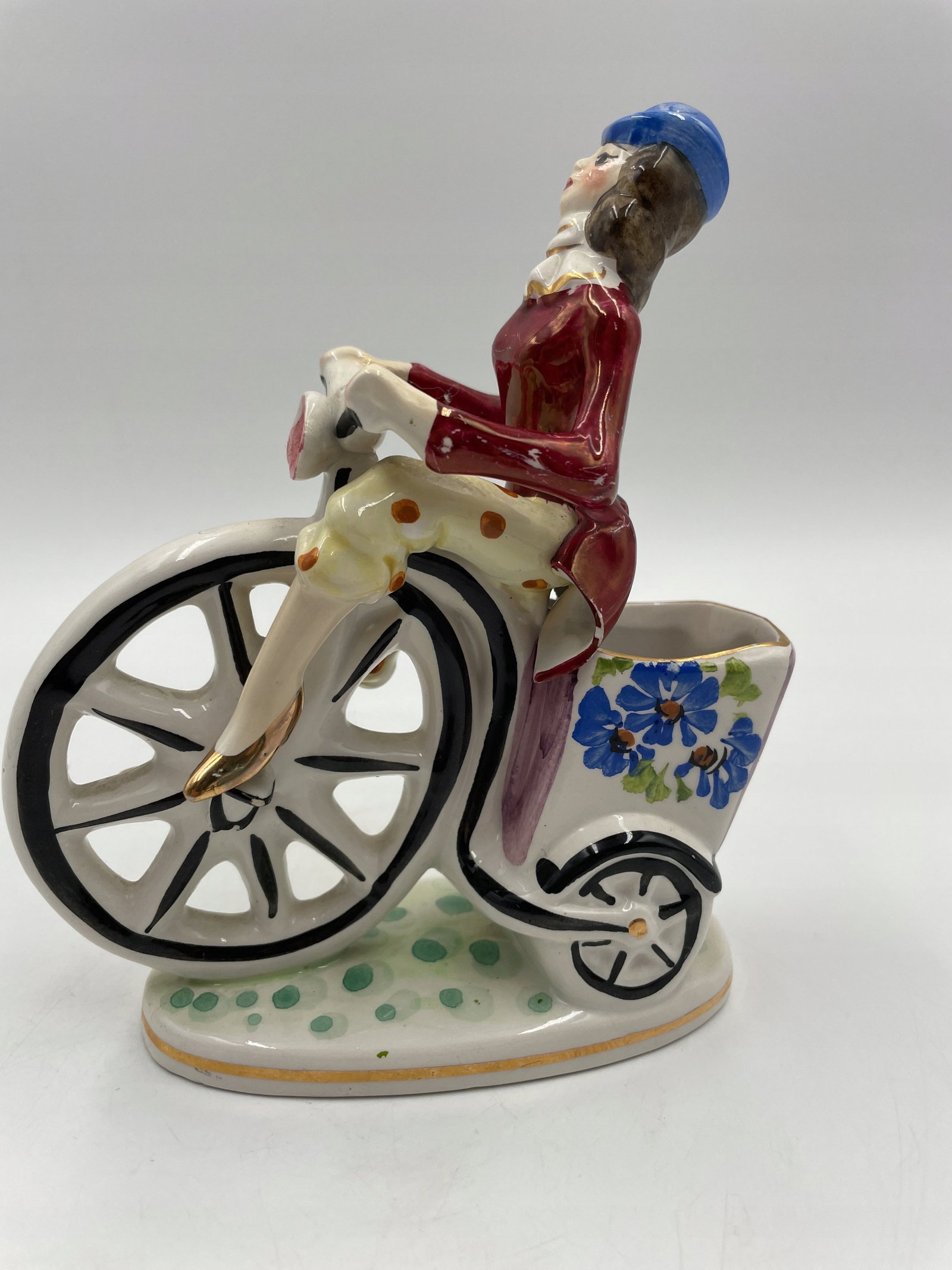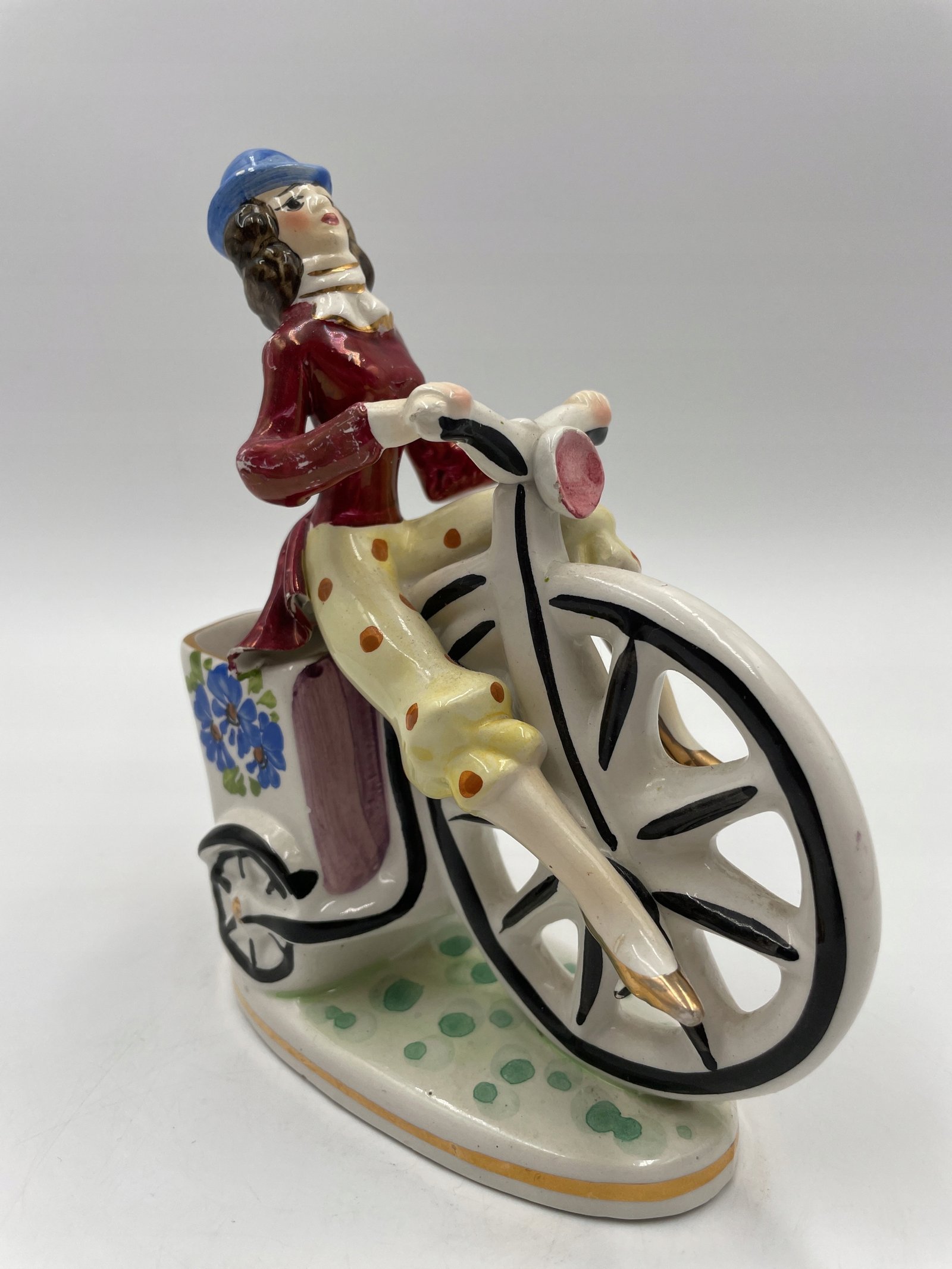 Piękny, zabytkowy mały wazon/donica z wizerunkiem jasno ubranego rowerzysty na rowerze z wysokimi kołami / groszowym farthingiem. Wyprodukowany we Włoszech i należący do Febland.
