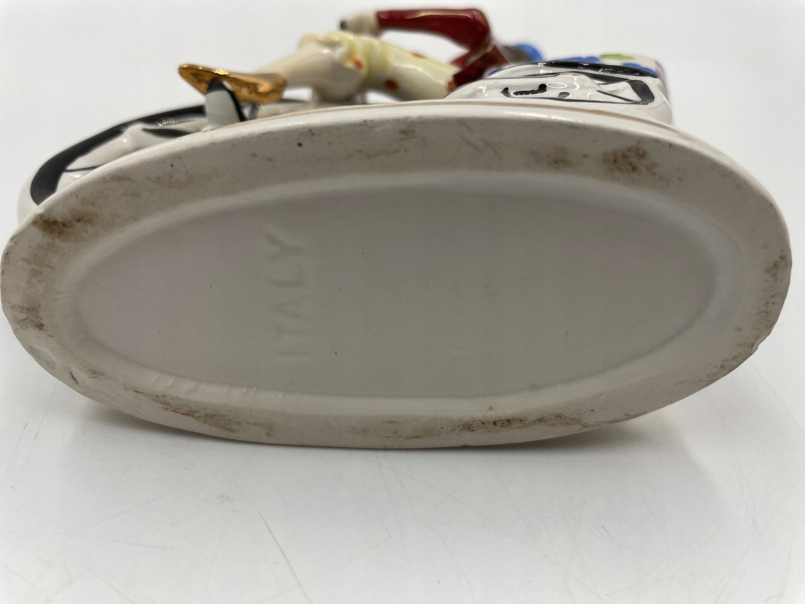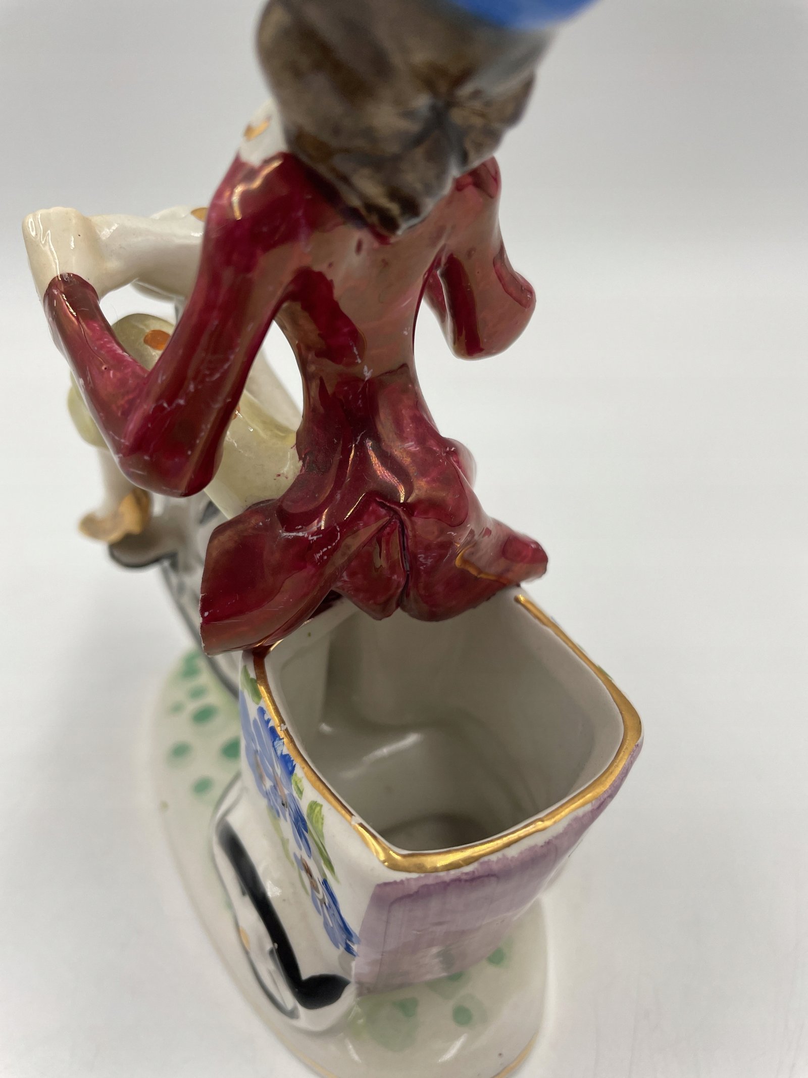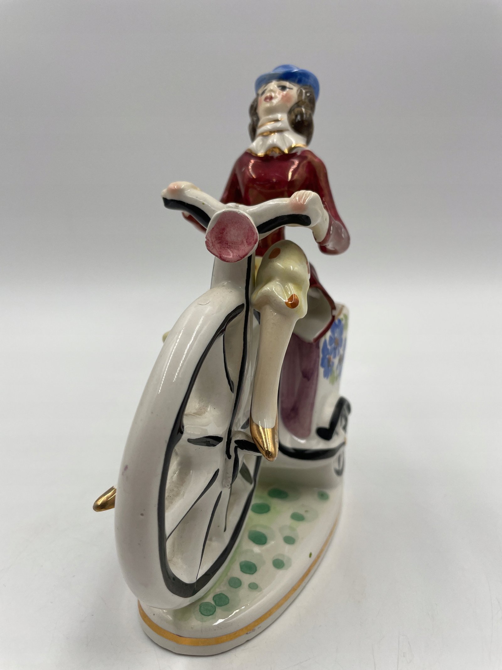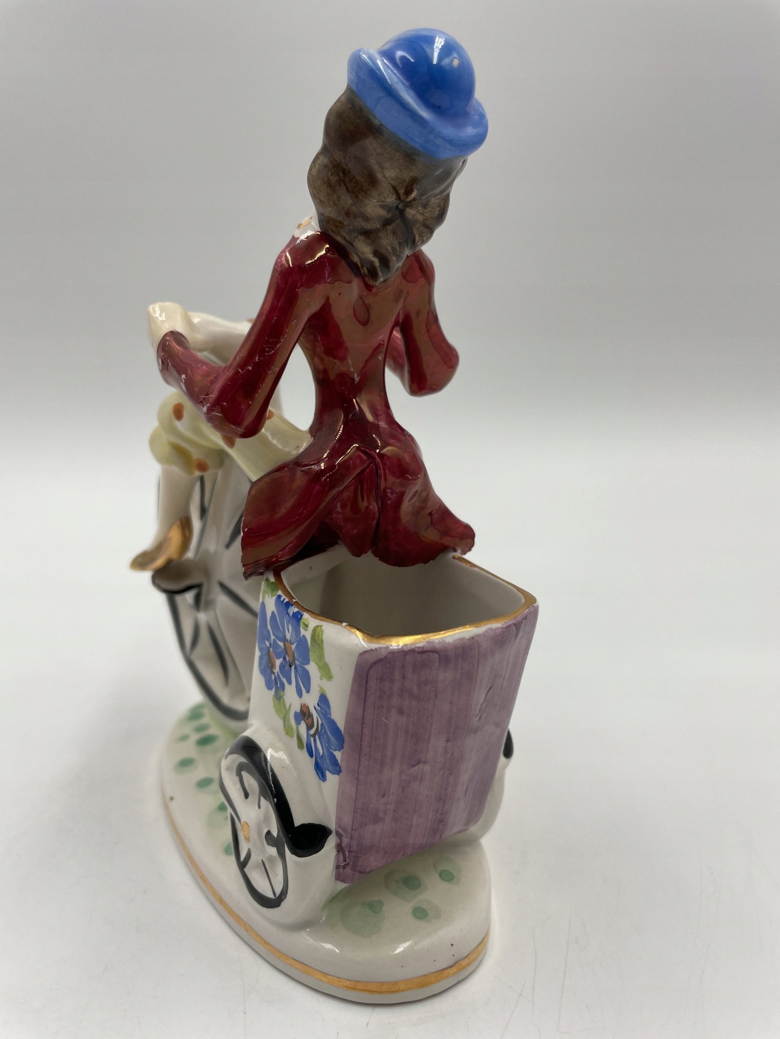 Piękny, zabytkowy mały wazon/donica z wizerunkiem jasno ubranego rowerzysty na rowerze z wysokimi kołami / groszowym farthingiem. Wyprodukowany we Włoszech i należący do Febland.