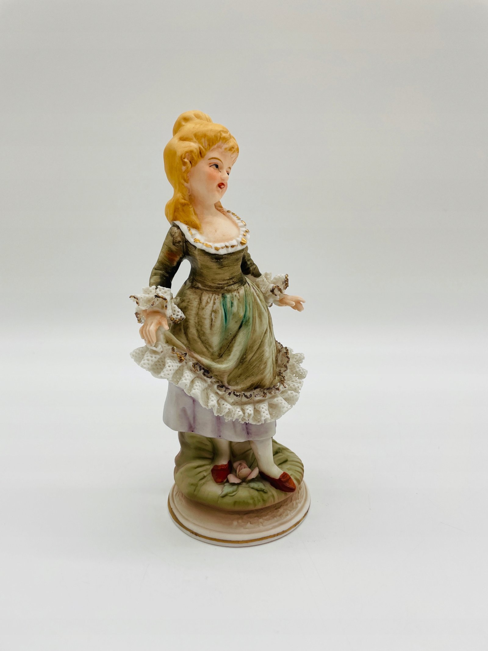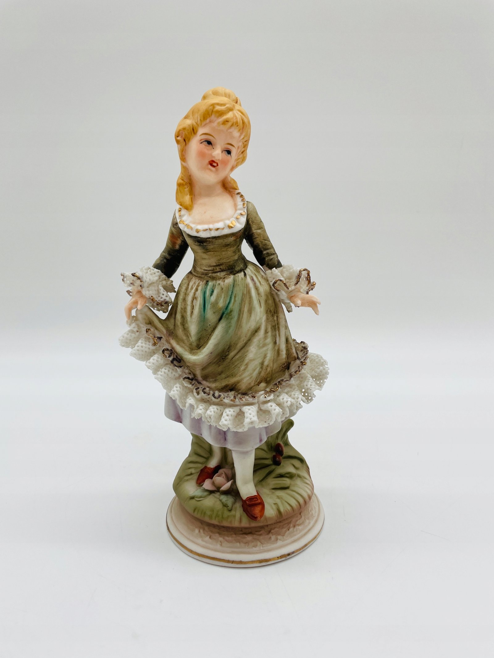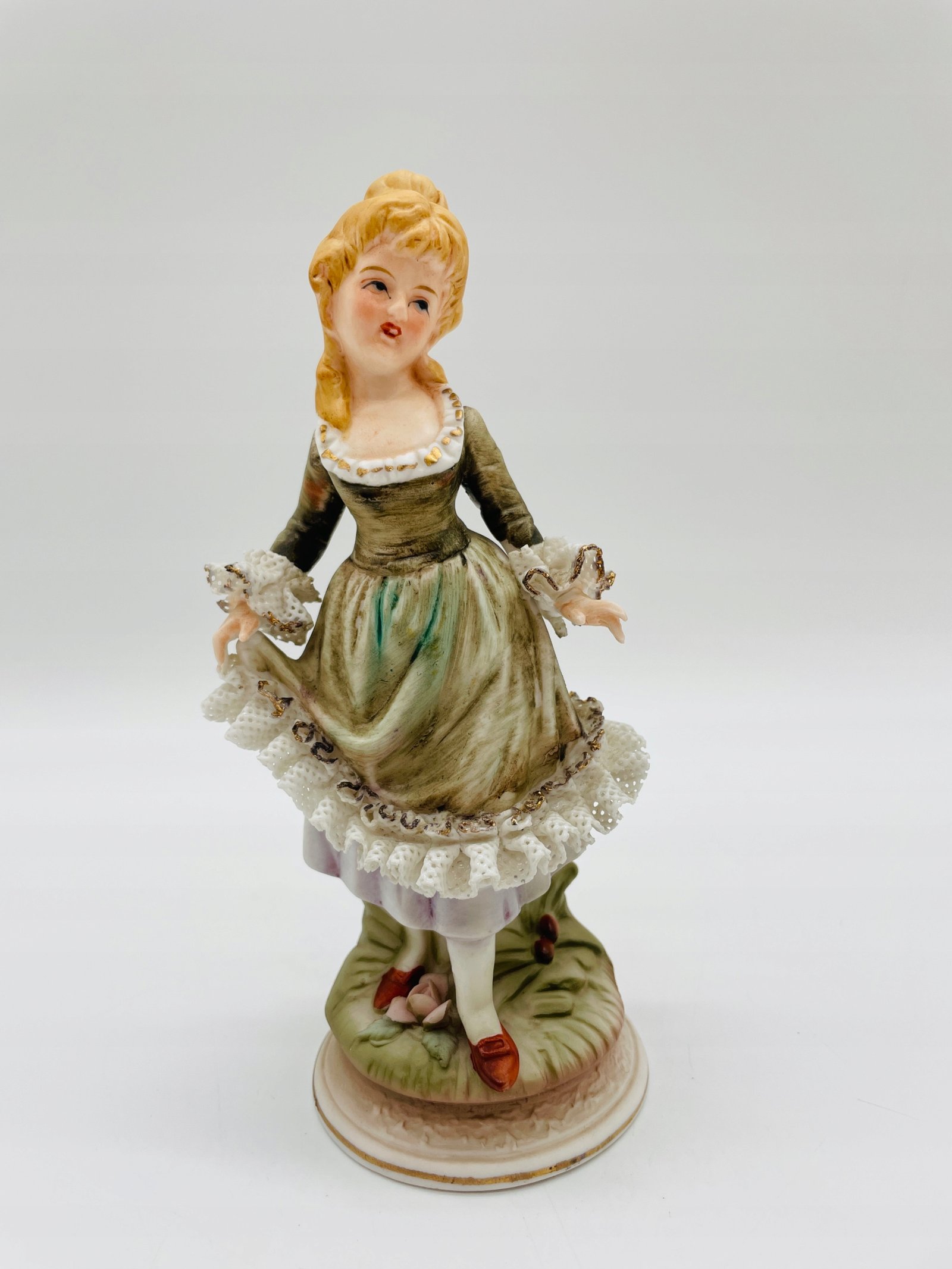 Figurka porcelana dama z koronką w zielonej sukni