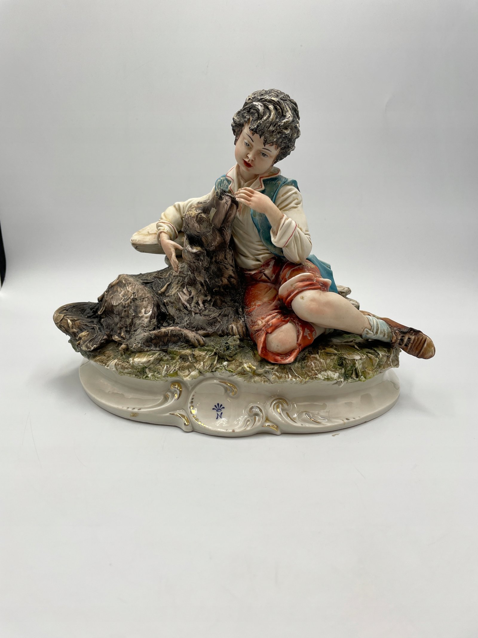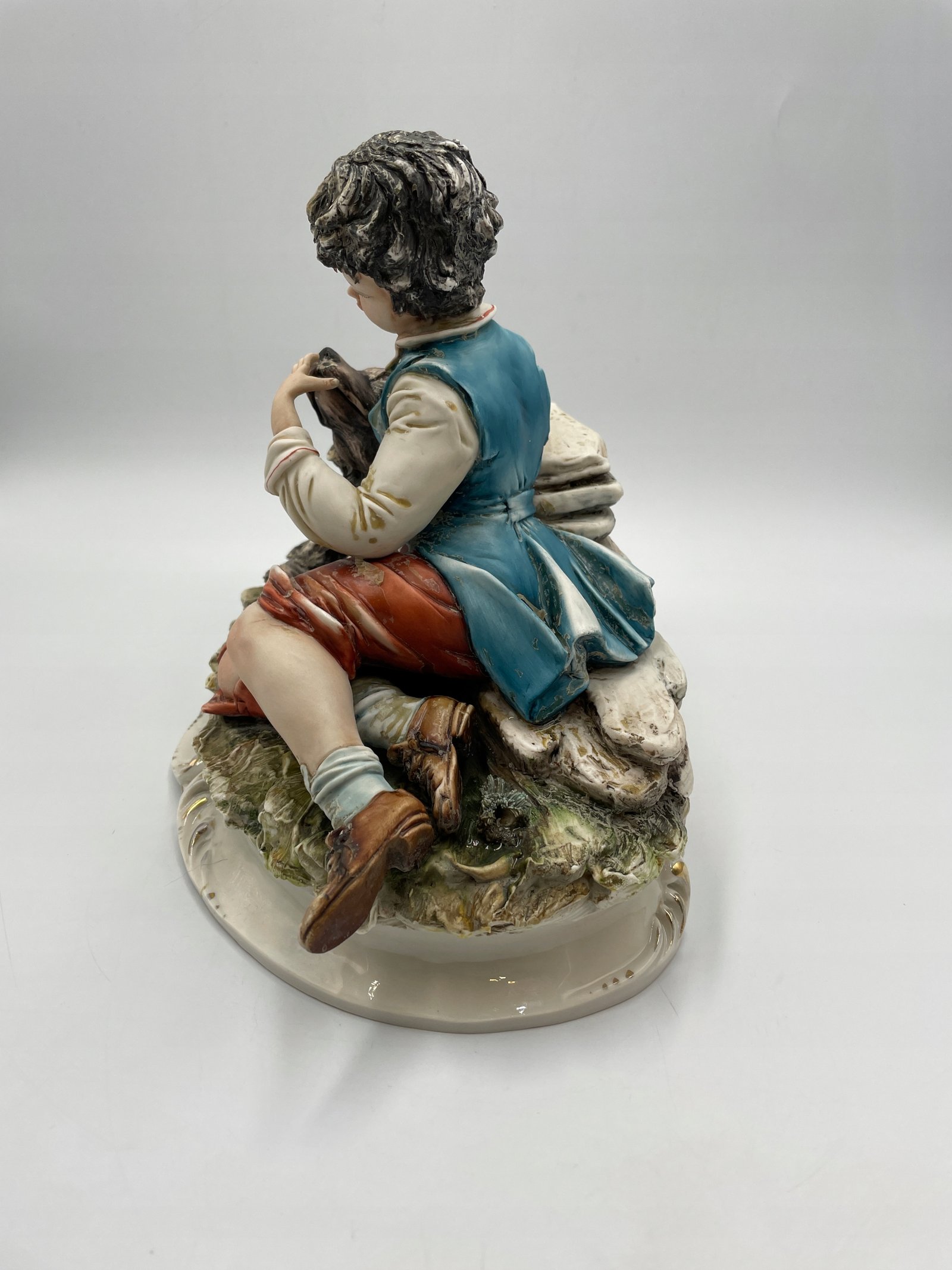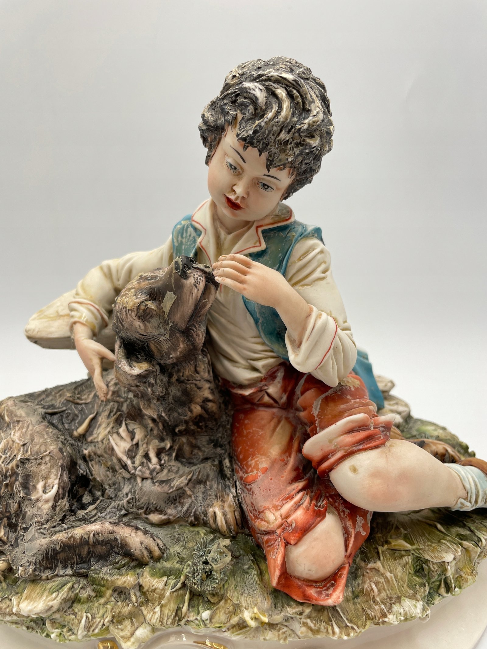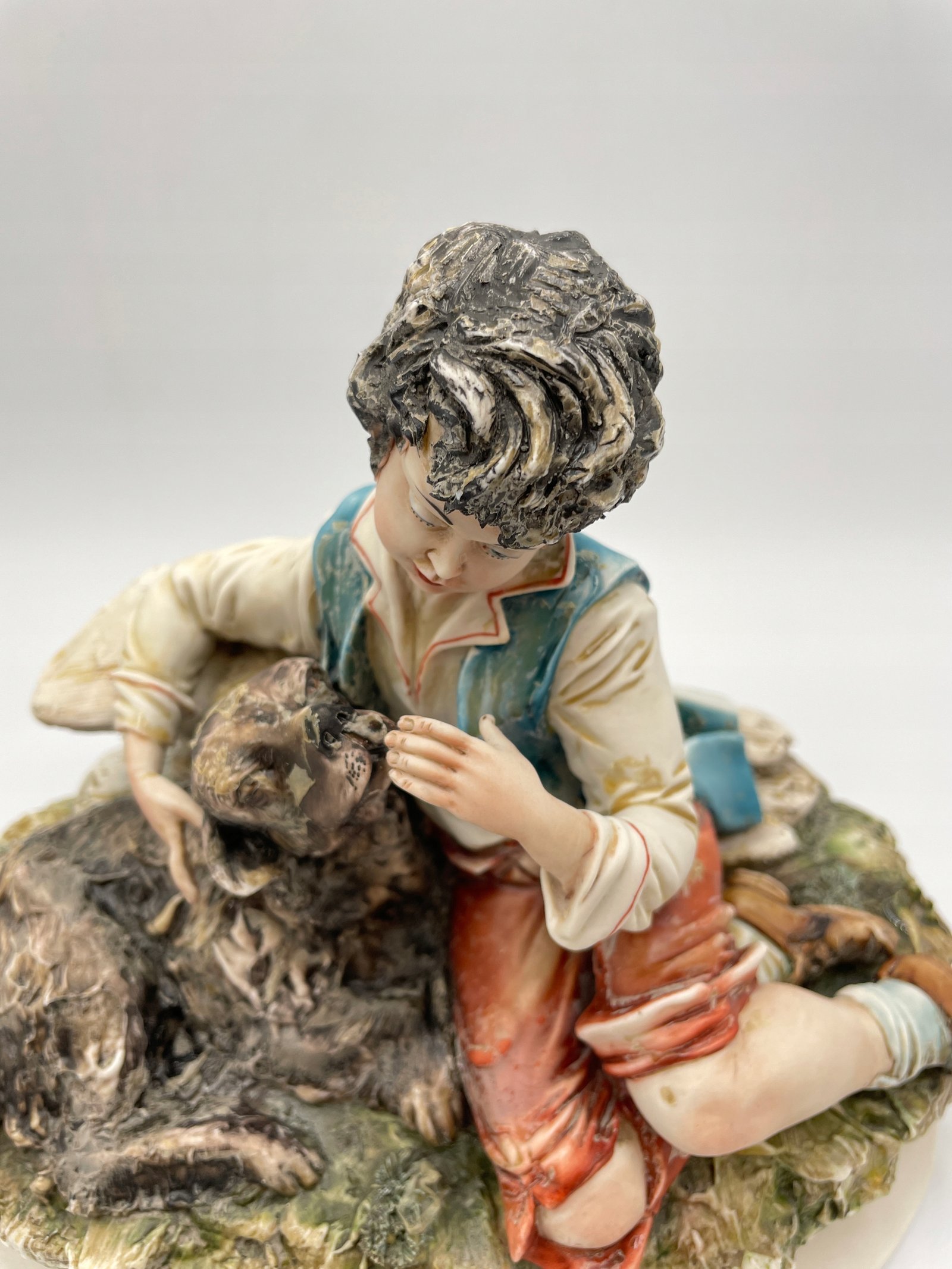 Ręcznie wykonana porcelanowa figurka przedstawiająca chłopca z psem. Figurka wykonana jest w realistycznym stylu, z dokładnym odwzorowaniem szczegółów oraz naturalnymi odcieniami farb. Chłopiec ubrany jest w tradycyjny strój, delikatnie obejmuje psa, przedstawiając сценę przyjaźni i troski.