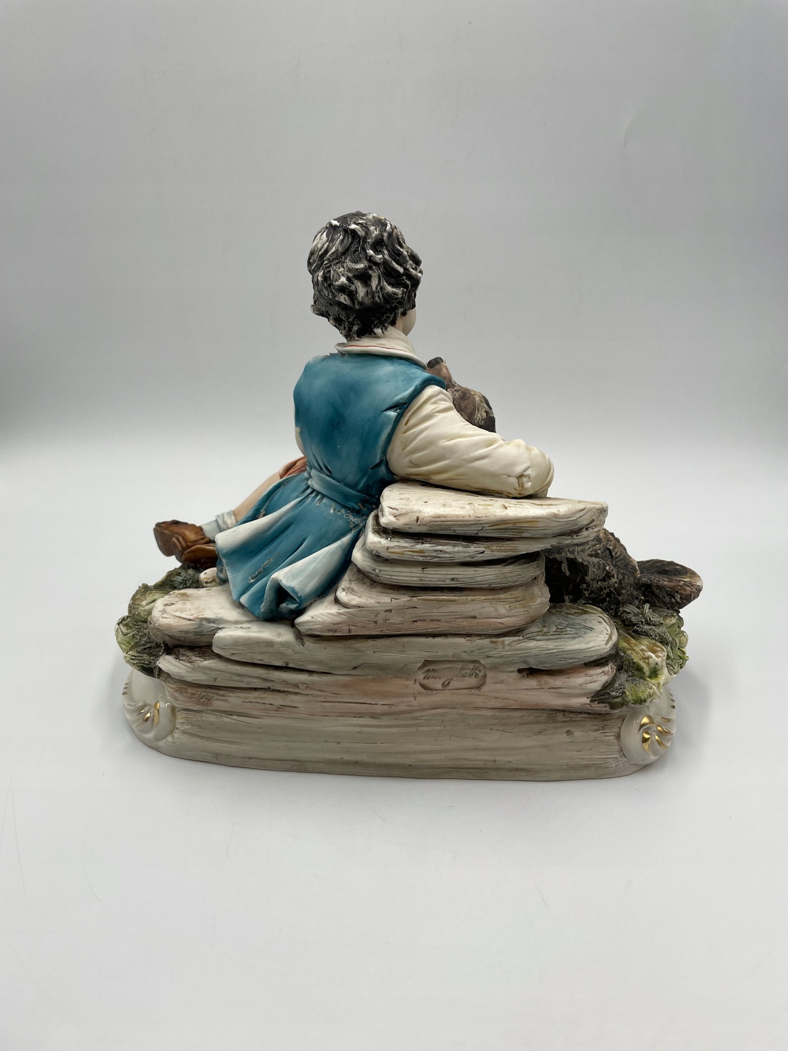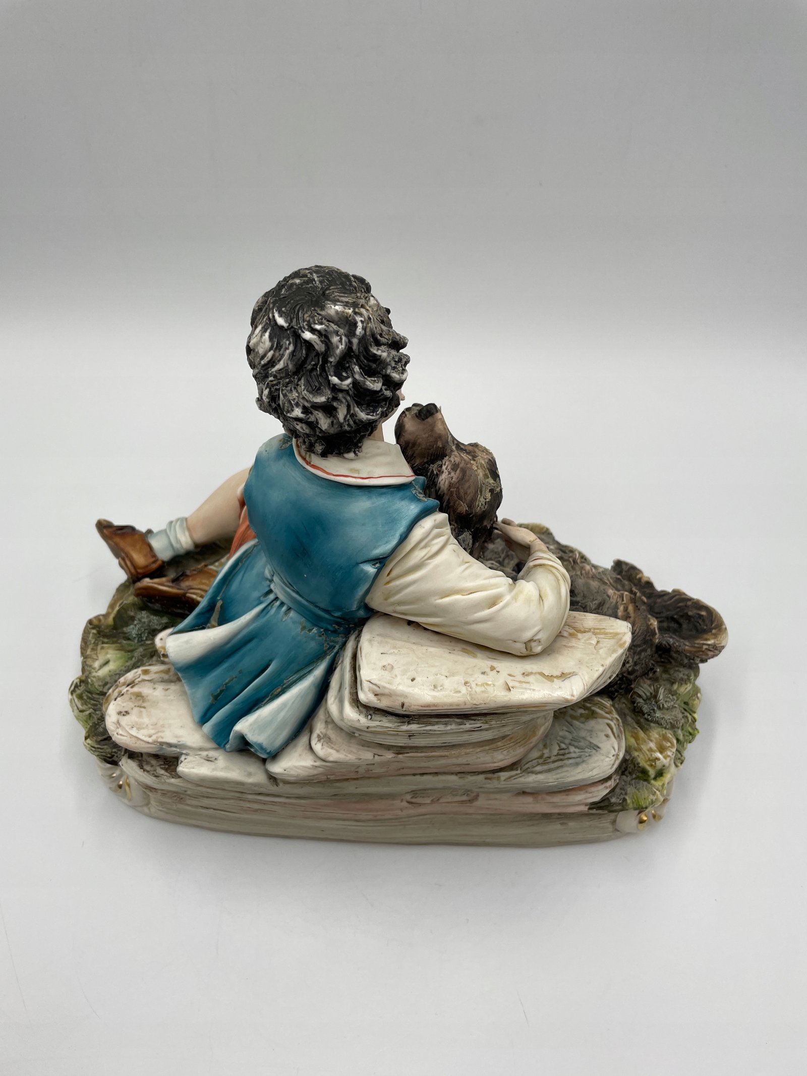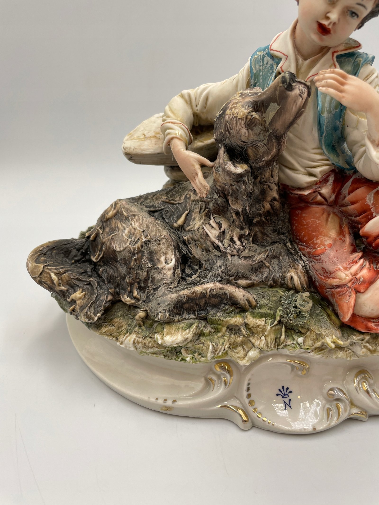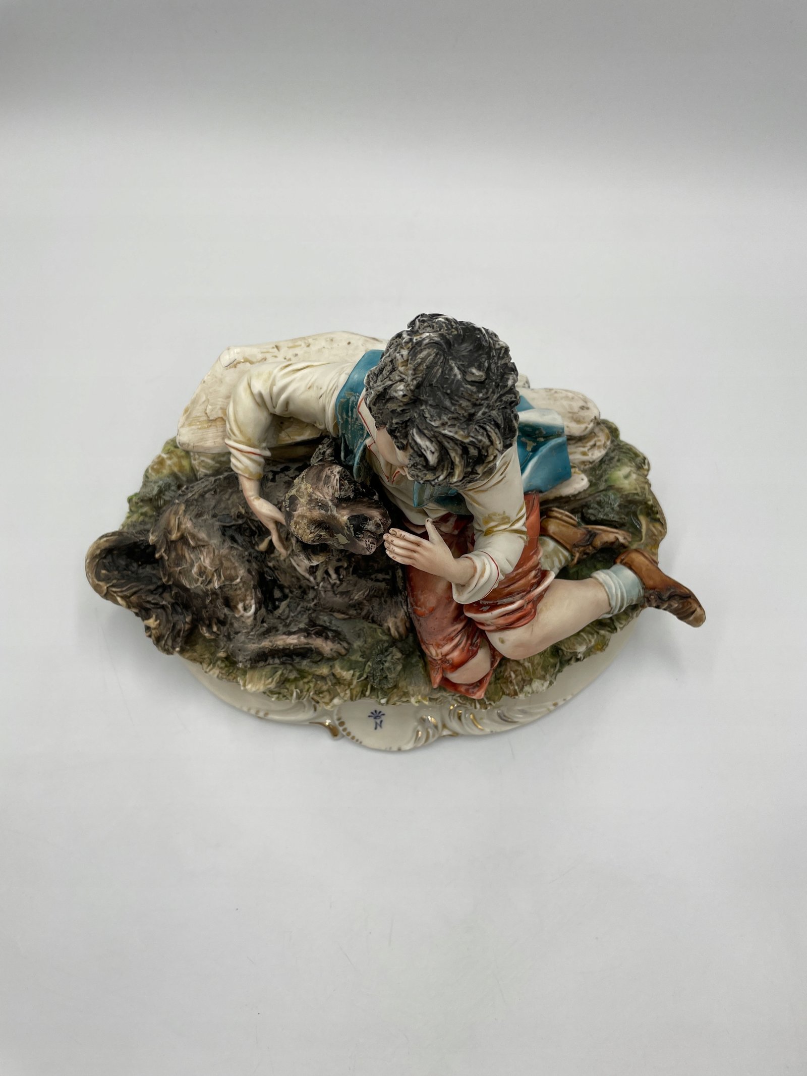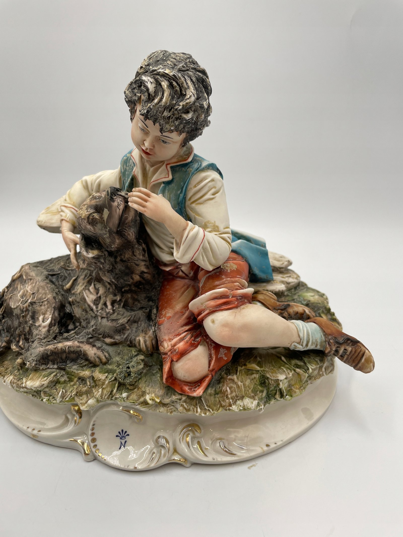 Ręcznie wykonana porcelanowa figurka przedstawiająca chłopca z psem. Figurka wykonana jest w realistycznym stylu, z dokładnym odwzorowaniem szczegółów oraz naturalnymi odcieniami farb. Chłopiec ubrany jest w tradycyjny strój, delikatnie obejmuje psa, przedstawiając сценę przyjaźni i troski.