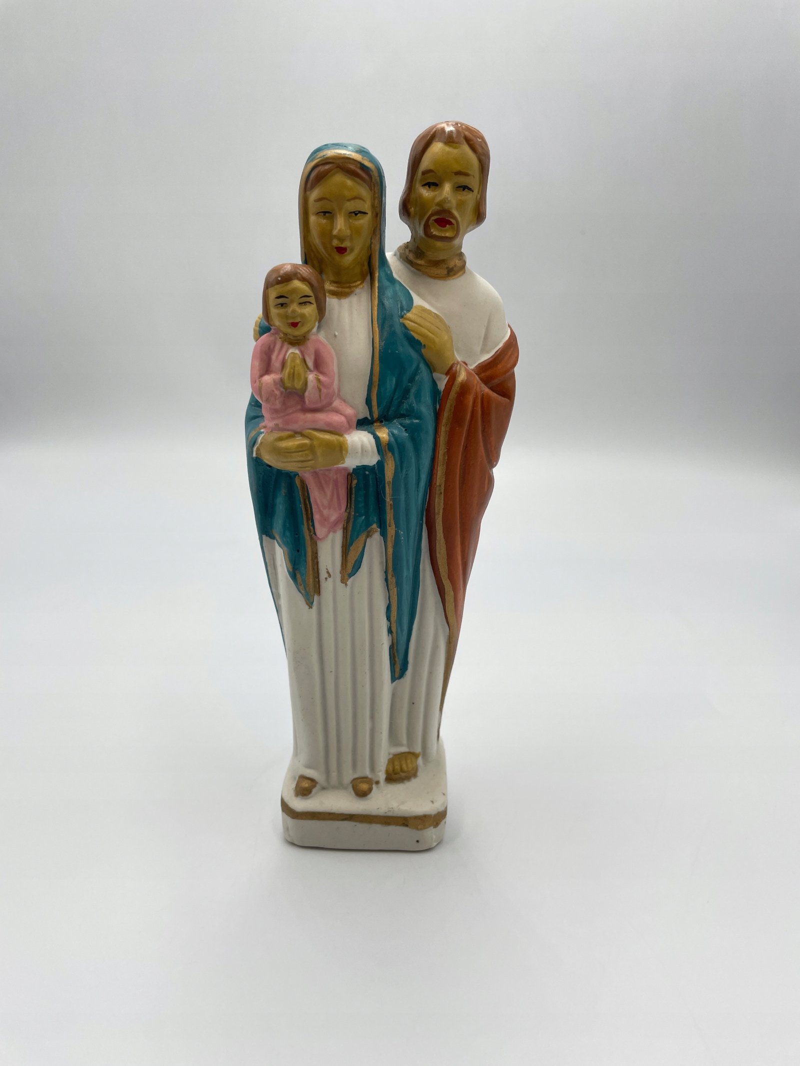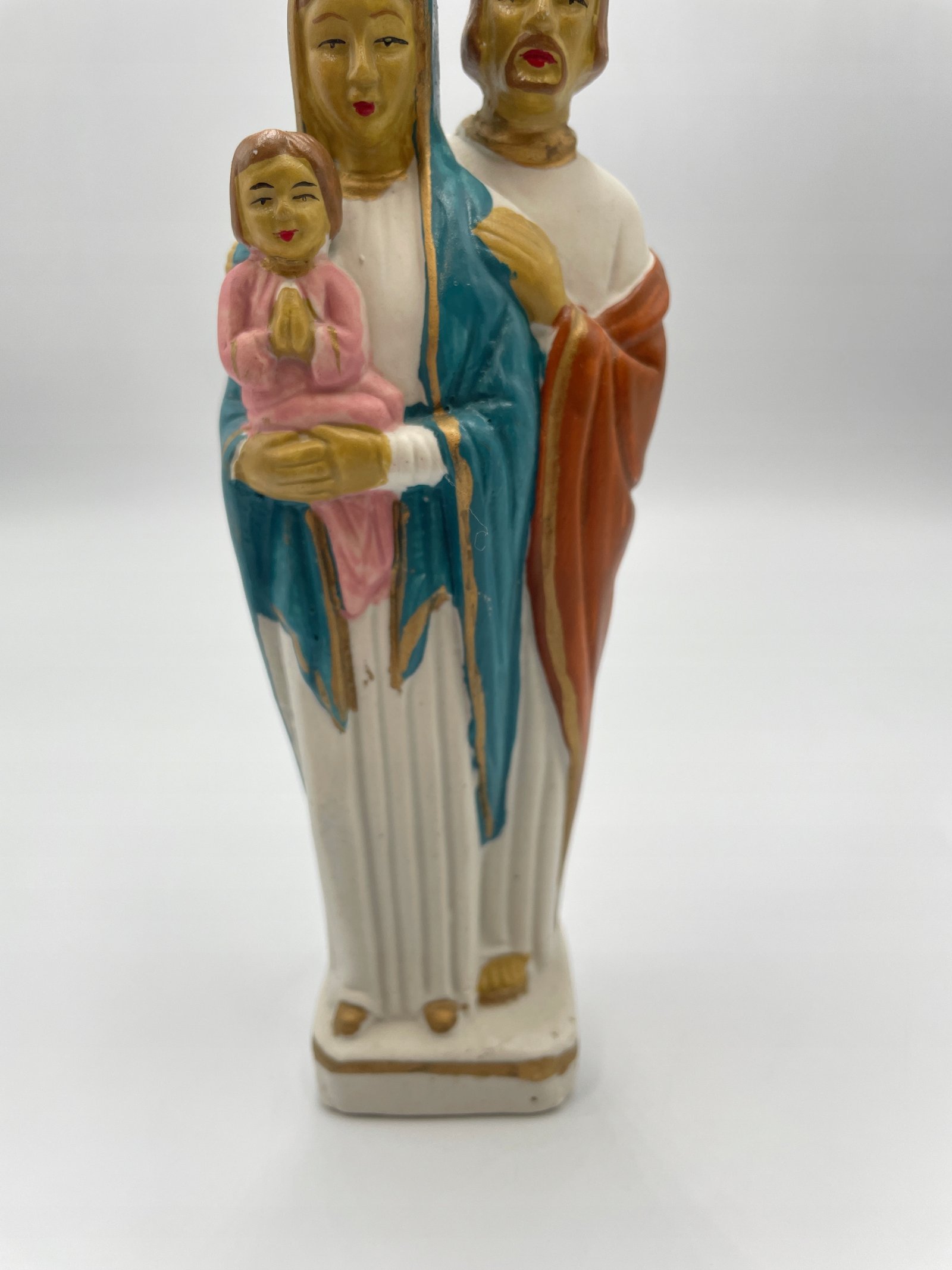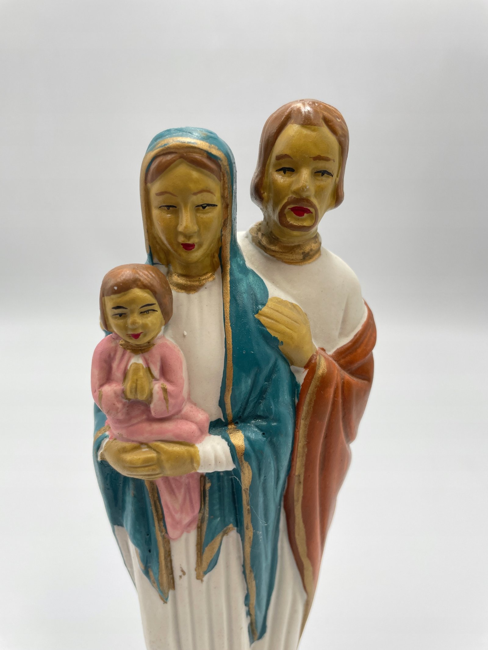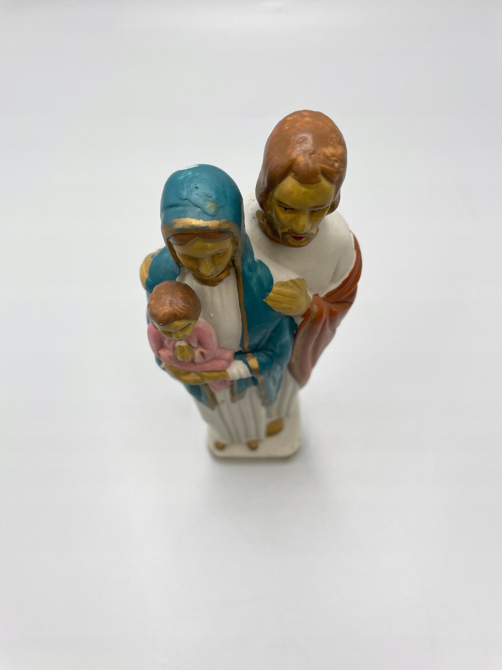 Kolorowa figurka przedstawiająca Świętą Rodzinę: Maryję, Józefa i Dzieciątko Jezus.