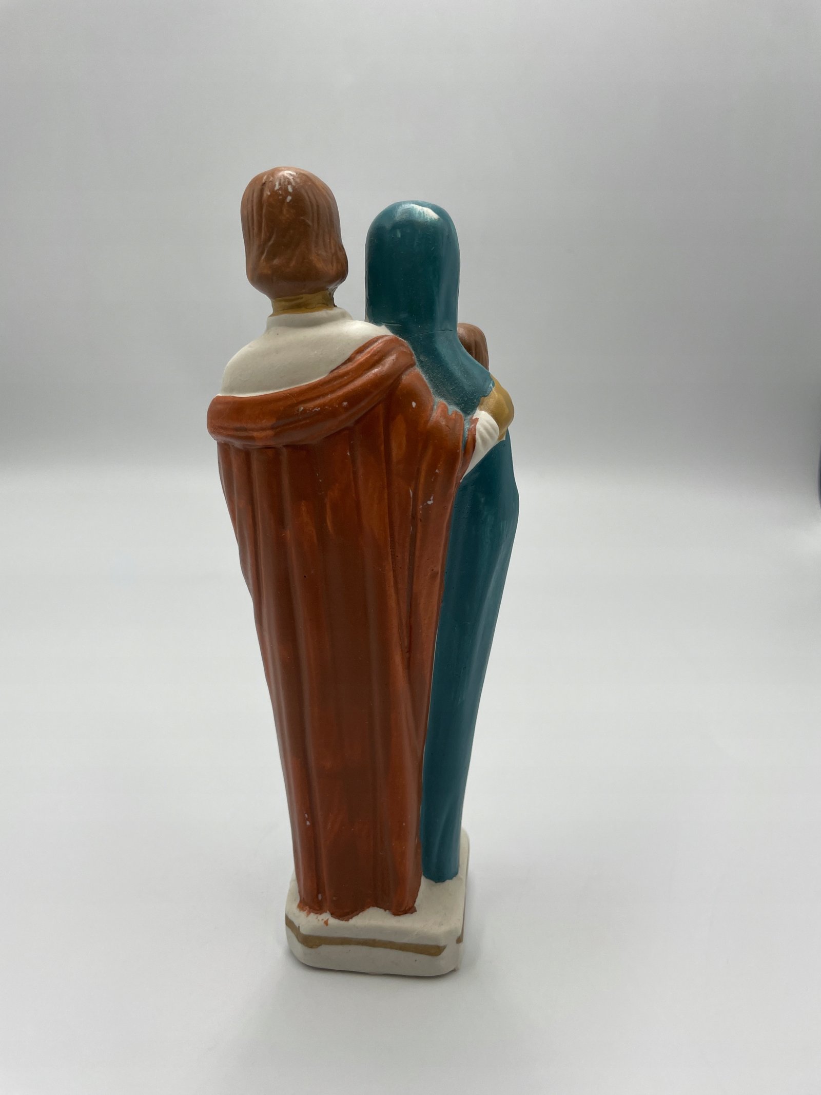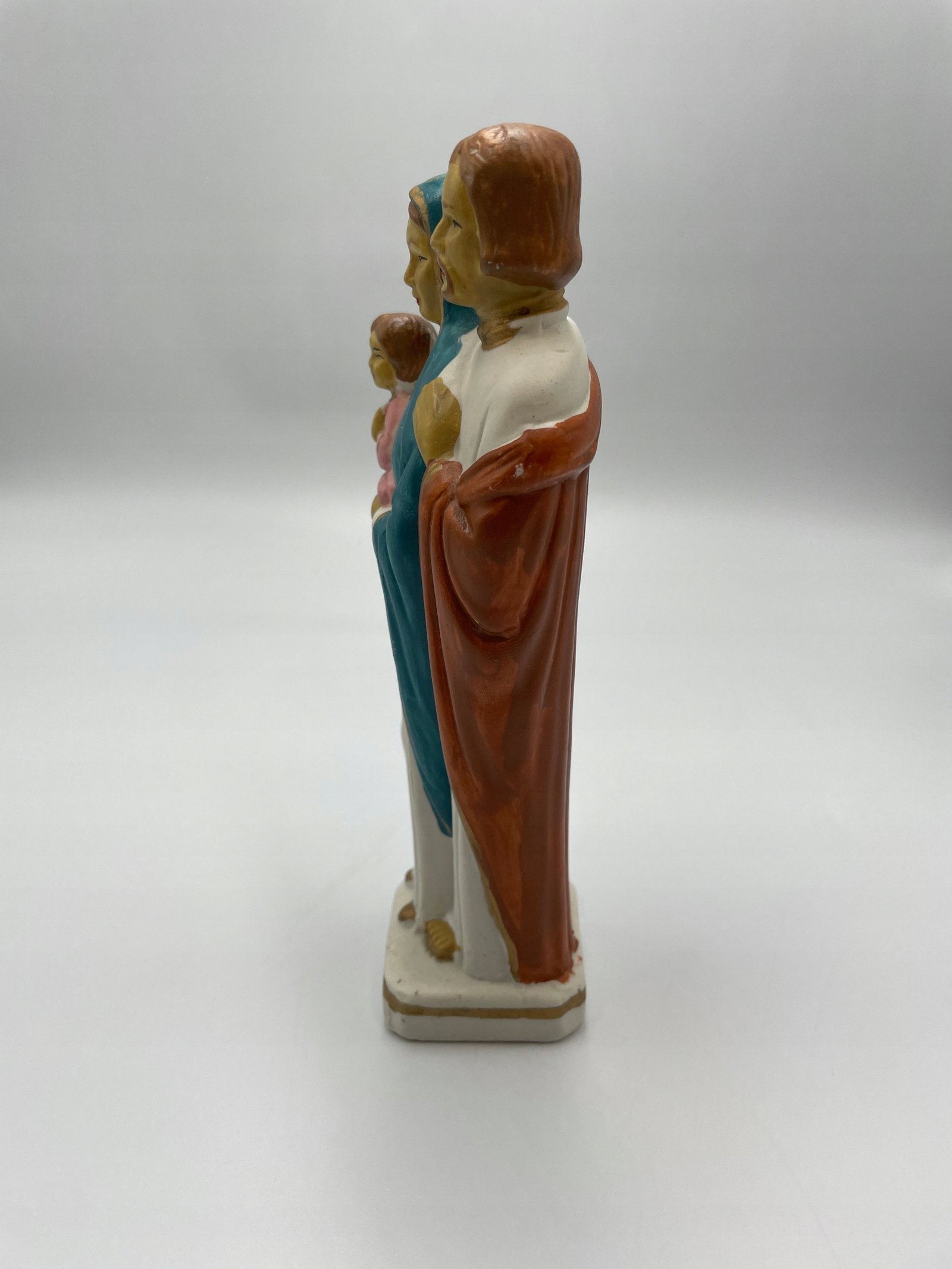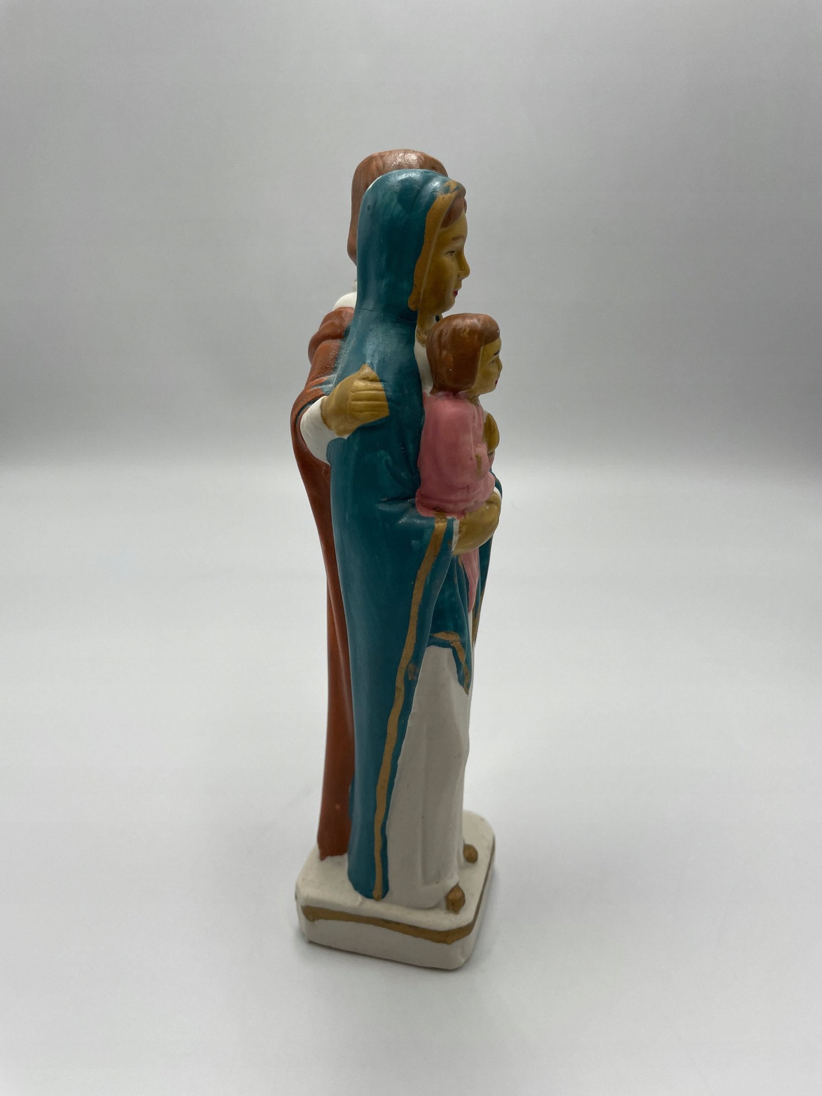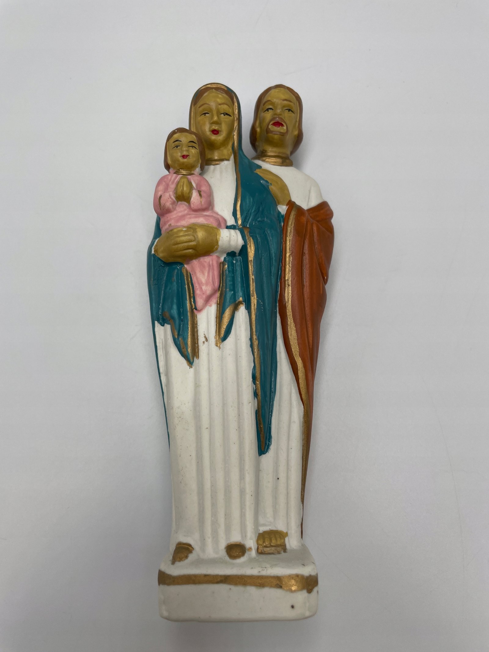 Kolorowa figurka przedstawiająca Świętą Rodzinę: Maryję, Józefa i Dzieciątko Jezus.