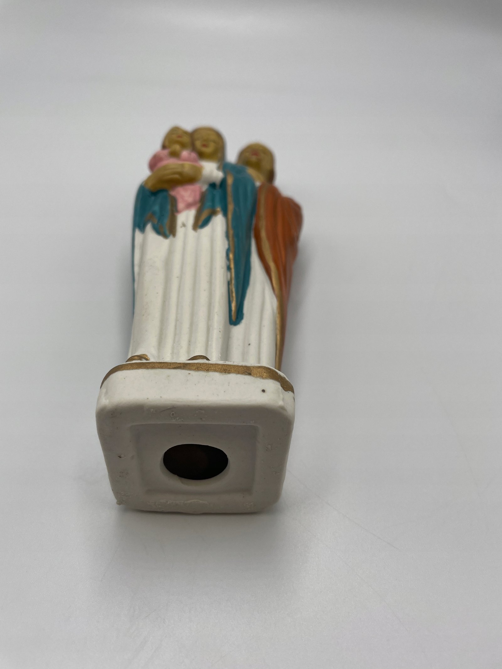 Wykonana z ceramiki lub porcelitu, ręcznie malowana, z miejscem otwartym od spodu (możliwe wcześniejsze użycie jako naczynie lub podstawka na święconą wodę).
