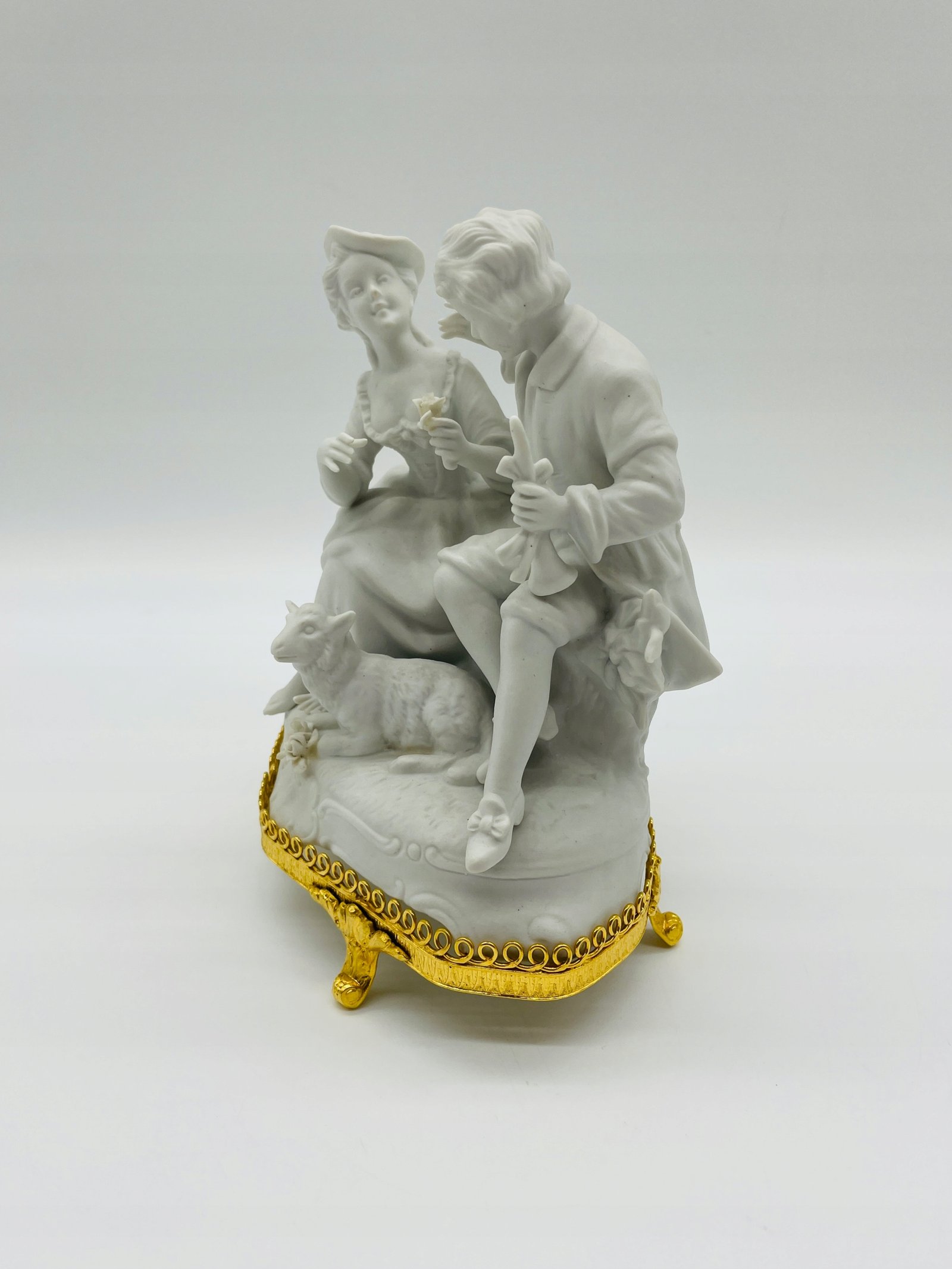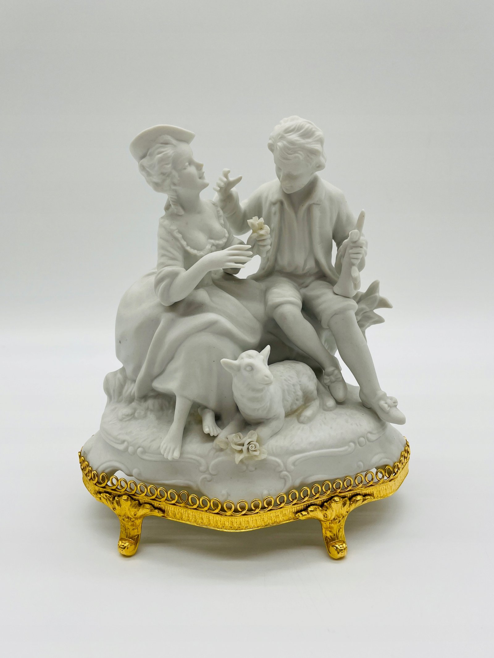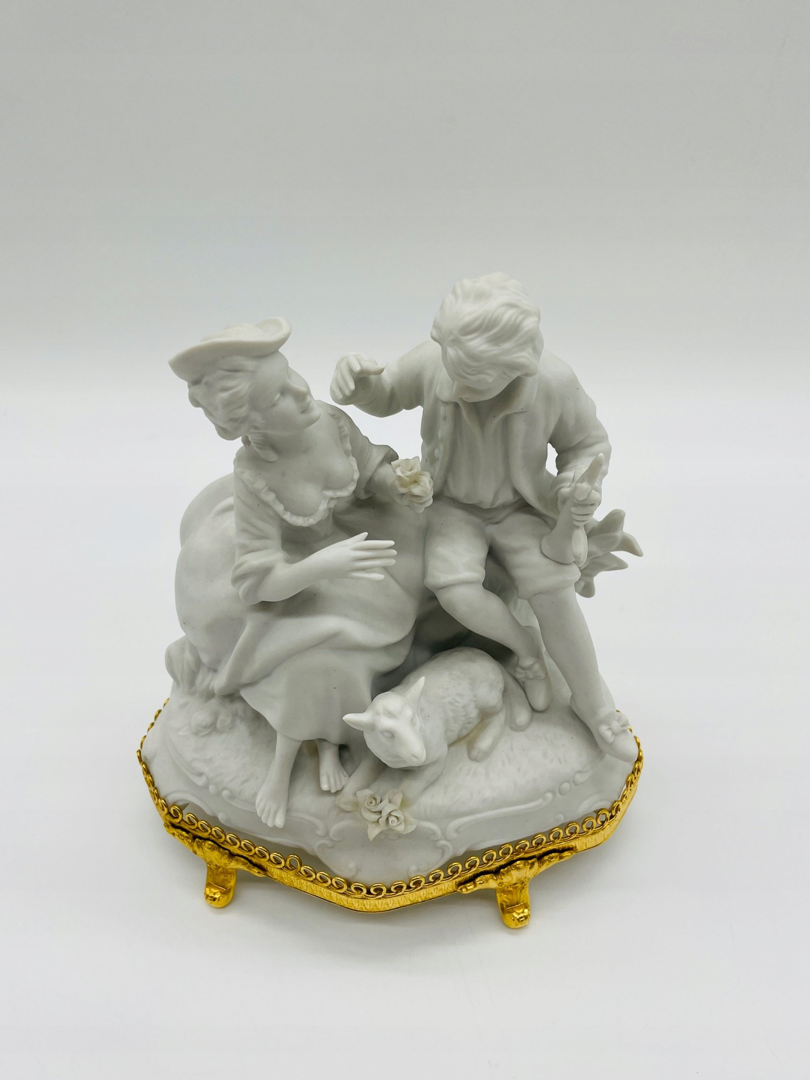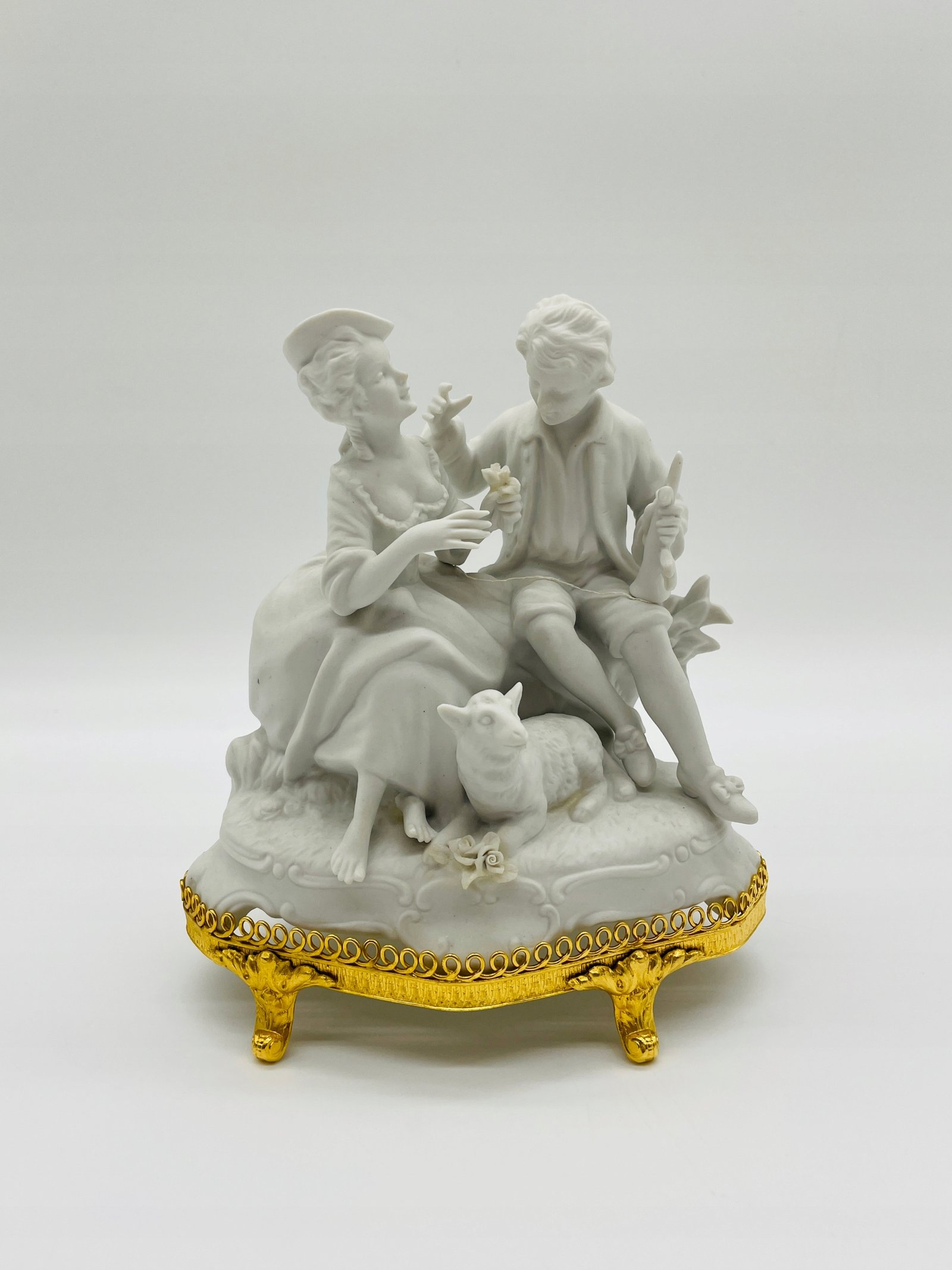 Figurka Unterweissbach Niemcy ok.1960 para z owcą pozłacana podstawa