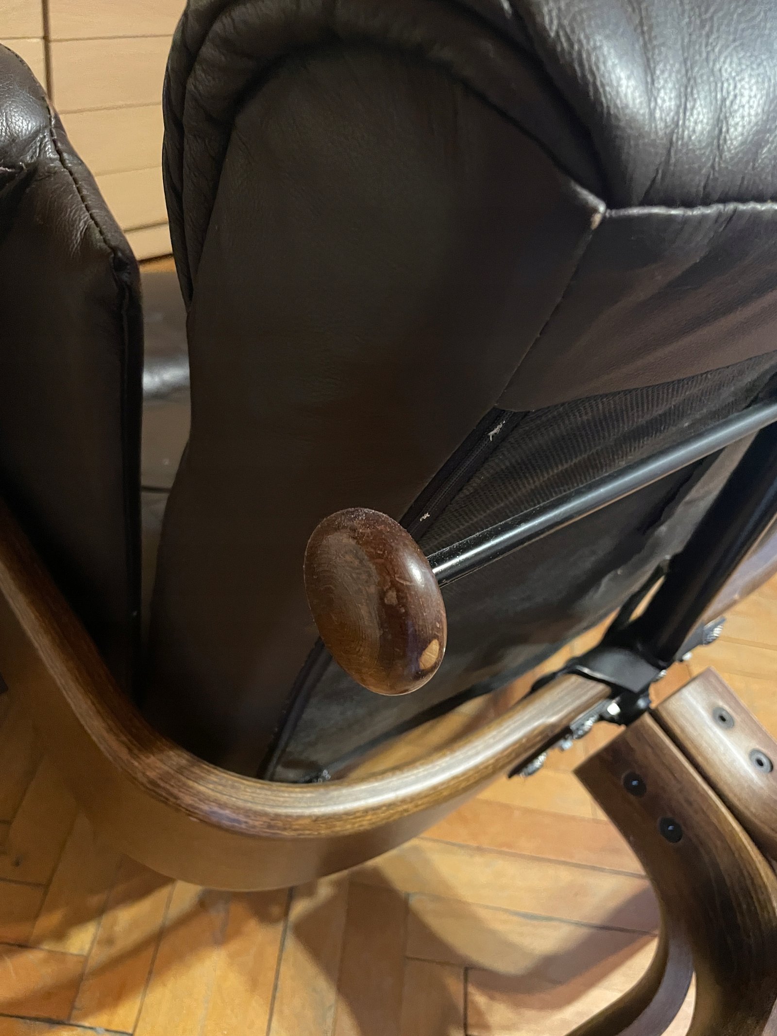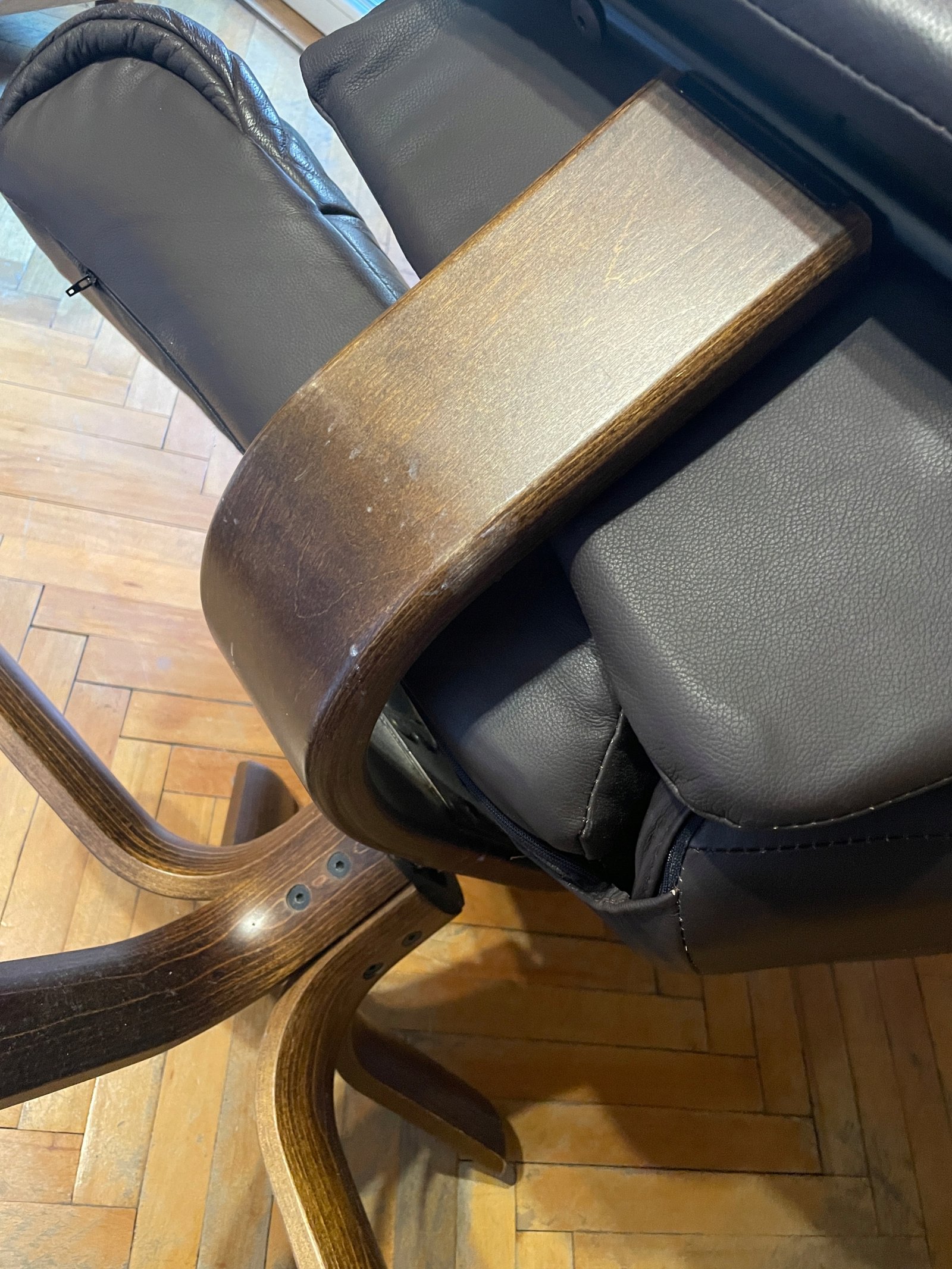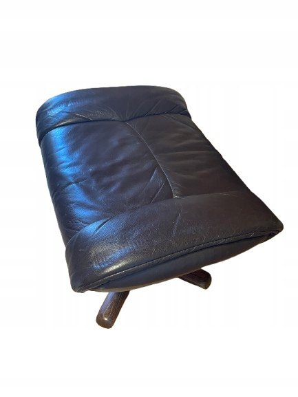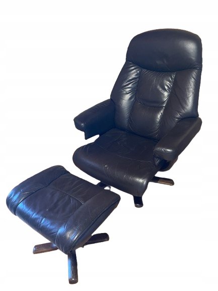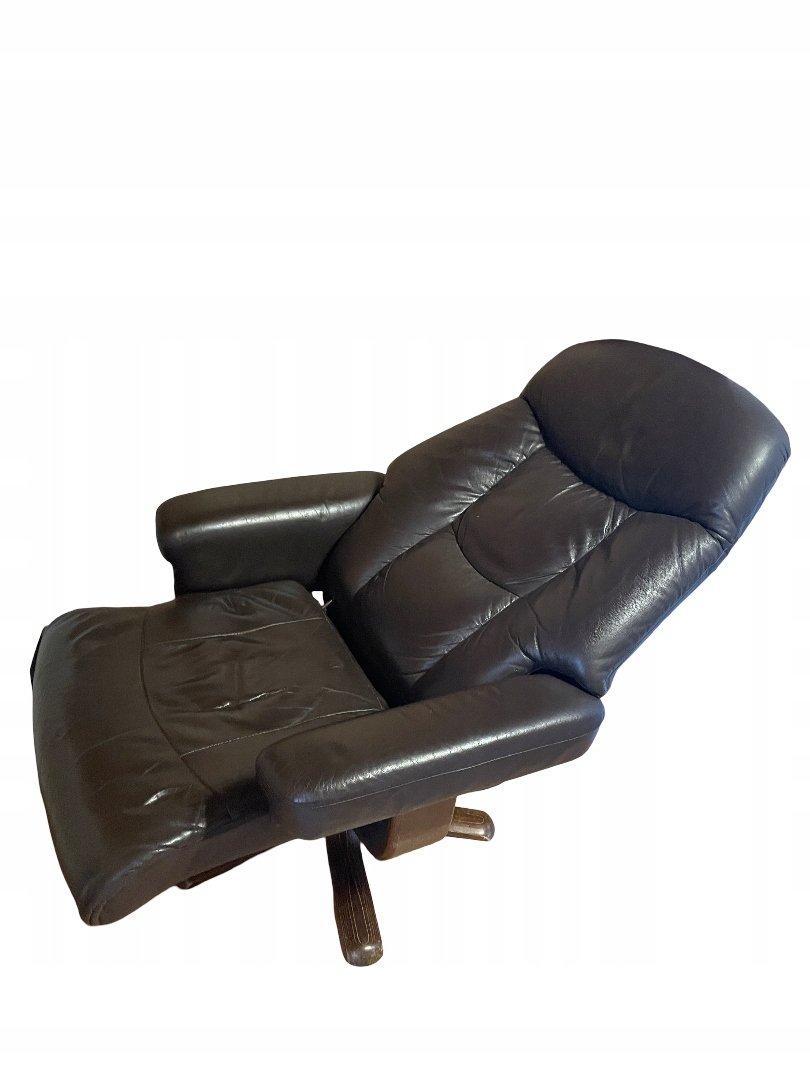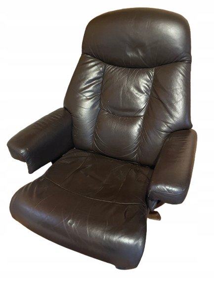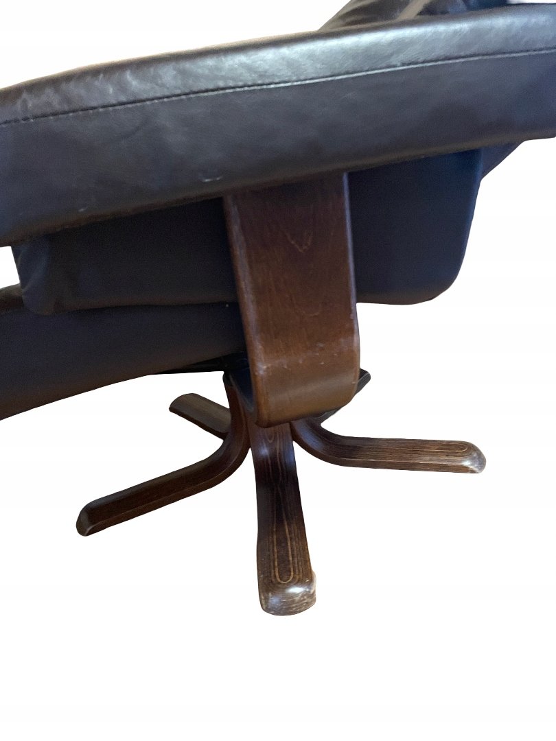 Fotel typu recliner wykonany z naturalnej skóry w kolorze ciemnobrązowym z osobnym podnóżkiem. Podstawa z giętego drewna o charakterystycznym skandynawskim wzornictwie. Fotel posiada funkcję regulacji nachylenia oparcia, blokowaną boczną drewnianą rączką. Tapicerka ze skóry wyposażona jest w zamki błyskawiczne, co umożliwia łatwe zdejmowanie i pielęgnację.