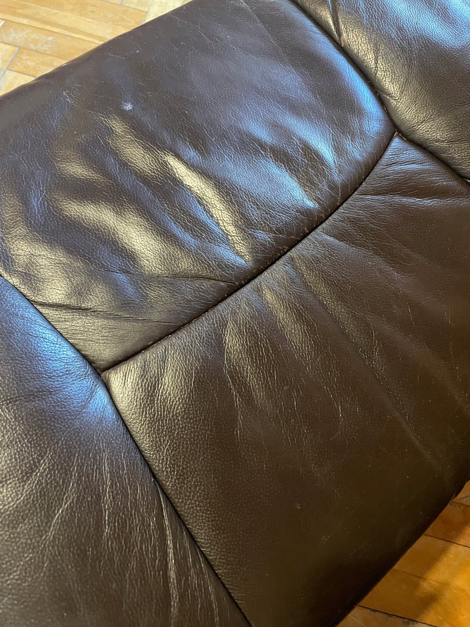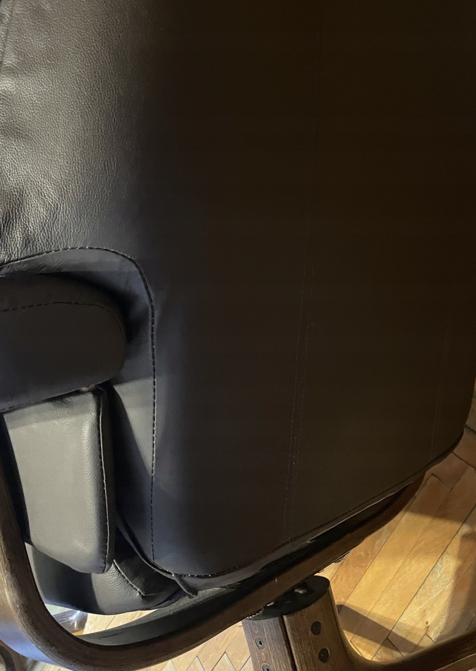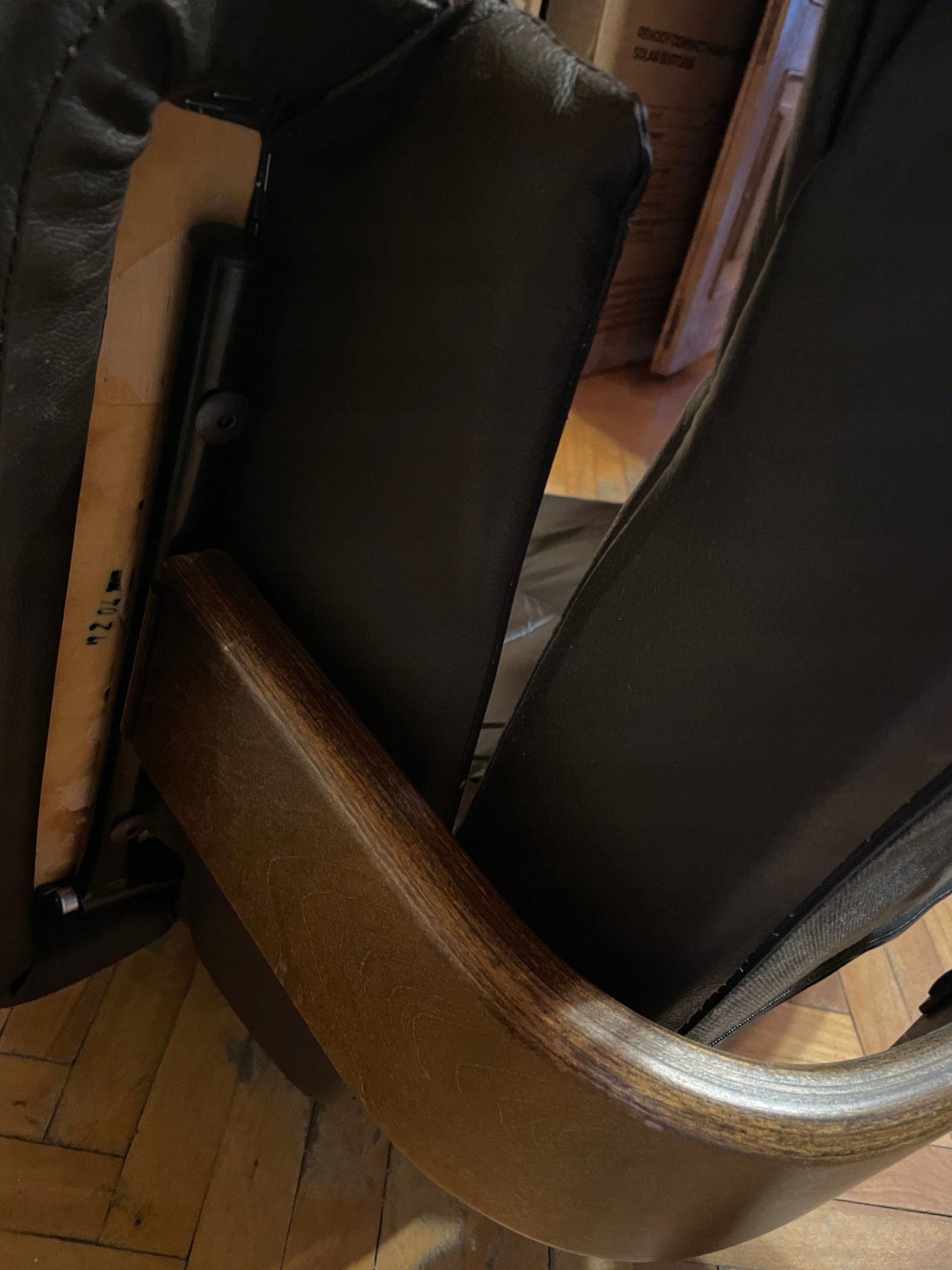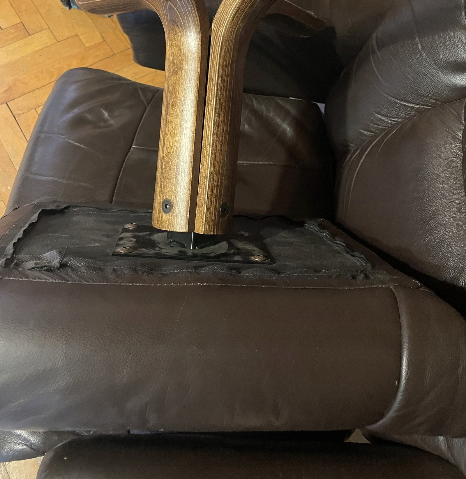 Fotel typu recliner wykonany z naturalnej skóry w kolorze ciemnobrązowym z osobnym podnóżkiem. Podstawa z giętego drewna o charakterystycznym skandynawskim wzornictwie. Fotel posiada funkcję regulacji nachylenia oparcia, blokowaną boczną drewnianą rączką. Tapicerka ze skóry wyposażona jest w zamki błyskawiczne, co umożliwia łatwe zdejmowanie i pielęgnację.