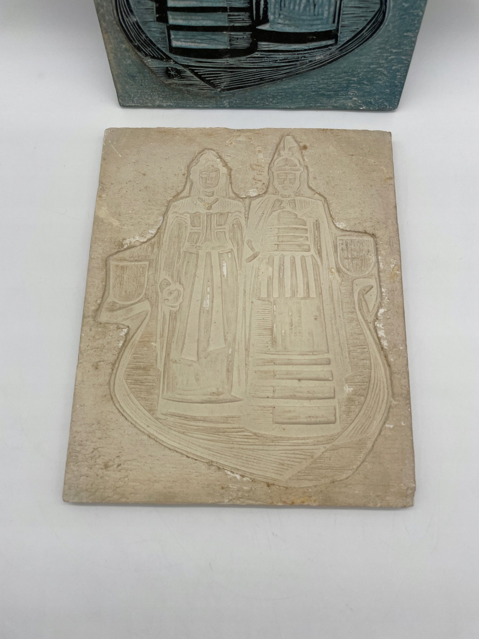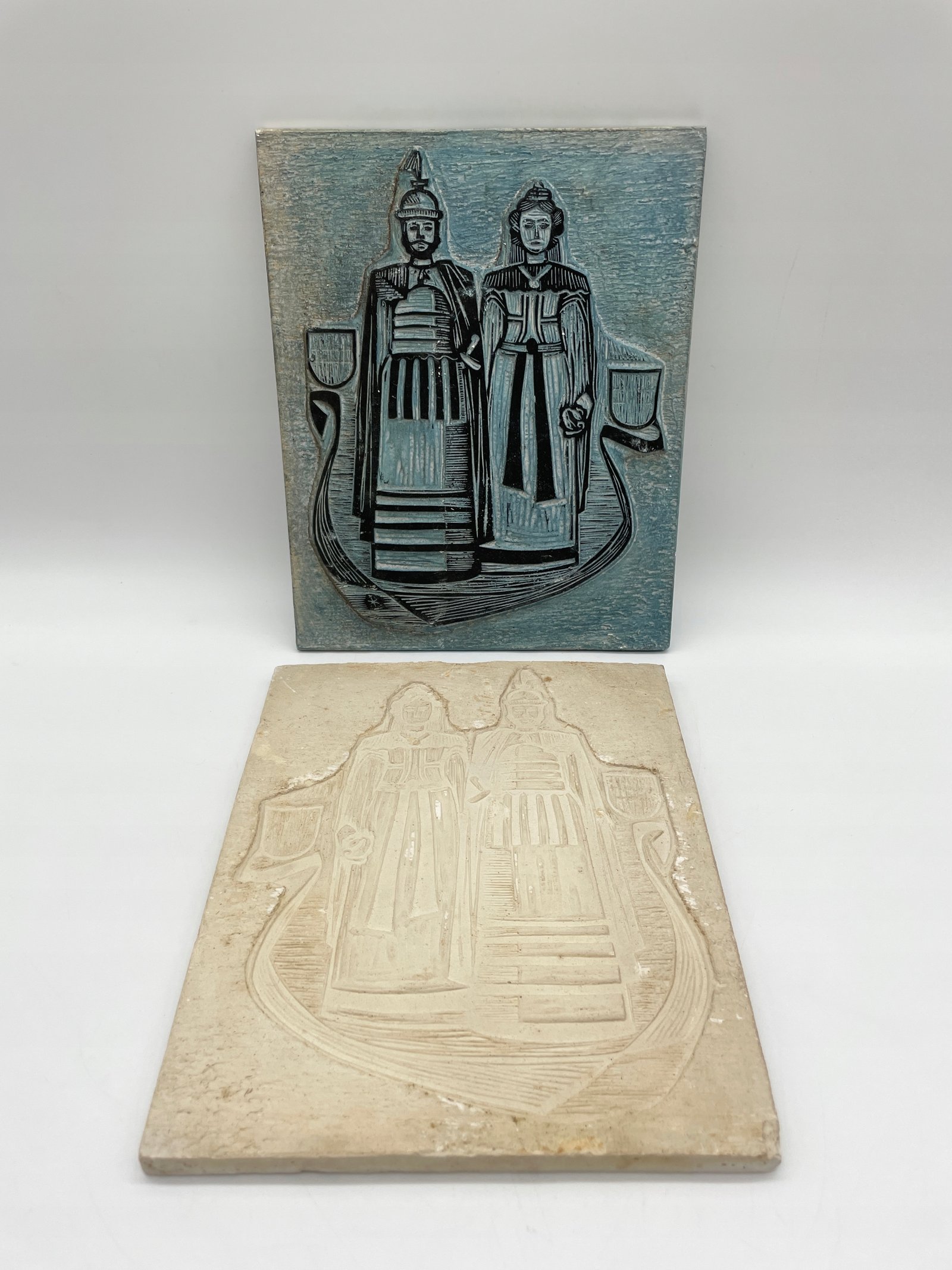 Dekoracyjna forma gipsowa składająca się z dwóch elementów: głównej płyty z reliefem oraz dopasowanej wkładki. Przedstawia stojącą parę w historycznych strojach, być może w stylu średniowiecznym lub wczesnonowożytnym. Kompozycja uzupełniona herbami i wstęgami, tworzącymi heraldyczny układ. Górna część pokryta błękitnoszarą farbą, dolna pozostaje w naturalnym kolorze gipsu. Elementy dokładnie do siebie pasują.
