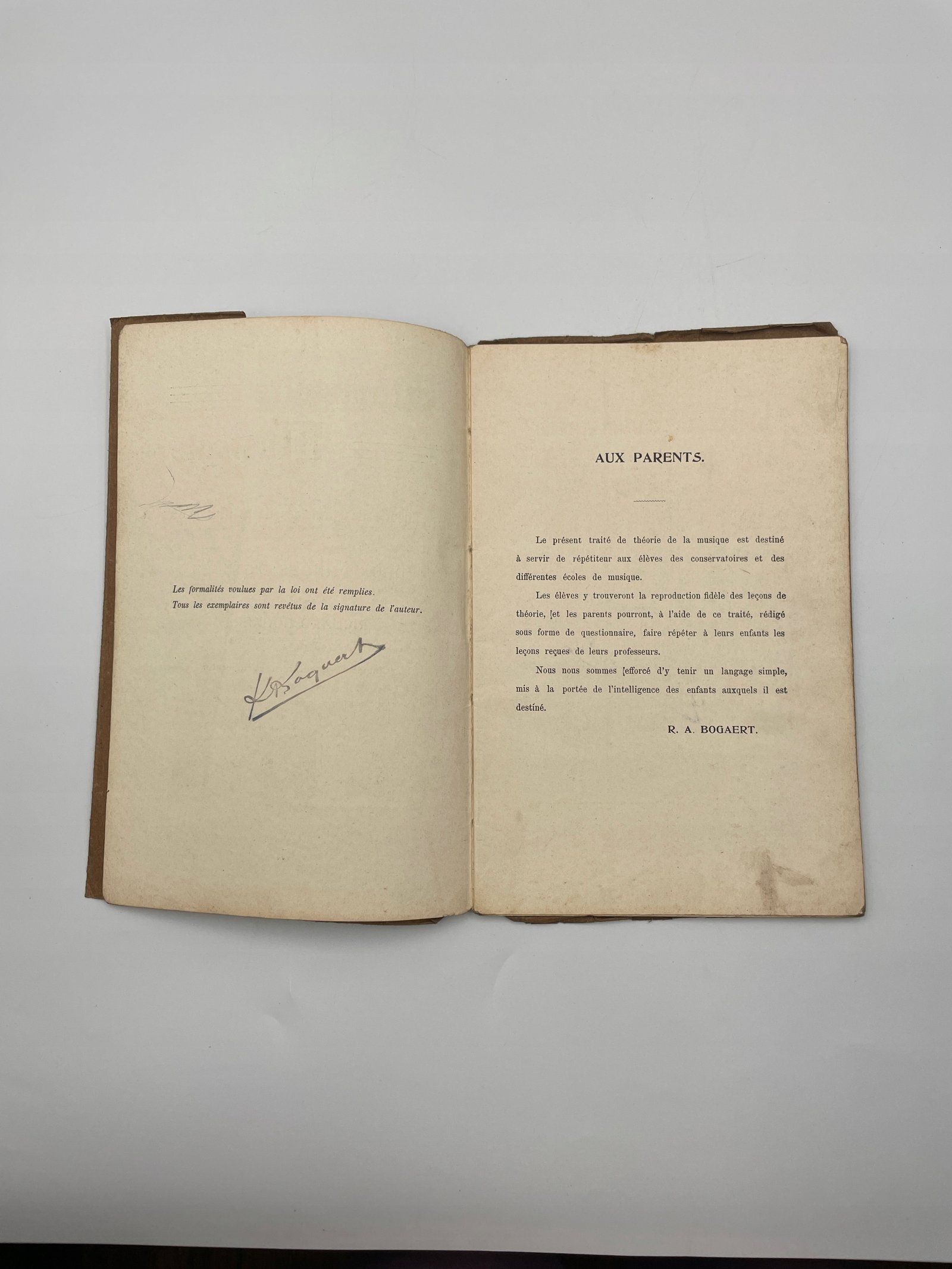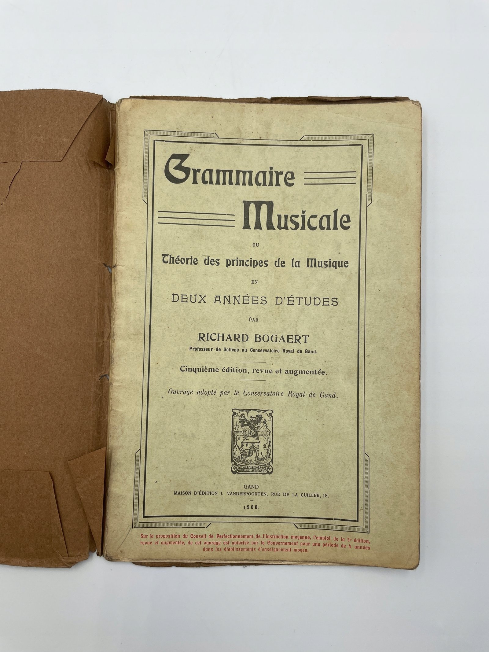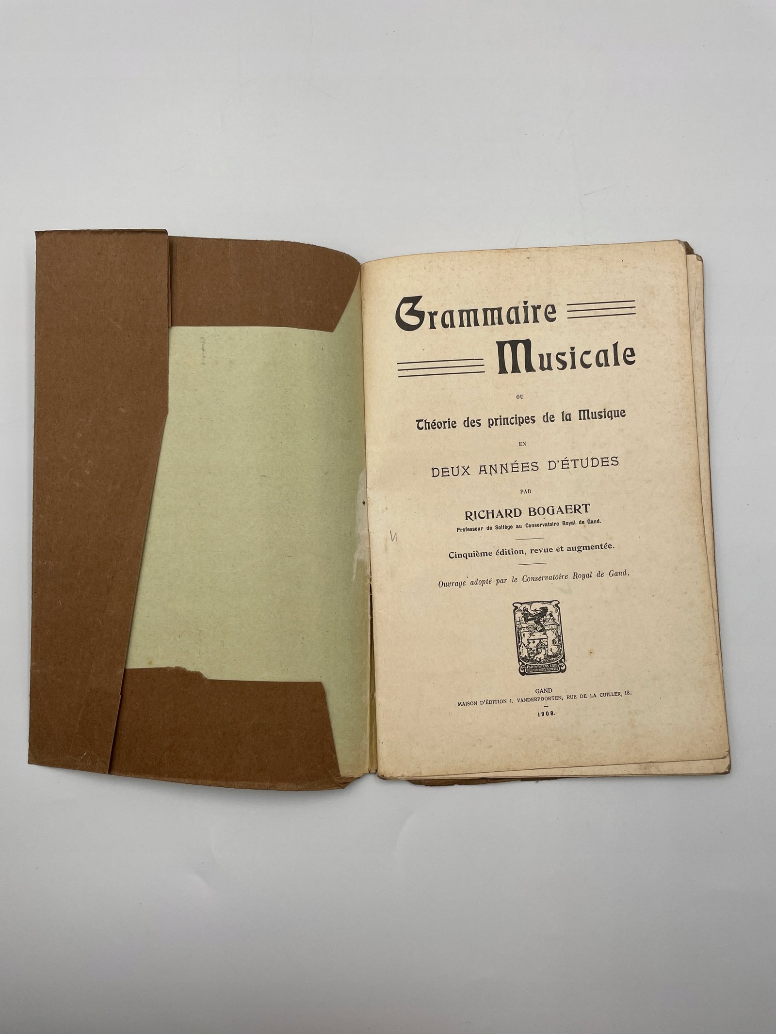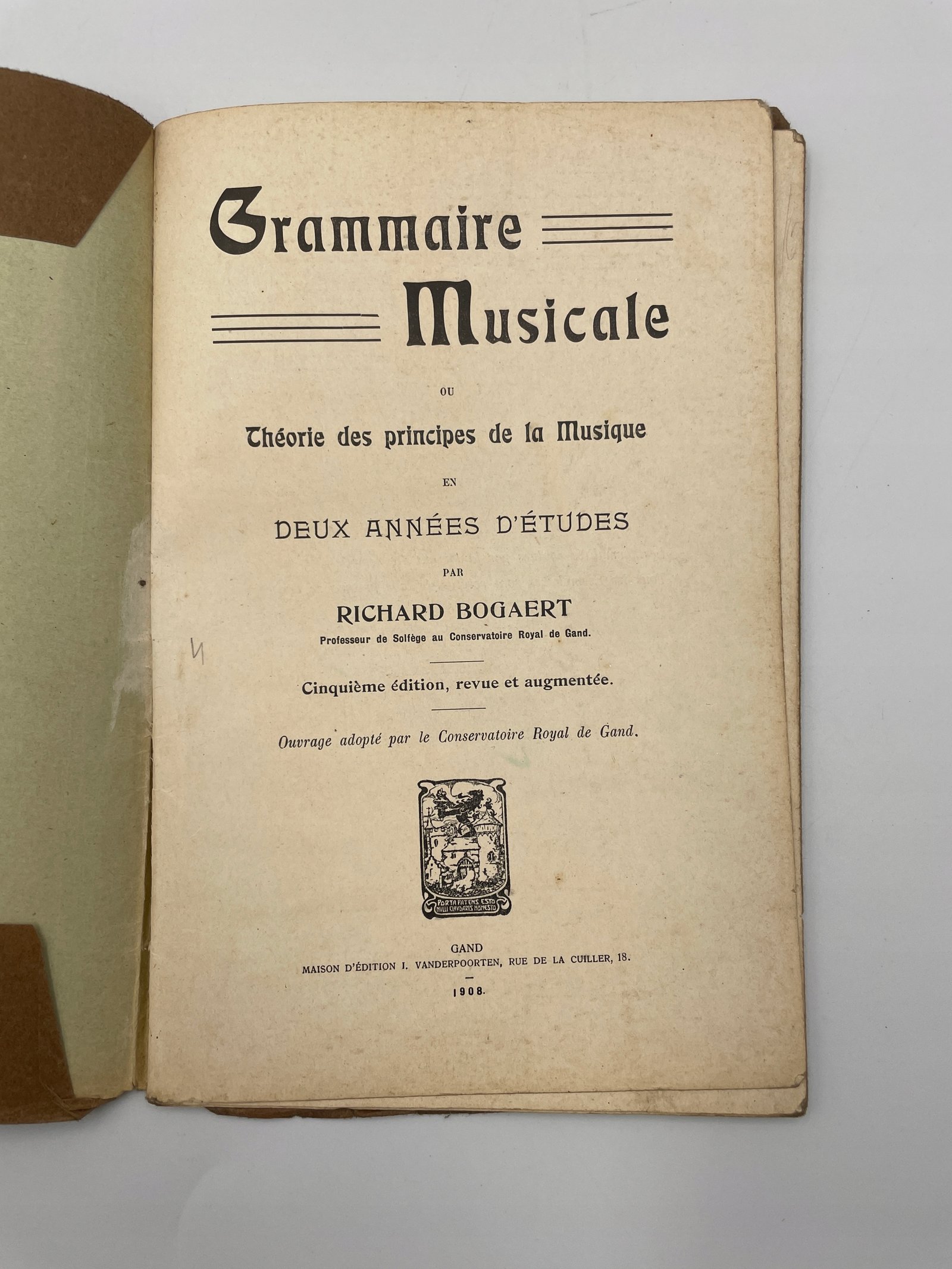 Rzadka antykwaryczna publikacja z 1908 roku — „Grammaire Musicale ou Théorie des principes de la Musique en deux années d’études” autorstwa Richarda Bogaerta, profesora solfeżu w Królewskim Konserwatorium w Gandawie.