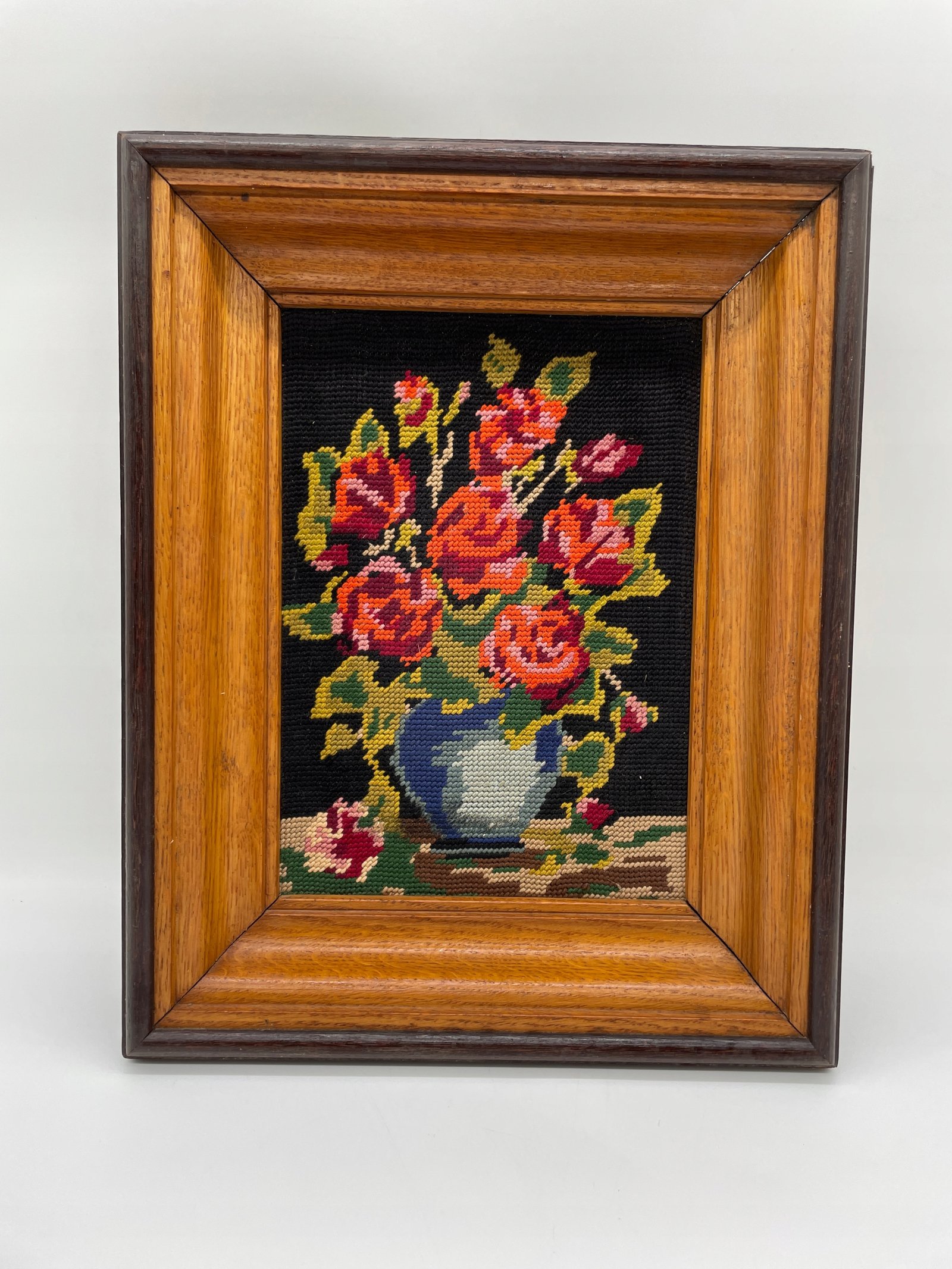 Haft dekoracyjny z kwiatami w drewnianej ramie Belgia lata 60