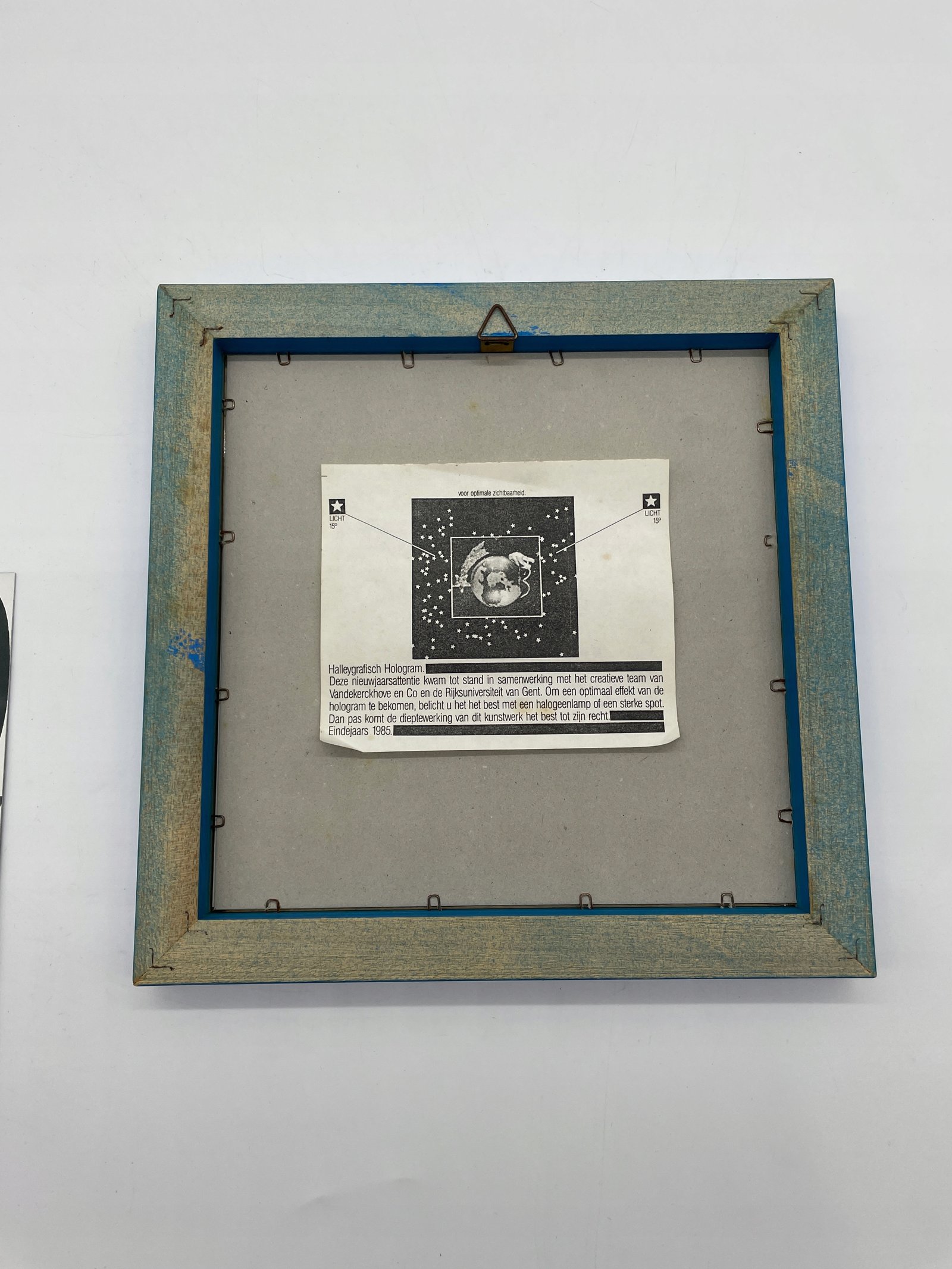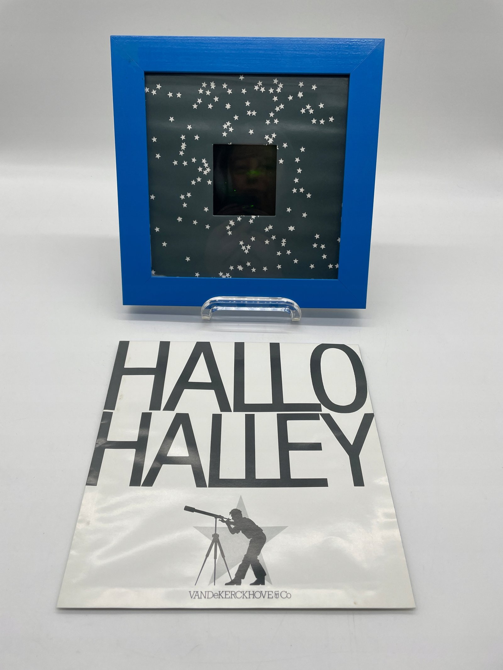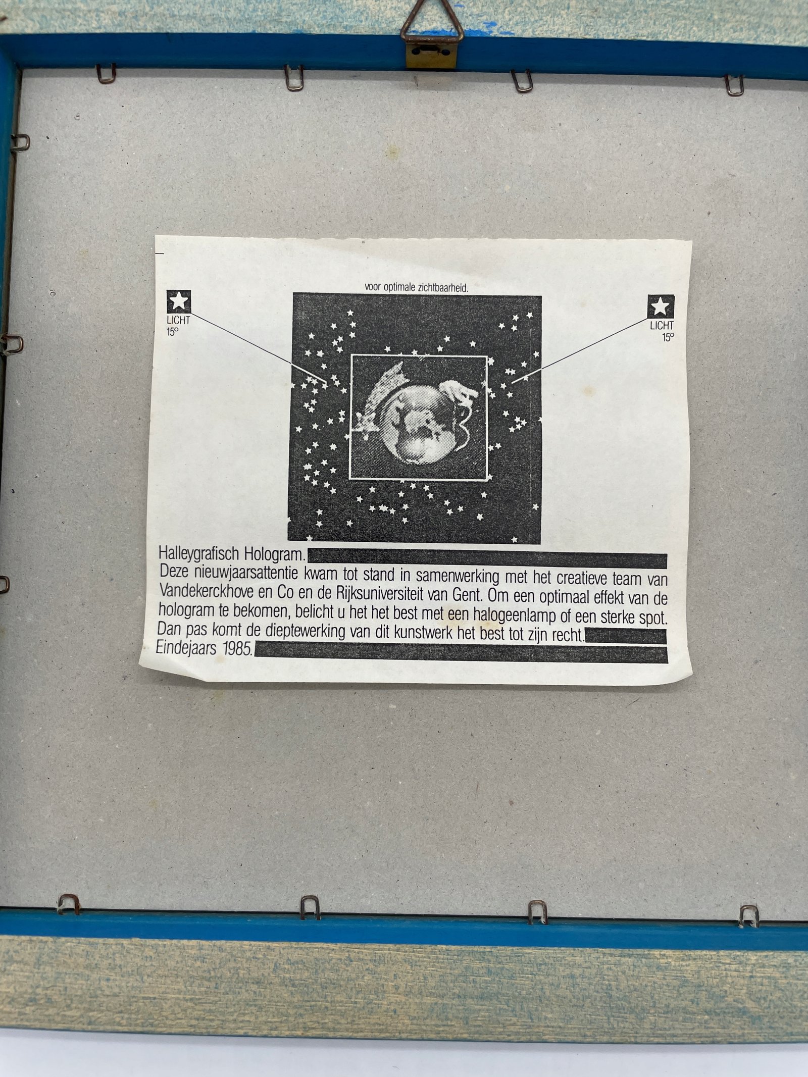 Rzadki przedmiot kolekcjonerski – hologram “Hallo Halley”, stworzony w 1985 roku przez firme Vandekerckhove & Co we wspolpracy z Uniwersytetem Panstwowym w Gandawie (Rijksuniversiteit Gent). Wydanie zostalo przygotowane z okazji powrotu komety Halleya w latach 1985/86. Zachowana oryginalna instrukcja i oprawa. Rama w kolorze niebieskim.